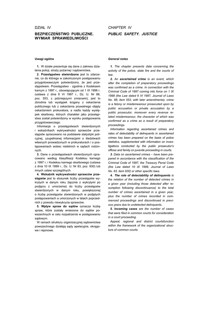 DZIAŁ IV CHAPTER IV BEZPIECZEŃSTWO PUBLICZNE. WYMIAR SPRAWIEDLIWOŚCI PUBLIC SAFETY. JUSTICE Uwagi ogólne General notes 1. W dziale prezentuje się dane z zakresu działania policji, straży pożarnej i sądownictwa. 2. Przestępstwo stwierdzone jest to zdarzenie, co do którego w zakończonym postępowaniu przygotowawczym potwierdzono, że jest przestępstwem. Przestępstwo - zgodnie z Kodeksem karnym z 1997 r., obowiązującym od 1 IX 1998 r. (ustawa z dnia 6 VI 1997 r., Dz. U. Nr 88, poz. 553, z późniejszymi zmianami), jest to zbrodnia lub występek ścigany z oskarżenia publicznego lub z oskarżenia prywatnego objęty oskarżeniem prokuratora, a nadto każdy występek skarbowy, których charakter jako przestępstwa został potwierdzony w wyniku postępowania przygotowawczego. Informacje o przestępstwach stwierdzonych i wskaźnikach wykrywalności sprawców przestępstw opracowano na podstawie statystyki policyjnej, uzupełnianej informacjami o śledztwach własnych prowadzonych w prokuraturach i o postępowaniach wobec nieletnich w sądach rodzinnych. 3. Dane o przestępstwach stwierdzonych opracowano według klasyfikacji Kodeksu karnego z 1997 r. i Kodeksu karnego skarbowego (ustawa z dnia 10 IX 1999 r., Dz. U. Nr 83, poz. 930) lub innych ustaw szczególnych. 4. Wskaźnik wykrywalności sprawców przestępstw jest to stosunek liczby przestępstw wykrytych w danym roku (łącznie z wykrytymi po podjęciu z umorzenia) do liczby przestępstw stwierdzonych w danym roku, powiększonej o liczbę przestępstw stwierdzonych w podjętych postępowaniach a umorzonych w latach poprzednich z powodu niewykrycia sprawców. 5. Wpływ spraw do sądów oznacza liczbę spraw, które zostały wniesione do sądów powszechnych w celu rozpatrzenia w postępowaniu sądowym. W ramach struktury organizacyjnej sądownictwa powszechnego działają sądy apelacyjne, okręgowe i rejonowe. 1. The chapter presents data concerning the activity of the police, state fire and the courts of law. 2. An ascertained crime is an event, which after the completion of preparatory proceedings was confirmed as a crime. In connection with the Criminal Code of 1997 coming into force on 1 IX 1998 (the Law dated 6 VI 1997, Journal of Laws No. 88, item 553, with later amendments), crime is a felony or misdemeanour prosecuted upon by public accusation or private accusation by a public prosecutor, moreover every revenue related misdemeanour, the character of which was confirmed as a crime as a result of preparatory proceedings. Information regarding ascertained crimes and rates of detectability of delinquents in ascertained crimes has been prepared on the basis of police statistics, supplemented with information on investigations conducted by the public prosecutor‘s offices and family on juvenile proceeding in courts. 3. Data on ascertained crimes – have been prepared in accordance with the classification of the Criminal Code of 1997, the Treasury Penal Code (the Law dated 10 IX 1999, Journal of Laws No. 83, item 930) or other specific laws. 4. The rate of detectability of delinquents is the relation of the number of detected crimes in a given year (including those detected after resumption following discontinuance) to the total number of crimes ascertained in a given year, plus the number of crimes recorded in commenced proceedings and discontinued in previous years due to undetected delinquents. 5. Incoming cases are the number of cases that were filed in common courts for consideration in a court proceeding. Appeal, regional and district courtsfunction within the framework of the organizational structure of common courts. PUBLIC SAFETY - JUSTICE 6. Sądy apelacyjne rozpatrują sprawy odwoławcze od orzeczeń wydanych w pierwszej instancji przez sądy okręgowe. Do sądu apelacyjnego wpływają sprawy z kilku sądów okręgowych (od 3 do 7), objętych obszarem jego właściwości. 7. Sądy okręgowe rozpatrują w pierwszej instancji sprawy, gdy ustawa tak stanowi oraz w drugiej instancji odwołania od orzeczeń sądów rejonowych. Nie wszystkie sądy okręgowe rozpoznają sprawy gospodarcze oraz z zakresu prawa pracy i ubezpieczeń społecznych. 8. Sprawą załatwioną jest sprawa, w której wydano wyrok, postanowienie lub w której postępowanie zawieszono lub połączono ją z inną sprawą albo przekazano do innego rodzaju sądu lub organu. Zgodnie ze zmianami w zasadach rejestracji spraw w sądach, wprowadzonymi zarządzeniem Ministra Sprawiedliwości z dnia 12 XII 2003 r. w sprawie organizacji i zakresu działania sekretariatów sądowych oraz innych działów administracji sądowej (Dz. Urz. Ministerstwa Sprawiedliwości z dnia 31 XII 2003 r., z późniejszymi zmianami) sprawy zawieszone od dnia 1 I 2004 r. nie są już traktowane jako załatwione. W przypadku występowania w sprawie kilku osób uważa się ją za załatwioną, gdy dotyczy to wszystkich osób. Liczba spraw do załatwienia jest sumą spraw niezałatwionych w latach poprzednich i spraw, które wpłynęły w danym roku. 9. Sprawy rodzinne obejmują postępowanie: 1) z zakresu prawa rodzinnego i opiekuńczego; 2) dotyczące nałożenia na alkoholików obowiązku poddania się leczeniu odwykowemu; 3) wobec nieletnich w zakresie: a) zapobiegania i zwalczania demoralizacji w stosunku do osób, które nie ukończyły 18 lat, b) postępowania w sprawach o czyny karalne w stosunku do osób, które dopuściły się takiego czynu po ukończeniu 13 lat, ale nie ukończyły 17 lat, c) wykonywania środków wychowawczych lub poprawczych w stosunku do osób, względem których środki te zostały orzeczone, nie dłużej jednak niż do ukończenia przez te osoby 21 lat; 4) w związku z leczeniem narkomanów; 5) w sprawie kontroli umieszczania w zakładach lecznictwa psychiatrycznego. Tryb postępowania wobec nieletnich przed sądem (pkt. 3a i 3b) wynika z ustawy z dnia 26 X 1982 r. o postępowaniu w sprawach nieletnich (jednolity tekst, Dz. U 2002 Nr 11, poz. 109,