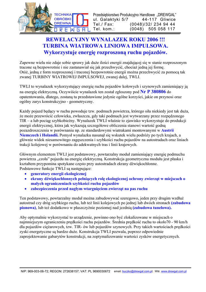 Przedsiębiorstwo Produkcyjno Handlowe „DREWGAL” ul. Galaktyki 5/7 44-117 Gliwice Tel./ Fax: (0048)/32/ 234 94 44 Tel. kom.: (0048) 505 058 117 REWELACYJNY WYNALAZEK ROKU 2006 !!! TURBINA WIATROWA LINIOWA IMPULSOWA. Wykorzystuje energię rozproszoną ruchu pojazdów. Zapewne wielu nie zdaje sobie sprawy jak duże ilości energii znajdującej się w stanie rozproszonym tracone są bezpowrotnie i nie zastanawiał się jak przechwycić, chociaż jedną jej formę. Otóż, jedną z form rozproszonej i traconej bezpowrotnie energii można przechwycić za pomocą tak zwanej TURBINY WIATROWEJ IMPULSOWEJ, zwanej dalej, TWLI. TWLI to wynalazek wykorzystujący energię ruchu pojazdów kołowych i szynowych zamieniający ją na energię elektryczną. Oczywiście wynalazek ten został zgłoszony pod Nr P 380806 do opatentowania, dlatego, zostaną tu przedstawione jedynie ogólne korzyści, jakie on przynosi oraz ogólny zarys konstrukcyjno - geometryczny. Każdy pojazd będący w ruchu powoduje tzw. podmuch powietrza, którego siła niekiedy jest tak duża, że może przewrócić człowieka, zwłaszcza, gdy taki podmuch jest wytwarzany przez rozpędzonego TIR – a lub pociąg szybkobieżny. Wynalazek TWLI właśnie to zjawisko wykorzystuje do produkcji energii elektrycznej, która jak wykazują szczegółowe obliczenia stanowi wartość godną pozazdroszczenia w porównaniu np. ze standardowymi wiatrakami montowanymi w Austrii Niemczech i Holandii. Pomysł wynalazku nasunął się wskutek wielu podróży po tych krajach, a głównie widok niesamowitego zagęszczenia i szybkości ruchu pojazdów na autostradach oraz liniach trakcji kolejowej w porównaniu do adekwatnych tras i linii krajowych. Głównym elementem TWLI jest podstawowy, powtarzalny moduł zamieniający energię podmuchu powietrza „czoła” pojazdu na energię elektryczną. Konstrukcja geometryczna modułu jest płaska i kształtem przypomina spotykane często przy autostradach ekrany dźwiękochłonne. Podstawowe funkcje TWLI są następujące: • generatory energii ekologicznej • ekrany dźwiękochłonnych pełniących rolę ekologicznej ochrony zwierząt w miejscach o małych ograniczeniach szybkości ruchu pojazdów • zabezpieczenia przed nagłym wtargnięciem zwierząt na pas ruchu Ten podstawowy, powtarzalny moduł można zabudowywać szeregowo, jeden przy drugim wzdłuż autostrad czy dróg szybkiego ruchu, lub też linii kolejowych po jednej lub dwóch stronach (zabudowa pionowa), lub też dodatkowo w płaszczyźnie poziomej nad jezdnią (zabudowa tunelowa). Aby optymalnie wykorzystać to urządzenie, powinno ono być zlokalizowane w miejscach o najmniejszym ograniczeniu prędkości ruchu pojazdów. Średnia prędkość ruchu to około70 - 90 km/h dla pojazdów ciężarowych, tzw. TIR- ów lub pojazdów szynowych. Przy takich wartościach prędkości zyski energetyczne są bardzo duże. Konstrukcja TWLI pozwala, poprzez odpowiednie zaprojektowanie gabarytów konstrukcji, na zoptymalizowanie wartości zysków energetycznych. NIP: 969-003-06-72; REGON: 272638157; VAT: PL 9690030672 email: [email protected]; Witr. www.drewgal.com.pl Przedsiębiorstwo Produkcyjno Handlowe „DREWGAL” ul. Galaktyki 5/7 44-117 Gliwice Tel./ Fax: (0048)/32/ 234 94 44 Tel. kom.: (0048) 505 058 117 Przejdźmy dalej do liczb i porównania wynalazku z tradycyjnymi wiatrakami. Wiatraki muszą być stosunkowo rzadko usytuowane w terenie i do tego w takich miejscach gdzie występują wiatry o odpowiednio dużych prędkościach potrafiących je wprawić w ruch. Koszt budowy takiego wiatraka wynosi około 1,0 miliona Euro a jego zysk energetyczny stanowi około 6,0 MW energii elektrycznej. Ponadto względy technologiczno - urbanistyczne ograniczają gęstość ich zabudowy. Wiatraków nie można stosować w ilościach masowych na powierzchni ziemi. Ze względów bezpieczeństwa, wiatraki muszą być lokalizowane z dala od aglomeracji miejskich. Wynalazek TWLI może być stosowany w ilościach masowych wzdłuż autostrad i linii kolejowych. Teoretyczny, z uwzględnieniem sprawności urządzenia zysk energetyczny podstawowego modułu TWLI wynosi około 0,5 MW. Zabudowanie odcinka długości 1,0 km wymaga zastosowania około 100 sztuk modułów podstawowych. w zabudowie jednostronnej Daje to sumaryczny zysk energetyczny wielkości około 50,0 MW/ km dla jednej strony zabudowy. Koszt zabudowy 1,0 kM odcinka zabudowy jednostronnej wynosi szacunkowo około 100 x 5.000 EUR = 500.000 EUR. Oczywiście należy tu założyć, że nie można zabudować całej długości autostrady czy linii kolejowej jednostronnie czy obustronnie, co byłoby technologicznie możliwe, lecz nieracjonalne. Zabudowa może być prowadzona w dowolny sposób, szczelnie lub z przerwami, w zależności od potrzeb technologicznych lub administracyjnych – rozstaw osiowy dowolny. Podstawowa długość modularna podstawowego TWLI wynosi około 10,0 m. Obliczenie jednostkowych wskaźników inwestycyjnych dla dwóch wariantów: Wiatrak – TWLI. WIATRAK o mocy 6,0 MW Oznaczenia: Nakłady Inwestycyjne Całkowite Wiatraka Nakłady Inwestycyjne Jednostkowe Wiatraka Zysk Energetyczny Wiatraka NIJW = NICW / ZEW = 1,0 MLN (EUR) / 6,0 MW = NICW NIJW ZEW 0,17 MLN / MW TWLI o mocy 0,5 MW / km - jednostronna Oznaczenia: Nakłady Inwestycyjne Całkowite Turbiny Nakłady Inwestycyjne Jednostkowe Turbiny Zysk Energetyczny Turbiny NIJW = NICT / ZET = 0,5 MLN (EUR) / 50,0 MW = NICT NIJT ZET 0,01 MLN / MW Z powyższych wyliczeń łatwo obliczyć, że NIJW są 17 x większe od NIJT dla pozyskania 1,0 MW mocy elektrycznej energii ekologicznej, wobec czego stosowanie TWLI okazuje się znacznie bardziej opłacalne niż stosowanie tradycyjnych Wiatraków. Zwłaszcza, że urządzenie, TWLI nadaje się wyjątkowo do instalowania w dużej sieci, dzięki czemu można uzyskać bardzo duże zyski energetyczne, niekiedy przewyższające możliwości stacjonarnych elektrowni. NIP: 969-003-06-72; REGON: 272638157; VA