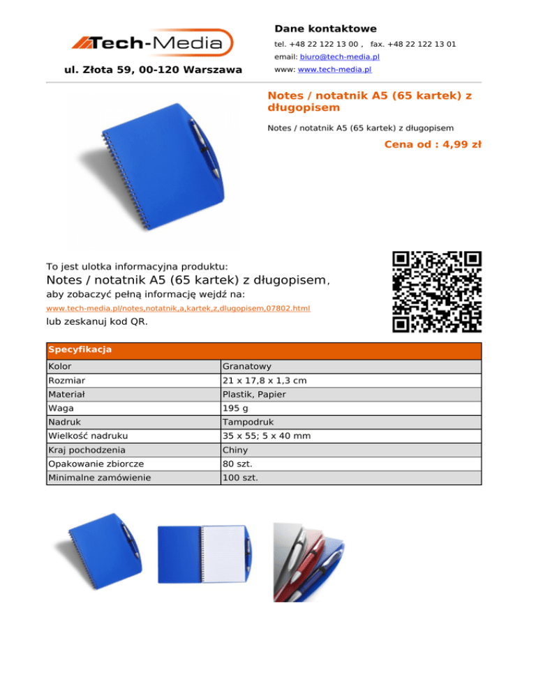 Dane kontaktowe tel. +48 22 122 13 00 , fax. +48 22 122 13 01 email: [email protected] ul. Złota 59, 00-120 Warszawa www: www.tech-media.pl Notes / notatnik A5 (65 kartek) z długopisem Notes / notatnik A5 (65 kartek) z długopisem Cena od : 4,99 zł To jest ulotka informacyjna produktu: Notes / notatnik A5 (65 kartek) z długopisem , aby zobaczyć pełną informację wejdź na: www.tech-media.pl/notes,notatnik,a,kartek,z,dlugopisem,07802.html lub zeskanuj kod QR. Specyfikacja Kolor Granatowy Rozmiar 21 x 17,8 x 1,3 cm Materiał Plastik, Papier Waga 195 g Nadruk Tampodruk Wielkość nadruku 35 x 55; 5 x 40 mm Kraj pochodzenia Chiny Opakowanie zbiorcze 80 szt. Minimalne zamówienie 100 szt.
