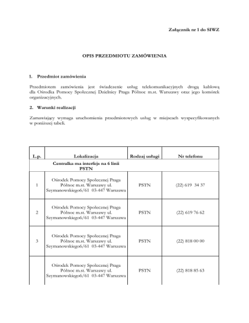 Załącznik nr 1 do SIWZ OPIS PRZEDMIOTU ZAMÓWIENIA 1. Przedmiot zamówienia Przedmiotem zamówienia jest świadczenie usług telekomunikacyjnych drogą kablową dla Ośrodka Pomocy Społecznej Dzielnicy Praga Północ m.st. Warszawy oraz jego komórek organizacyjnych. 2. Warunki realizacji Zamawiający wymaga uruchomienia przedmiotowych usług w miejscach wyspecyfikowanych w poniŜszej tabeli. L.p. Lokalizacja Rodzaj usługi Nr telefonu Centralka ma interfejs na 6 linii PSTN 1 Ośrodek Pomocy Społecznej Praga Północ m.st. Warszawy ul. Szymanowskiego6/61 03-447 Warszawa PSTN (22) 619 34 37 2 Ośrodek Pomocy Społecznej Praga Północ m.st. Warszawy ul. Szymanowskiego6/61 03-447 Warszawa PSTN (22) 619 76 62 3 Ośrodek Pomocy Społecznej Praga Północ m.st. Warszawy ul. Szymanowskiego6/61 03-447 Warszawa PSTN (22) 818 00 00 Ośrodek Pomocy Społecznej Praga Północ m.st. Warszawy ul. Szymanowskiego6/61 03-447 Warszawa PSTN (22) 818 85 63 Centralka ma interfejs na 6 linii PSTN 5 Ośrodek Pomocy Społecznej Dzielnicy Praga Północ m.st. Warszawy Filia nr I, ul. Groszkowskiego 5, 03-475 Warszawa PSTN (22) 619 33 95 6 Ośrodek Pomocy Społecznej Dzielnicy Praga Północ m.st. Warszawy Filia nr I, ul. Groszkowskiego 5, 03-475 Warszawa PSTN (22) 618 22 61 7 Ośrodek Pomocy Społecznej Dzielnicy Praga Północ m.st. Warszawy Filia nr I, ul. Groszkowskiego 5, 03-475 Warszawa PSTN (22) 670 03 85 8 Ośrodek Pomocy Społecznej Dzielnicy Praga Północ m.st. Warszawy Filia nr I, ul. Groszkowskiego 5, 03-475 Warszawa PSTN (22) 670 02 49 9 Ośrodek Pomocy Społecznej Dzielnicy Praga Północ m.st. Warszawy Filia nr I, ul. Groszkowskiego 5, 03-475 Warszawa PSTN (22) 619 22 69 Centralka ma interfejs na 4 linii PSTN i 2 linie ISDN BRI 10 Ośrodek Pomocy Społecznej Dzielnicy Praga Północ m.st. Warszawy Filia nr II, ul. Brechta 15/31 03-477 Warszawa PSTN (22) 618 77 59 11 Ośrodek Pomocy Społecznej Dzielnicy Praga Północ m.st. Warszawy Filia nr II, ul. Brechta 15/31 03-477 Warszawa PSTN (22) 670 18 99 12 Ośrodek Pomocy Społecznej Dzielnicy Praga Północ m.st. Warszawy Filia nr II, ul. Brechta 15/31 03-477 Warszawa PSTN (22) 670 10 71 13 Ośrodek Pomocy Społecznej Dzielnicy Praga Północ m.st. Warszawy Filia nr II, ul. Brechta 15/31 03-477 Warszawa PSTN (22) 619 56 77 Nie zainstalowano centralki 14 Ośrodek Pomocy Społecznej Praga Północ m.st. Warszawy Dom Matki i Dziecka ul. Szymanowskiego 4a, 03-477 Warszawa PSTN (22) 619 32 65 15 Ośrodek Pomocy Społecznej Praga Północ m.st. Warszawy Dom Dziennego Pobytu ul. Brzeska 4 03-735 Warszawa PSTN (22) 619 55 09 16 Ośrodek Pomocy Społecznej Praga Północ m.st. Warszawy Klub Złotego Wieku ul. Jagielońska 56 , 03-468 Warszawa PSTN (22) 818 64 02 Po uruchomieniu usługi, Zamawiający wymaga sporządzenia wykazu z dokładną datą uruchomienia usługi na poszczególnych numerach telefonów. Koszty związane z przeniesieniem oraz aktywacją numerów abonenckich do własnej sieci, jak równieŜ koszty związane z przygotowaniem dokumentacji niezbędnej do wykonania tego procesu oraz uzyskaniem niezbędnych pozwoleń poniesie Wykonawca. Oferowane usługi łączności telefonicznej powinny spełniać następujące warunki: 1. Świadczone usługi telefoniczne rozliczane będą sekundowo–bez dodatkowych opłat za inicjację połączeń, przy czym naliczanie czasu połączeń odbywać się będzie wyłącznie do momentu rozłączenia rozmowy przez którąkolwiek ze stron. 2. Do rozliczeń sekundowych usług stosowane będą stawki za minutę połączenia w zaleŜności od typu połączenia, określone w formularzu ofertowym stanowiącym załącznik nr 5 do niniejszej SIWZ. 3. Zamawiający nie będzie obciąŜany opłatami inicjacyjnymi przy realizowaniu połączeń. 4. Wykonawca dostarczy co miesiąc Zamawiającemu szczegółowy wykaz wykonanych połączeń telefonicznych z kaŜdej linii telefonicznej. 5. Wykonawca w trakcie trwania umowy zapewni pomoc techniczną związaną ze świadczeniem usług telekomunikacyjnych (usuwanie awarii i usterek) oraz zobowiązuje się do niezwłocznego przystąpienia do usuwania zgłoszonych przez Zamawiającego awarii i usterek. Usunięcie awarii nastąpi do 24 godzin od chwili telefonicznego zgłoszenia przez Zamawiającego na nr tel.: ………………. lub drogą mailową ……………………@.......... we wszystkie dni robocze.. 6. W związku z tym, Ŝe Zamawiający wymaga dostarczenia usług, które mogą być świadczone przez róŜnych operatorów, Wykonawca powinien przewidzieć potrzebę zawarcia umów z innymi operatorami i przedstawi ofertę na całość wymaganych usług. Wszelkie rozliczenia między operatorskie Wykonawca musi uregulować we własnym zakresie. 7. Wykonawca po podpisaniu umowy niezwłocznie wystąpi do obecnego operatora z odpowiednim wnioskiem o przeniesienie numerów. 8. Kara umowna z tytułu niedotrzymania z raŜącej winy Wykonawcy terminu rozpoczęcia świadczenia usług telekomunikacyjnych, wynosić będzie 10,00 zł za minutę odnośnie KAZDEGO telefonu w danej lokalizacji. 9. Wykonawca wykona usługę zablokowania połączeń wychodzących do usług o podwyŜszonej opłacie dla wszystkich linii telefonicznych (0-300…, 0-400…, 0-70…, 0-80…, 0-64…, 0-207…, 0-208…, 0-39…). 10. Wykonawca zapewni realizację bezpłatnych połączeń pomiędzy Ośrodkiem Pomocy Społecznej Pragi Północ m.st. Warszawy a jego komórkami organizacyjnymi, co stanowi ok. 30% połączeń. 11. Zabezpieczenie całości materiałów i urządzeń niezbędnych do wykonania przedmiotu umowy, przy czym koszty ewentualnych materiałów, urządzeń oraz koszty związane z przyłączeniem Zamawiającego do sieci telefonicznej operatora pokrywa Wykonawca. 12. Sporządzanie i przekazywanie zestawień zrealizowanych usług telefonicznych odrębnych dla OPS i jego komórek organizacyjnych, z uwzględnieniem miesięcznego okresu rozliczeniowego na koszt Wykonawcy, co będzie stanowić załączni