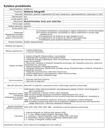 Sylabus przedmiotu Kod przedmiotu: A-M03-II-4 Przedmiot: Historia fotografii Kierunek: Malarstwo, jednolite magisterskie [10 sem], stacjonarny, ogólnoakademicki, rozpoczęty w: 2014 Rok/Semestr: II/4 Liczba godzin: 30,0 Nauczyciel: Nawrot-Trzcińska, Irena, prof. sztuk film. Forma zajęć: wykład Rodzaj zaliczenia: egzamin Punkty ECTS: 2,0 15,0 Godziny kontaktowe z prowadzącym zajęcia realizowane w formie konsultacji 30,0 Godziny kontaktowe z prowadzącym zajęcia realizowane w formie zajęć dydaktycznych 0 Przygotowanie się studenta do zajęć dydaktycznych 15,0 Przygotowanie się studenta do zaliczeń i/lub egzaminów 0 Studiowanie przez studenta literatury przedmiotu Godzinowe ekwiwalenty punktów ECTS (łączna liczba godzin w semestrze): Poziom trudności: średnio zaawansowany Wstępne wymagania: Metody dydaktyczne: • wykład problemowy • z użyciem komputera 1. Historia fotografii (historia odkryć i wynalazków). 2. Fotografia jako narzędzie do poznawania świata. 3. Fotografia budująca obiektywny obraz rzeczywistości i traktowana jako tworzywo kreujące nową rzeczywistość. 4. Wizerunek człowieka w fotografii (fotografia portretowa, akt, fotografia erotyczna, medyczna, antropologiczna, policyjna). Zakres tematów: 5. Historia reportażu i fotografia prasowa. 6. Fotografia reklamowa. Współczesne strategie obrazu fotograficznego w reklamie. Fotografia a propaganda wizualna. 7. Fotografia inscenizowana i dokument artystyczny. 8. Sztuka współczesna z zastosowaniem zapisu mechanicznego. 9. Prawda i fałsz obrazu fotograficznego. Forma oceniania: • końcowe zaliczenie pisemne • obecność na zajęciach Warunki zaliczenia: obecność na zajęciach, pozytywna ocena z końcowego egzaminu pisemnego Modułowe efekty kształcenia realizowane w ramach przedmiotu: 01W Student, który zaliczył przedmiot, ma podstawową wiedzę z historii i teorii fotografii w ujęciu rozwojowym 02W zna publikacje z zakresu historii i teorii fotografii 03W zna terminologię związaną z technikami fotograficznymi XIX i XX w. 04W rozróżnia gatunki fotograficzne oraz rozumie przemiany technologiczne i rozwojowe w fotografii 05W zna i rozumie konteksty społeczne, polityczne i obyczajowe z historii fotografii 06W w praktyce artystycznej opiera się na znajomości refleksji teoretycznej oraz bierze pod uwagę historyczne i kulturowe odniesienia fotografii Sposób weryfikacji 01W, 02W, 03W, 04W, 05W, 06W - weryfikacja w formie egzaminu pisemnego. efektów kształcenia: 1. 2. Literatura: 3. 4. 5. Historia fotografii od 1839 do dziś, Kolonia 2010. A. H. Hoy, Wielka księga fotografii, Warszawa 2006. L. Lechowicz, Historia fotografii. Część 1/1839-1939, Łódź 2012. N. Rosenblum, Historia fotografii światowej, Bielsko-Biała 2005. S. Sontag, O fotografii, Kraków 2009. Dodatkowe informacje: [email protected]