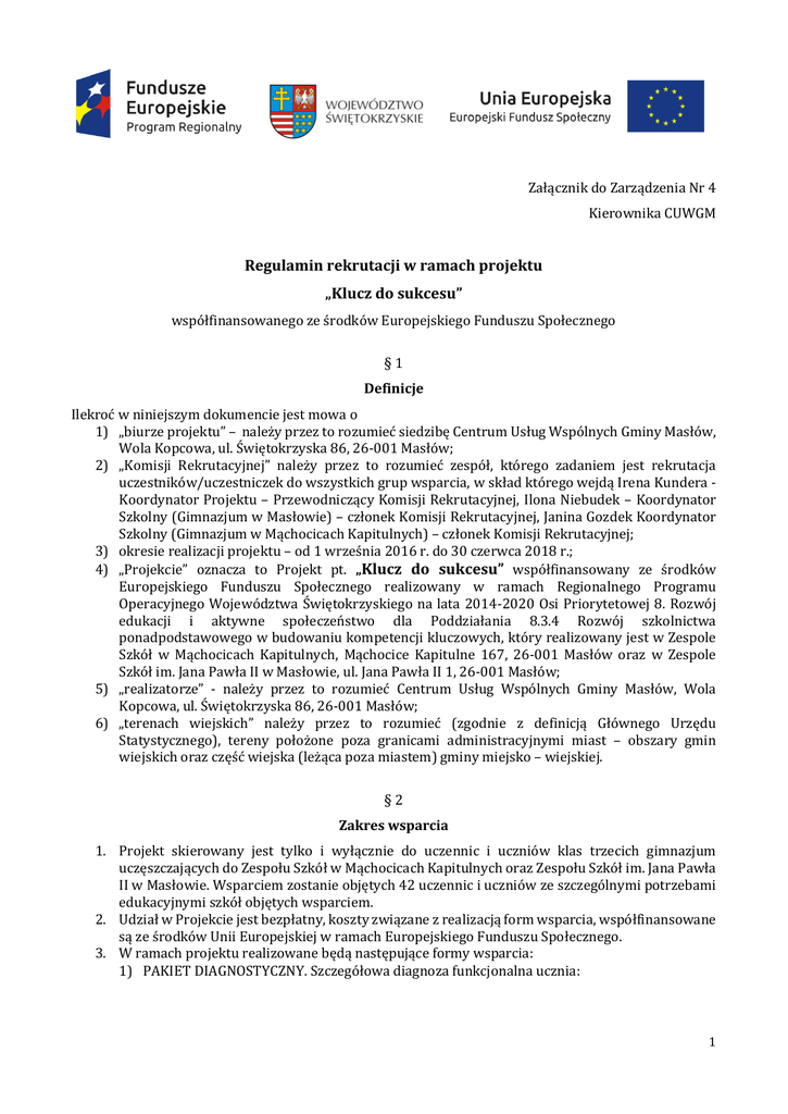 Załącznik do Zarządzenia Nr 4 Kierownika CUWGM Regulamin rekrutacji w ramach projektu „Klucz do sukcesu” współfinansowanego ze środków Europejskiego Funduszu Społecznego §1 Definicje Ilekroć w niniejszym dokumencie jest mowa o 1) „biurze projektu” – należy przez to rozumieć siedzibę Centrum Usług Wspólnych Gminy Masłów, Wola Kopcowa, ul. Świętokrzyska 86, 26-001 Masłów; 2) „Komisji Rekrutacyjnej” należy przez to rozumieć zespół, którego zadaniem jest rekrutacja uczestników/uczestniczek do wszystkich grup wsparcia, w skład którego wejdą Irena Kundera Koordynator Projektu – Przewodniczący Komisji Rekrutacyjnej, Ilona Niebudek – Koordynator Szkolny (Gimnazjum w Masłowie) – członek Komisji Rekrutacyjnej, Janina Gozdek Koordynator Szkolny (Gimnazjum w Mąchocicach Kapitulnych) – członek Komisji Rekrutacyjnej; 3) okresie realizacji projektu – od 1 września 2016 r. do 30 czerwca 2018 r.; 4) „Projekcie” oznacza to Projekt pt. „Klucz do sukcesu” współfinansowany ze środków Europejskiego Funduszu Społecznego realizowany w ramach Regionalnego Programu Operacyjnego Województwa Świętokrzyskiego na lata 2014-2020 Osi Priorytetowej 8. Rozwój edukacji i aktywne społeczeństwo dla Poddziałania 8.3.4 Rozwój szkolnictwa ponadpodstawowego w budowaniu kompetencji kluczowych, który realizowany jest w Zespole Szkół w Mąchocicach Kapitulnych, Mąchocice Kapitulne 167, 26-001 Masłów oraz w Zespole Szkół im. Jana Pawła II w Masłowie, ul. Jana Pawła II 1, 26-001 Masłów; 5) „realizatorze” - należy przez to rozumieć Centrum Usług Wspólnych Gminy Masłów, Wola Kopcowa, ul. Świętokrzyska 86, 26-001 Masłów; 6) „terenach wiejskich” należy przez to rozumieć (zgodnie z definicją Głównego Urzędu Statystycznego), tereny położone poza granicami administracyjnymi miast – obszary gmin wiejskich oraz część wiejska (leżąca poza miastem) gminy miejsko – wiejskiej. §2 Zakres wsparcia 1. Projekt skierowany jest tylko i wyłącznie do uczennic i uczniów klas trzecich gimnazjum uczęszczających do Zespołu Szkół w Mąchocicach Kapitulnych oraz Zespołu Szkół im. Jana Pawła II w Masłowie. Wsparciem zostanie objętych 42 uczennic i uczniów ze szczególnymi potrzebami edukacyjnymi szkół objętych wsparciem. 2. Udział w Projekcie jest bezpłatny, koszty związane z realizacją form wsparcia, współfinansowane są ze środków Unii Europejskiej w ramach Europejskiego Funduszu Społecznego. 3. W ramach projektu realizowane będą następujące formy wsparcia: 1) PAKIET DIAGNOSTYCZNY. Szczegółowa diagnoza funkcjonalna ucznia: 1 2) 3) 4) 5) a. Diagnoza, w tym preorientacja zawodowa, zostanie dokonana przez doradcę edukacyjno-zawodowego we współpracy z pedagogiem, nauczycielami i rodzicami (śr. 2,5 godz./uczeń); PAKIET WIEDZA. ŚCIEŻKA KOMPENSACYJNA – ścieżka zajęć wyrównawczych w oparciu o stwierdzone deficyty i potrzeby, dla uczniów osiągających słabe wyniki w nauce. Zajęcia te zorientowane są na poprawę osiąganych wyników nauczania poprzez zindywidualizowane metody podejścia do ucznia i nadrabianie zaległości: a. Zespół Szkół w Mąchocicach Kapitulnych Matematyka/przyroda - 2 grupy zajęć, łącznie 15 godzin zajęć dydaktycznych dla każdej grupy w semestrze; język angielski - 1 grupa zajęć, łącznie 15 godzin zajęć dydaktycznych dla grupy w semestrze. b. Zespół Szkół im. Jana Pawła II w Masłowie matematyka -1 grupa zajęć, łącznie 15 godzin zajęć dydaktycznych dla grupy w semestrze; język angielski - 1 grupa zajęć, łącznie 15 godzin zajęć dydaktycznych dla grupy w semestrze. PAKIET WIEDZA. ŚCIEŻKA ROZWOJOWA – dla ucznia zdolnego realizowane są zajęcia kształtujące kluczowe kompetencje na rynku pracy w dwóch tematycznych blokach: a. Zespół Szkół w Mąchocicach Kapitulnych blok matematyczno-przyrodniczy - 1 grupa zajęć, łącznie 15 godzin zajęć dydaktycznych dla grupy w semestrze; blok językowy (język angielski) - 1 grupa zajęć, łącznie 15 godzin zajęć dydaktycznych dla grupy w semestrze. b. Zespół Szkół im. Jana Pawła II w Masłowie blok matematyczno-przyrodniczy - 1 grupa zajęć, łącznie 15 godzin zajęć dydaktycznych dla grupy w semestrze; blok językowy (język angielski) - 1 grupa zajęć, łącznie 15 godzin zajęć dydaktycznych dla grupy w semestrze. PAKIET INSPIRACJE - zestaw instrumentów wspierających rozwój młodzieży, zarówno napotykających na problemy w edukacji i życiu codziennym, z niskim wynikami nauczania, jak również dla osób zdolnych ze względu na potrzebę ukierunkowania ich aktywności (ścieżka kompensacyjna i ścieżka rozwojowa): a. Indywidualne wsparcie według zdiagnozowanych potrzeb (śr. 14 godz./uczeń) wsparcie udzielane m.in. przez pedagoga, psychologa, logopedę, doradcę zawodowego przydzielone na podstawie diagnozy o której mowa w pkt 3 ppkt. 1 niniejszego paragrafu. PAKIET ROZWÓJ - Celem treningów ujętych w pakiecie jest zdobycie kluczowych kompetencji społ. i edukacyjnych niezbędnych do prawidłowego funkcjonowania w środowisku lokalnym, systemie edukacji i w przyszłości na rynku pracy, nabycie lub wzmocnienie umiejętności interpersonalnych, zainicjowanie zmiany w biernej postawie na rzecz postawy otwartości i współpracy, podniesienie samoświadomości oraz wyznaczenie sobie do osiągnięcia celów edukacyjnych i życiowych. Treningi będą realizowane w 4 grupach (1 grupa z Zespołu Szkół w Mąchocicach Kapitulnych oraz 1 grupa z Zespół Szkół im. Jana Pawła II w Masłowie w każdym roku szkolnym realizacji projektu): a. Trening dorosłości (20godzin) – dla uczniów w ścieżce kompensacyjnej i ścieżce rozwojowej. Bloki tematyczne treningu obejmują: Trening Kompetencji Społecznych (10godzin/ grupa); Trening Kompetencji Życiowych(10godzin/grupa). 2 b. Trening efektywnego uczenia się (20godzin): trening szybkiego czytania; trening techni