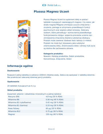 Plusssz Magnez Uczeń Plusssz Magnez Uczeń to suplement diety w postaci tabletek musujących zawierających magnez. Czy wiesz, jak działa magnez?Magnez zmniejsza uczucie zmęczenia i znużenia, pomaga w utrzymaniu prawidłowych funkcji psychicznych oraz wspiera układ nerwowy. Zalecany osobom, które potrzebują:• wzmocnienia prawidłowego funkcjonowania mózgu• wsparcia procesów uczenia się• zmniejszenia zmęczenia Zawiera substancję słodzącą. Produkt może zawierać śladowe ilości laktozy (z mleka). Produkt nie może być stosowany jako substytut zróżnicowanej diety. Zróżnicowana dieta i zdrowy tryb życia są istotne dla zachowania zdrowia. Kategorie produktu: Nowości, Katalog produktów, Dobór produktów, Koncentracja, Zmęczenie, Dzieci Informacje ogólne Dawkowanie Rozpuścić jedną tabletkę w szklance (200ml) chłodnej wody. Zaleca się spożywać 1 tabletkę dziennie. Nie przekraczać zalecanej dziennej porcji produktu. Opakowanie 20 tabletek musujących po 4,1 g Skład produktu Zawartość witamin i składników mineralnych w jednej tabletce Niacyna (EN) 4,8 mg (30 % RDA) Witamina B6 0,56 mg (40 % RDA) Witamina B2 (ryboflawina) 0,42 mg (30 % RDA) Witamina B1 (tiamina) 0,33 mg (30 % RDA) Kwas foliowy 60 μg (30 % RDA) Witamina B12 0,75 μg (30 % RDA) Magnez 150 mg (40 % RDA) Strona 1/1