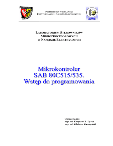 POLITECHNIKA WROCŁAWSKA INSTYTUT MASZYN I NAPĘDÓW ELEKTRYCZNYCH LABORATORIUM STEROWNIKÓW MIKROPROCESOROWYCH W NAPĘDZIE ELEKTRYCZNYM Opracowanie: mgr inż. Krzysztof P. Dyrcz mgr inż. Zdzisław Żarczyński LABORATORIUM STEROWNIKÓW MIKROPROCESOROWYCH W NAPĘDZIE ELEKTRYCZNYM 1. OPIS MIKROKONTROLERA Mikrokontroler SAB 80C515/535 oparty jest o jednoukładowy 8-bitowy mikroprocesor, wzorowany na układzie 8051 firmy INTEL. Litera C w oznaczeniu wskazuje na wykonanie mikroprocesora w technologii ACMOS. Mikroprocesory wykonane w tej technologii różnią się nieznacznie od produkowanych w technologii MYMOS (zmiany dotyczą głównie zakresu pracy rezonatora kwarcowego i wprowadzeniu w technologii ACMOS portu P6). Podstawowe właściwości procesora to: ∗ 256 bajtów wewnętrznej pamięci danych, ∗ 128 bajtów rejestrów specjalnych SFR, ∗ możliwość adresowania 64 kB zewnętrznej pamięci programu, ∗ możliwość adresowania 64 kB zewnętrznej pamięci danych, ∗ sześć 8-bitowych portów we/wy ( P0..P5), ∗ 8-bitowy port wejściowy dla wejść cyfrowych i analogowych (P6), ∗ trzy 16-bitowe zegary-liczniki, ∗ 8-bitowy programowalny przetwornik a/c, ∗ 16-bitowy układ typu “watchdog”, ∗ system przerwań (12 źródeł - 7 zewnętrznych i 5 wewnętrznych), ∗ 256-bajtowy stos, ∗ port szeregowy umożliwiający dwustronną komunikację, 2. ORGANIZACJA PAMIĘCI ⇒ PAMIĘĆ PROGRAMU Mikroprocesor SAB80C535 nie jest wyposażony w wewnętrzną pamięć ROM. Zatem należy korzystać z zewnętrznej pamięci programu, przy czym należy uaktywnić obsługę zewnętrznej pamięci programu przez podanie na linię procesora EA# potencjału niskiego (logicznego 0). Pamięć programu może być zapisana jedynie gdy pokrywa się z obszarem pamięci danych XDATA, przy czym obszar 03H do 93H w pamięci programu jest używany dla programów w przerwaniach. ⇒ PAMIĘĆ EPROM Pamięć EPROM z programem MONITOR ulokowana jest w obszarze pamięci CODE, przy czym adres początkowy zależy od wybranej konfiguracji: ∗ od 0000H dla konfiguracji EP007, ∗ od 8000H dla konfiguracji EP 009. Mikrokontroler SAB80C515/535... Strona 2 LABORATORIUM STEROWNIKÓW MIKROPROCESOROWYCH W NAPĘDZIE ELEKTRYCZNYM ⇒ PAMIĘĆ DANYCH Pamięć danych obejmuje obszar pamięci wewnętrznej RAM i obszar pamięci zewnętrznej RAM. Pamięć danych może być adresowana w sposób pośredni i bezpośredni. Do adresowania pośredniego zewnętrznej pamięci danych służy instrukcja MOVX, wykorzystująca 8 bitowe rejestry robocze R0 i R1 lub 16 bitowy rejestr DPTR. Do adresowania pośredniego pamięci programu w RAM służy instrukcja MOVC, wykorzystująca rejestr DPTR lub PC. FF FF Wewnêtrzna górna pamiêæ RAM FFFF Rejestry Specjalne SFR 128 B 80 80 Zewnêtrzna pamiêæ danych 7F Wewnêtrzna dolna pamiêæ RAM 128 B 0000 00 Pamiêæ danych Adresowanie poœrednie Adresowanie bezpoœrednie Rys.2.1. Mapa pamięci danych i rejestrów specjalnych SFR. Mikrokontroler SAB80C515/535... Strona 3 LABORATORIUM STEROWNIKÓW MIKROPROCESOROWYCH W NAPĘDZIE ELEKTRYCZNYM 127 ~ ~ 48 47 46 45 44 43 42 41 40 39 38 37 36 35 34 33 32 31 7FH OBSZAR PAMIĘCI BEZPOŚREDNIO ADRESOWANEJ REJESTROWO 7F 77 6F 67 5F 57 4F 47 3F 37 2F 27 1F 17 0F 07 7E 76 6E 66 5E 56 4E 46 3E 36 2E 26 1E 16 OE 06 7D 75 6D 65 5D 55 4D 45 3D 35 2D 25 1D 15 0D 05 7C 74 6C 64 5C 54 4C 44 3C 34 2C 24 1C 14 0C 04 7B 73 6B 63 5B 53 4B 43 3B 33 2B 23 1B 13 0B 03 7A 72 6A 62 5A 52 4A 42 3A 32 2A 22 1A 12 0A 02 79 71 69 61 59 51 49 41 39 31 29 21 19 11 09 01 ~ ~ 78 70 68 60 58 50 48 40 38 30 28 20 18 10 08 00 30H 2FH 2EH 2DH 2CH 2BH 2AH 29H 28H 27H 26H 25H 24H 23H 22H 21H 20H 1FH RB 3 18H 17H 24 23 RB 2 10H FH 16 11 RB 1 8 7 0 R7 R6 R5 R4 R3 R2 R1 R0 RB 0 8H 7H 6H 5H 4H 3H 2H 1H 0H Rys.2.2. Mapa dolnej partycji wewnętrznej pamięci danych. Mikrokontroler SAB80C515/535... Strona 4 LABORATORIUM STEROWNIKÓW MIKROPROCESOROWYCH W NAPĘDZIE ELEKTRYCZNYM ⇒ REJESTRY ROBOCZE Rejestry robocze zajmują przestrzeń adresową od 0 do 1FH w wewnętrznej pamięci RAM. Rejestry podzielone są na cztery banki (RB0..RB3) po 8 rejestrów od R0..R7, przy czym jednocześnie może być użyty tylko jeden bank rejestrów. Aktywny bank rejestrów wybierany jest w rejestrze PSW (bity PSW.3 i PSW.4). Rejestr PSW CY AC • • • • F0 RS1 RS0 OV adres 0D0H F1 P CY - Flaga przeniesienia, ustawiana lub zerowana sprzętowo, AC - Flaga przeniesienia pomocniczego, ustawiany lub zerowana sprzętowo, F0 - Flaga ogólnego przeznaczenia, zmieniana wyłącznie programowo, RS1, RS0 - Wybór aktywnego banku rejestrów: Tabela 1. Sterowanie bankiem rejestrów. RS1 0 0 1 1 RS0 0 1 0 1 Aktywny bank rejestrów Bank 0, obszar adresowy 00H-07H Bank 1, obszar adresowy 08H-0FH Bank 2, obszar adresowy 10H-17H Bank 3, obszar adresowy 18H-1FH • OV - Flaga przepełnienia, ustawiana lub zerowana sprzętowo, • F1 - Flaga ogólnego przeznaczenia, zmieniana wyłącznie programowo, • P - Flaga parzystości, ustawiana lub zerowana sprzętowo w każdym cyklu maszynowym. Wskazuje na liczbę jedynek w akumulatorze: P=0 - parzysta liczba jedynek, P=1 - nieparzysta liczba jedynek. ⇒ REJESTRY SPECJALNE SFR Rejestry specjalne SFR zajmują obszar pamięci w zakresie 80H..FFH w wewnętrznej pamięci RAM. Generalnie rejestry te adresowane są bajtowo i mają określone nazwy symboliczne i określone adresy, jednak niektóre bity rejestrów mogą być adresowane bitowo. Wyjątkiem od tej reguły jest rejestr akumulatora A (ACC), oraz bit (flaga) przeniesienia C (CY). Poniżej przedstawiono wykaz rejestrów specjalnych mikrokontrolera. Mikrokontroler SAB80C515/535... Strona 5 LABORATORIUM STEROWNIKÓW MIKROPROCESOROWYCH W NAPĘDZIE ELEKTRYCZNYM Tabela 2. Wykaz rejestrów specjalnych SFR Rejestr Nazwa Adres Stan po RESET# P0 SP DPL DPH PCON TCON TMOD TL0 TL1 TH0 TH1 P1 SCON SBUF P2 IEN0 IP0 P3 IEN1 IP1 IRCON CCEN CCL1 CCH1 CCL2 CCH2 CCL3 CCH3 T2CON CRCL CRCH TL2 TH2 PSW ADCON ADDAT DAPR Port 0 Wskaźnik stosu Mniej z