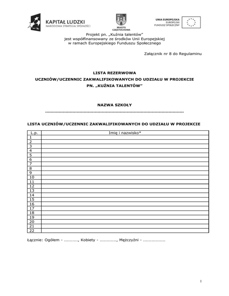 Projekt pn. „Kuźnia talentów” jest współfinansowany ze środków Unii Europejskiej w ramach Europejskiego Funduszu Społecznego Załącznik nr 8 do Regulaminu LISTA REZERWOWA UCZNIÓW/UCZENNIC ZAKWALIFIKOWANYCH DO UDZIAŁU W PROJEKCIE PN. „KUŹNIA TALENTÓW” NAZWA SZKOŁY ………........................................................................................... LISTA UCZNIÓW/UCZENNIC ZAKWALIFIKOWANYCH DO UDZIAŁU W PROJEKCIE L.p. 1 2 3 4 5 6 7 8 9 10 11 12 13 14 15 16 17 18 19 20 21 22 Imię i nazwisko* Łącznie: Ogółem - .........., Kobiety - ............, Mężczyźni - ................ 1 Projekt pn. „Kuźnia talentów” jest współfinansowany ze środków Unii Europejskiej w ramach Europejskiego Funduszu Społecznego LISTA UCZNIÓW/UCZENNIC ZAKWALIFIKOWANYCH DO POSZCZEGÓLNYCH RODZAJÓW ZAJĘĆ 1. DORADZTWO ZAWODOWE I WSPARCIE PSYCHOLOGICZNOPEDAGOGICZNE Doradztwo zawodowe – konsultacje indywidualne dla uczniów/uczennic gimnazjów L.p. Imię i nazwisko* Wsparcie psychologiczno-pedagogiczne L.p. Imię i nazwisko* Trening pamięci L.p. Imię i nazwisko* 2. WARSZTATY HUMANISTYCZNE I JĘZYKOWE WARSZTATY DZIENNIKARSKIE L.p. Imię i nazwisko* WARSZTATY LITERACKIE L.p. Imię i nazwisko* 2 Projekt pn. „Kuźnia talentów” jest współfinansowany ze środków Unii Europejskiej w ramach Europejskiego Funduszu Społecznego WARSZTATY HISTORYCZNE L.p. Imię i nazwisko* JĘZYK ANGIELSKI L.p. Imię i nazwisko* JĘZYK NIEMIECKI L.p. Imię i nazwisko* JĘZYK ROSYJSKI L.p. Imię i nazwisko* JĘZYK WŁOSKI L.p. Imię i nazwisko* JĘZYK FANCUSKI L.p. Imię i nazwisko* 3 Projekt pn. „Kuźnia talentów” jest współfinansowany ze środków Unii Europejskiej w ramach Europejskiego Funduszu Społecznego JĘZYK HISZPAŃSKI L.p. Imię i nazwisko* Łącznie: Ogółem - .........., Kobiety - ............, Mężczyźni - ................ 3. WARSZTATY ŚCISŁE WARSZTATY INFORMATYCZNE L.p. Imię i nazwisko* WARSZTATY MATEMATYCZNE L.p. Imię i nazwisko* WARSZTATY MŁODEGO NAUKOWCA L.p. Imię i nazwisko* PRZEDSIĘBIORCZOŚĆ L.p. Imię i nazwisko* Łącznie: Ogółem - .........., Kobiety - ............, Mężczyźni - ................ 4 Projekt pn. „Kuźnia talentów” jest współfinansowany ze środków Unii Europejskiej w ramach Europejskiego Funduszu Społecznego 4. WARSZTATY ARTYSTYCZNE ZAJĘCIA PLASTYCZNE L.p. Imię i nazwisko* ZAJĘCIA MUZYCZNE L.p. Imię i nazwisko* ZAJĘCIA TEATRALNO-FILMOWE L.p. Imię i nazwisko* Łącznie: Ogółem - .........., Kobiety - ............, Mężczyźni - ................ 5. WARSZTATY SPORTOWE BLOK GRY ZESPOŁOWE L.p. Imię i nazwisko* BLOK TENIS STOŁOWY I BADMINTON L.p. Imię i nazwisko* BLOK GIMNASTYKA SPORTOWA I ARTYSTYCZNA L.p. Imię i nazwisko* 5 Projekt pn. „Kuźnia talentów” jest współfinansowany ze środków Unii Europejskiej w ramach Europejskiego Funduszu Społecznego BASEN L.p. Imię i nazwisko* Łącznie: Ogółem - .........., Kobiety - ............, Mężczyźni - ................ *Uczniów/uczennice należy wpisać na listę w kolejności alfabetycznej. Sporządził: Zatwierdził: …………………………………… (miejscowość i data) ……………………………… (miejscowość i data) 6