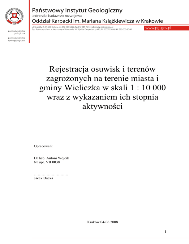 Rejestracja osuwisk i terenów zagrożonych na terenie miasta i gminy Wieliczka w skali 1 : 10 000 wraz z wykazaniem ich stopnia aktywności Opracowali: ……………………. Dr hab. Antoni Wójcik Nr upr. VII 0038 ……………………… Jacek Dacka Kraków 04-06 2008 1 Rejestracja osuwisk i terenów zagrożonych na terenie gminy i miasta Wieliczka w skali 1 : 10 000 Położenie Obszar gminy i miasta Wieliczka położony jest na terenie Kotliny Sandomierskiej i Karpat. Północna część terenu gminy znajduje na obszarze Kotliny Sandomierskiej gdzie znaczne powierzchnie zajmują osady rzeczne Wisły oraz jej prawobocznych dopływów. Jest to obszar o bardzo małych deniwelacjach nie objęty procesami osuwiskowymi. Bezpośrednio na południe od doliny Wisły występuje obszar wysoczyzn określany jako Wysoczyzna Wielicko-Gdowska (L. Starkel, 1972). Jest on położony miedzy nasunięciem karpackim a doliną Wisły. Charakteryzuje się występowaniem szerokich garbów o wysokości do 260-280 m n.p.m. rozciętych szerokimi płaskodennymi dolinami. Na południe od Wieliczki znajduje się Pogórze Wielickie, które rozpoczyna się wyraźnym progiem morfologicznym. Pogórze to charakteryzuje się wyrównanymi i szerokimi garbami o wysokości bezwzględnej na terenie gminy Wieliczka dochodzącymi do 360 – 420 m. Pogórze rozcięte jest przez lewoboczne dopływy Raby oraz Wilgę i jej dopływy. Metoda badań Państwowy Instytut Geologiczny Oddział Karpacki wykonał rejestrację osuwisk i terenów zagrożonych dla terenu miast i Gminy Wieliczka wg stanu na koniec czerwca 2008 roku. Wyniki prac przedstawiono na mapach topograficznych w skali 1 : 10 000 w granicach administracyjnych. Przeprowadzona rejestracja bazuje na terenowych pracach geologicznokartograficznych, obejmujących szczegółowe wyznaczenia granic osuwisk, ich okonturowania oraz określenia stopnia aktywności. Prace prowadzono w okresie kwiecieńczerwiec 2008. Rejestrację wykonano zgodnie z Instrukcją opracowania Mapy osuwisk i terenów zagrożonych ruchami masowymi (D. Grabowski i in., 2008). Prace polegały na możliwie precyzyjnym wyznaczeniu granic i zaznaczeniu ich na mapie topograficznej w skali 1 : 10 000. Dla większości osuwisk wyznaczenie granic, zwłaszcza dla osuwisk aktywnych i okresowo aktywnych nie stanowiło problemu. Zasięg niektórych osuwisk, zwłaszcza starszych był utrudniony ze względu na zatarcie granic spowodowanych działalnością człowieka, głównie przez rolnictwo oraz budownictwo (np. rejon Golkowic), dlatego w tych obszarach wyznaczono granice jako przypuszczalne lub niepewne. Utrudnieniem w precyzyjnym wyznaczeniu zasięgu osuwisk był czas wykonywania rejestracji 2 w okresie bujnego rozwoju roślinności, zwłaszcza w terenach wcześniej intensywnie użytkowanych rolniczo, a obecnie zamienionych w łąki. Możliwa jest niewielka korekta granic w tych terenach w okresach o mniejszej intensywności rozwoju roślinności. Obszar miasta i gminy Wieliczka znajduje się na 3 arkuszach Szczegółowej mapy geologicznej Polski w skali 1 : 50 000, obejmując fragmenty arkuszy: - w części północnej Niepołomice (974); - części zachodniej – Myślenice (996); - pozostały obszar znajduje się na arkuszu Wieliczka (997). Pod względem geologicznym obszar gminy i miasta Wieliczka położony jest na styku dwóch regionalnych jednostek tektonicznych: Karpat zewnętrznych i zapadliska przedkarpackiego. Obszar w granicach gminy i miasta Wieliczki posiada zróżnicowana budowę geologiczną, zwłaszcza w strefie nasunięcia karpackiego. Północna część gminy znajduje się na terenie zbudowanym z utworów zapadliska przedkarpackiego, na które składają się piaski bogucickie i warstwy chodenickie. U czoła nasunięcia znajduje się wąska strefa tzw. miocenu sfałdowanego. Przez środkową część omawianego obszaru przebiega linia nasunięcia karpackiego. Czoło nasunięcia karpackiego zachowane jest w postaci wyraźnego progu i posiada skomplikowaną budowę, na którą składają się zróżnicowane litologicznie utwory wiązane z serią śląską i podśląską. Utwory fliszu karpackiego jak i utwory neogeńskie są w strefie nasunięcia silnie zaburzone tektonicznie. W strefie tej występuje najwięcej aktywnych osuwisk. Południową część gminy budują utwory należące do jednostki śląskiej. Ze strefami występowania utworów dolnokredowych, gdzie dominują łupki są związane osuwiska. Duże powierzchnie w południowej części gminy zajmują wychodnie warstw istebniańskich, a zwłaszcza piaskowce istebniańskie i te obszary wykazują małą liczbę osuwisk. Obszary osuwisko na terenie gminy i miasta Wieliczka Opracowywany obszar gminy i miasta Wieliczki jest zróżnicowany pod względem charakteru, typu, wielkości jak i częstotliwości osuwisk. Ich występowanie wyraźnie dowiązuje do głównych jednostek geomorfologicznych i skomplikowania podłoża skalnego w rejonach objętych procesami osuwiskowymi. Podstawą wydzielenia poszczególnych osuwisk jest zachowanie charakterystycznych form nisz, a zwłaszcza skarp osuwiskowych oraz jęzorów koluwialnych. Na omawianym obszarze można było wyróżnić osuwiska: aktywne, okresowo aktywne i nieaktywne. 3 Przez osuwisko rozumie się formę rzeźby terenu powstałą na skutek grawitacyjnego przemieszczenia mas gruntowych i skalnych, wzdłuż powierzchni poślizgu w wyniku przekroczenia przez ośrodek granicy wytrzymałości na ścinanie. W obrębie osuwiska wyróżnia się skarpę główną (czasami określaną jako nisza) oraz jęzor koluwialny miejscami nasuwający się wyraźnym czołem na obszar nie osunięty. Między niszą a czołem osuwiska występują progi wewnątrzosuwiskowe, zagłębienia bezodpływowe czasami wypełnione wodą, różnej wielkości garby, nabrzmienia i obniżenia. Na omawianym terenie są to prawie wyłącznie zsuwy powstałe w wyniku przemieszczenia gruntów i skał wzdłuż powierzchni ścięc