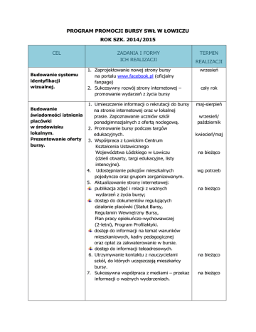 PROGRAM PROMOCJI BURSY SWŁ W ŁOWICZU ROK SZK. 2014/2015 CEL Budowanie systemu identyfikacji wizualnej. Budowanie świadomości istnienia placówki w środowisku lokalnym. Prezentowanie oferty bursy. ZADANIA I FORMY ICH REALIZACJI 1. Zaprojektowanie nowej strony bursy na portalu www.facebook.pl (oficjalny fanpage) 2. Sukcesywny rozwój strony internetowej – promowanie wydarzeń z życia bursy 1. Umieszczenie informacji o rekrutacji do bursy na stronie internetowej oraz w lokalnej prasie. Zapoznawanie uczniów szkół ponadgimnazjalnych z ofertą noclegową. 2. Promowanie bursy podczas targów edukacyjnych. 3. Współpraca z Łowickim Centrum Kształcenia Ustawicznego Województwa Łódzkiego w Łowiczu (dzień otwarty, targi edukacyjne, listy intencyjne). 4. Udostępnianie pokojów mieszkalnych pojedynczo oraz grupom zorganizowanym. 5. Aktualizowanie strony internetowej: publikacja zdjęć i relacji z ważnych wydarzeń z życia bursy; dostęp do dokumentów regulujących działanie placówki (Statut Bursy, Regulamin Wewnętrzny Bursy, Plan pracy opiekuńczo-wychowawczej (2-letni), Program Profilaktyki. dostęp do informacji na temat warunków mieszkaniowych, kadry pedagogicznej oraz opłat za zakwaterowanie w bursie. dostęp do informacji teleadresowych. 6. Utrzymywanie kontaktu z nauczycielami szkół, do których uczęszczają mieszkańcy bursy. 7. Sukcesywna współpraca z mediami – przekaz informacji o ważnych wydarzeniach. TERMIN REALIZACJI wrzesień cały rok maj-sierpień wrzesień/ październik kwiecień/maj na bieżąco wg potrzeb na bieżąco na bieżąco na bieżąco Kształtowanie pozytywnego wizerunku placówki w środowisku lokalnym. Współpraca z instytucjami wspierającymi bursę. 1. Tworzenie warunków do rozwoju zainteresowań, talentów i zdolności mieszkańców: – działalność samorządu w zakresie rozwoju zainteresowań: rekreacyjno-turystycznych, kulinarnych i innych. 2. Zapewnienie odpowiednich warunków do nauki. 3. Troska o zdrowie i bezpieczeństwo. 4. Zaangażowanie kadry pedagogicznej i mieszkańców w akcje ogólnopolskie i regionalne: - współpraca z Internatem SOSz-W i Świetlicą „Słonko”; - udział w akcjach charytatywnych: „I Ty możesz zostać św. Mikołajem”, „Wózek za nakrętki”. 5. Dbałość o estetykę i wystój pomieszczeń mieszkalnych i użytkowych. 6. Promowanie osiągnięć wychowanków, którzy wyróżniają się pozytywną postawą i zaangażowaniem (m. in. w promocję bursy) – listy pochwalne do szkół i rodziców. 7. Udział nauczycieli w szkoleniach, kursach, warsztatach i konferencjach celem podwyższenia kwalifikacji zawodowych. 1. Współpraca z instytucjami, stowarzyszeniami, organizacjami pomagającymi w realizacji zadań wychowawczych: Policja Straż Pożarna Miejski i Gminne Ośrodki Pomocy Społecznej Łowicka Akademia Sportu PSS-E w Łowiczu Internat SOSz-W Świetlica „Słonko” Szkoły ponadgimnazjalne i policealne, do których uczęszczają wychowankowie. 2. Pozyskiwanie sponsorów: współpraca z Centrum Kultury , Turystyki i Promocji Ziemi Łowickiej (powiat) oraz Wydziałem Promocji, Kultury , Sportu i Turystyki (Urząd Miasta). cały rok cały rok na bieżąco cały rok maj/czerwiec wg potrzeb wg potrzeb wg potrzeb