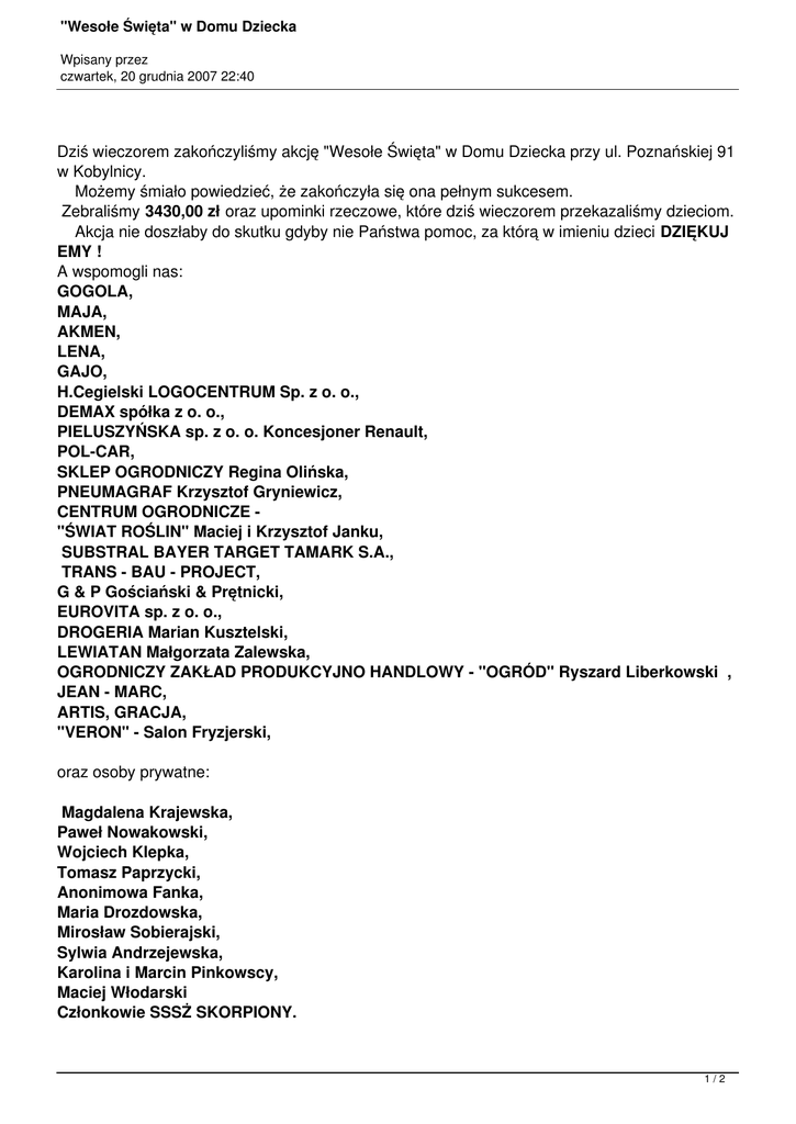"Wesołe Święta" w Domu Dziecka Wpisany przez czwartek, 20 grudnia 2007 22:40 Dziś wieczorem zakończyliśmy akcję "Wesołe Święta" w Domu Dziecka przy ul. Poznańskiej 91 w Kobylnicy. Możemy śmiało powiedzieć, że zakończyła się ona pełnym sukcesem. Zebraliśmy 3430,00 zł oraz upominki rzeczowe, które dziś wieczorem przekazaliśmy dzieciom. Akcja nie doszłaby do skutku gdyby nie Państwa pomoc, za którą w imieniu dzieci DZIĘKUJ EMY ! A wspomogli nas: GOGOLA, MAJA, AKMEN, LENA, GAJO, H.Cegielski LOGOCENTRUM Sp. z o. o., DEMAX spółka z o. o., PIELUSZYŃSKA sp. z o. o. Koncesjoner Renault, POL-CAR, SKLEP OGRODNICZY Regina Olińska, PNEUMAGRAF Krzysztof Gryniewicz, CENTRUM OGRODNICZE "ŚWIAT ROŚLIN" Maciej i Krzysztof Janku, SUBSTRAL BAYER TARGET TAMARK S.A., TRANS - BAU - PROJECT, G & P Gościański & Prętnicki, EUROVITA sp. z o. o., DROGERIA Marian Kusztelski, LEWIATAN Małgorzata Zalewska, OGRODNICZY ZAKŁAD PRODUKCYJNO HANDLOWY - "OGRÓD" Ryszard Liberkowski , JEAN - MARC, ARTIS, GRACJA, "VERON" - Salon Fryzjerski, oraz osoby prywatne: Magdalena Krajewska, Paweł Nowakowski, Wojciech Klepka, Tomasz Paprzycki, Anonimowa Fanka, Maria Drozdowska, Mirosław Sobierajski, Sylwia Andrzejewska, Karolina i Marcin Pinkowscy, Maciej Włodarski Członkowie SSSŻ SKORPIONY. 1/2 "Wesołe Święta" w Domu Dziecka Wpisany przez czwartek, 20 grudnia 2007 22:40 O akcji nie byłoby na pewno tak głośno, gdyby nie media, które ją nagłośniły, a pomogli nam w tym: Speedway24.info Polska & Truck business e-logistyka.pl etransport.pl FlotaAutoBiznes Żużel24.pl Klima-Raflik Żużelend.com Dzięki zebranym środkom zakupiliśmy prezenty dla 37 podopiecznych. Wraz z nami do Kobylnicy zawitał również Piotr Dziatkowiak, który pokazał dzieciom jak wygląda i działa motocykl żużlowy. Głos zabrał prezes Stowarzyszenia Sympatyków Sportu Żużlowego Skorpiony - Tomasz D. Klichowicz, który w swoim przemówieniu podziękował wszystkim, którzy w jakikolwiek sposób wsparli akcję "Wesołe Święta" i złożył dzieciom świąteczne życzenia. Potem przyszła najprzyjemniejsza i tak bardzo oczekiwana przez dzieci chwila, czyli rozdanie i rozpakowanie prezentów. Dzieci były bardzo zadowolone z upominków, a na ich twarzach zagościł uśmiech dzięki czemu możemy powiedzieć, że akcja zakończyła się sukcesem. Na końcu spotkania w imieniu dzieci przemawiała również wicedyrektor Domu Dziecka Renata Biegańska, która podziękowała w imieniu dzieci za prezenty, których ilość mile wszystkich zaskoczyła oraz za możliwość zapoznania się z motocylkem, który dla dzieci był wielką atrakcją. Zdjęcia w Galerii 2/2