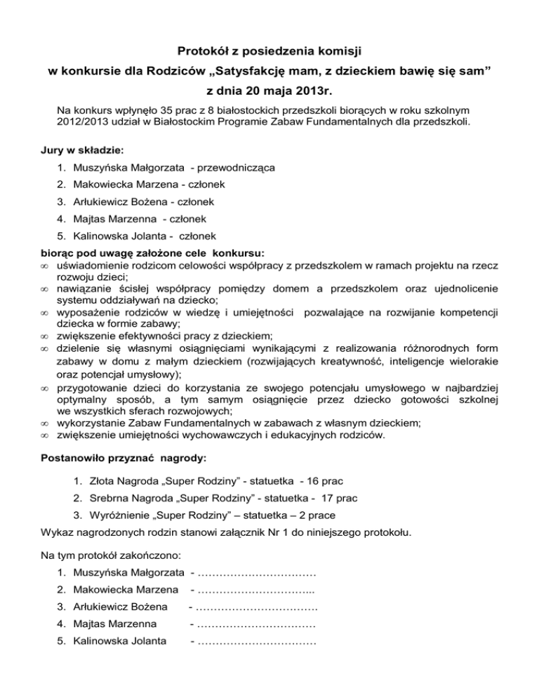 Protokół z posiedzenia komisji w konkursie dla Rodziców „Satysfakcję mam, z dzieckiem bawię się sam” z dnia 20 maja 2013r. Na konkurs wpłynęło 35 prac z 8 białostockich przedszkoli biorących w roku szkolnym 2012/2013 udział w Białostockim Programie Zabaw Fundamentalnych dla przedszkoli. Jury w składzie: 1. Muszyńska Małgorzata - przewodnicząca 2. Makowiecka Marzena - członek 3. Arłukiewicz BoŜena - członek 4. Majtas Marzenna - członek 5. Kalinowska Jolanta - członek biorąc pod uwagę załoŜone cele konkursu: • uświadomienie rodzicom celowości współpracy z przedszkolem w ramach projektu na rzecz rozwoju dzieci; • nawiązanie ścisłej współpracy pomiędzy domem a przedszkolem oraz ujednolicenie systemu oddziaływań na dziecko; • wyposaŜenie rodziców w wiedzę i umiejętności pozwalające na rozwijanie kompetencji dziecka w formie zabawy; • zwiększenie efektywności pracy z dzieckiem; • dzielenie się własnymi osiągnięciami wynikającymi z realizowania róŜnorodnych form zabawy w domu z małym dzieckiem (rozwijających kreatywność, inteligencje wielorakie oraz potencjał umysłowy); • przygotowanie dzieci do korzystania ze swojego potencjału umysłowego w najbardziej optymalny sposób, a tym samym osiągnięcie przez dziecko gotowości szkolnej we wszystkich sferach rozwojowych; • wykorzystanie Zabaw Fundamentalnych w zabawach z własnym dzieckiem; • zwiększenie umiejętności wychowawczych i edukacyjnych rodziców. Postanowiło przyznać nagrody: 1. Złota Nagroda „Super Rodziny” - statuetka - 16 prac 2. Srebrna Nagroda „Super Rodziny” - statuetka - 17 prac 3. WyróŜnienie „Super Rodziny” – statuetka – 2 prace Wykaz nagrodzonych rodzin stanowi załącznik Nr 1 do niniejszego protokołu. Na tym protokół zakończono: 1. Muszyńska Małgorzata - …………………………… 2. Makowiecka Marzena - …………………………... 3. Arłukiewicz BoŜena - ……………………………. 4. Majtas Marzenna - …………………………… 5. Kalinowska Jolanta - …………………………… Załącznik nr 1 Wykaz nagrodzonych Rodzin w konkursie „Satysfakcję mam z dzieckiem bawię się sam’ I. Złotą nagrodę „Super Rodziny” otrzymują: 1. Edyta, Robert i Gabryś Zajkowscy – Przedszkole Samorządowe Nr 31 2. Rodzina Ciborowskich: Amelia, Paweł Patrycja i Arkadiusz - Przedszkole Samorządowe Nr 31 3. Rodzina Mancewicz - Przedszkole Samorządowe Nr 31 4. Natalka Odachowska z Rodziną - Przedszkole Samorządowe Nr 31 5. Anna Sienkiewicz-Wysokińska i Krzysztof Wysokiński z synem Marcelem Przedszkole Samorządowe Nr 48 6. Natalka Tołwińska z rodziną - Przedszkole Samorządowe Nr 48 7. Dawid, Maria i Jacek Jatkowscy - Przedszkole Samorządowe Nr 14 8. Joanna i Adam Miron z córką Dominiką - Przedszkole Samorządowe Nr 14 9. Mateusz i Bartek Gajda z mamą Kingą - Przedszkole Samorządowe Nr 51 10. Kuba Babigorc z Rodzicami - Przedszkole Samorządowe Nr 51 11. Marietka Mikielewicz z rodzicami - Przedszkole Samorządowe Nr 64 12. Krystian Kalinowski z Rodzicami - Przedszkole Samorządowe Nr 64 13. Julia Nitkiewicz z Rodzicami - Przedszkole Samorządowe Nr 64 14. Gaja i Gniewosz Sztabińscy - Przedszkole Samorządowe Nr 68 15. Ada Sulkiewicz z rodzicami - Przedszkole Samorządowe Nr 82 16. Piotr Iwanicki z Rodziną - Przedszkole Samorządowe Nr 82 II. Srebrną nagrodę „Super Rodziny” otrzymują: 1. Emilia Klimczuk, Andrzej Sikora z córką Aleksandrą Sikora - Przedszkole Samorządowe Nr 31 2. Michał Bogusz z Rodziną - Przedszkole Samorządowe Nr 31 3. Patrycja, Anna i Zbigniew Górko - Przedszkole Samorządowe Nr 31 4. Aleksandra Łabieniec - Przedszkole Samorządowe Nr 48 5. Kasia i Ola Mystkowskie z Rodzicami - Przedszkole Samorządowe Nr 48 6. Dorota i Marcin Balkiewicz z córką Julią - Przedszkole Samorządowe Nr 4 7. Karolina i Rafał Tymiński z córką Oliwią - Przedszkole Samorządowe Nr 4 8. Jolanta i Paweł Tarnowscy z córką Amelią - Przedszkole Samorządowe Nr 4 9. Dorota Rutkowska –Mojsziejczuk i Marcin Mojsziejeczuk z córką Michaliną Przedszkole Samorządowe Nr 4 10. Izabela i Kamil Walaszek z córką Mają - Przedszkole Samorządowe Nr 4 11. Kaja Artemiuk z Rodziną - Przedszkole Samorządowe Nr 51 12. Julia Kociołek z Rodziną, mamą Magdaleną i tatą Rafałem - Przedszkole Samorządowe Nr 51 13. Juliusz Wyszyński z Rodzicami Anetą i Grzegorzem - Przedszkole Samorządowe Nr 51 14. Jakub Miękus z Rodzicami - Przedszkole Samorządowe Nr 51 15. Paulina Szostak z Rodzicami - Przedszkole Samorządowe Nr 64 16. Wiktoria Wasilewska z rodziną - Przedszkole Samorządowe Nr 68 17. Damian Gołaszewski z siostrą Wiktorią - Przedszkole Samorządowe Nr 82 III. WyróŜnienie „Super Rodziny” otrzymują: 1. Anna i Adam Sorko z córką Leną - Przedszkole Samorządowe Nr 4 2. Tomasz Krupa - Przedszkole Samorządowe Nr 64