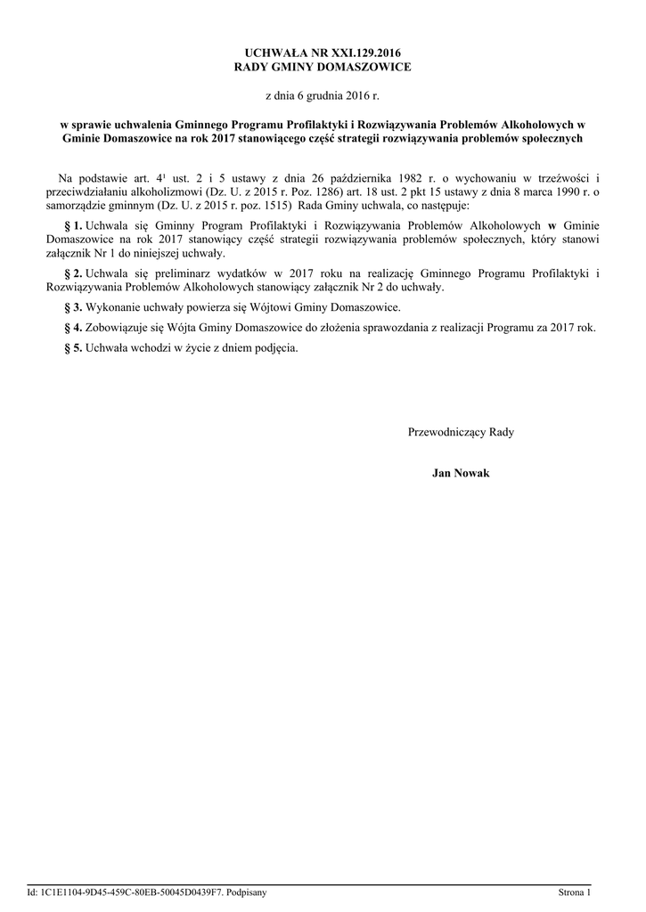 UCHWAŁA NR XXI.129.2016 RADY GMINY DOMASZOWICE z dnia 6 grudnia 2016 r. w sprawie uchwalenia Gminnego Programu Profilaktyki i Rozwiązywania Problemów Alkoholowych w Gminie Domaszowice na rok 2017 stanowiącego część strategii rozwiązywania problemów społecznych Na podstawie art. 4¹ ust. 2 i 5 ustawy z dnia 26 października 1982 r. o wychowaniu w trzeźwości i przeciwdziałaniu alkoholizmowi (Dz. U. z 2015 r. Poz. 1286) art. 18 ust. 2 pkt 15 ustawy z dnia 8 marca 1990 r. o samorządzie gminnym (Dz. U. z 2015 r. poz. 1515) Rada Gminy uchwala, co następuje: § 1. Uchwala się Gminny Program Profilaktyki i Rozwiązywania Problemów Alkoholowych w Gminie Domaszowice na rok 2017 stanowiący część strategii rozwiązywania problemów społecznych, który stanowi załącznik Nr 1 do niniejszej uchwały. § 2. Uchwala się preliminarz wydatków w 2017 roku na realizację Gminnego Programu Profilaktyki i Rozwiązywania Problemów Alkoholowych stanowiący załącznik Nr 2 do uchwały. § 3. Wykonanie uchwały powierza się Wójtowi Gminy Domaszowice. § 4. Zobowiązuje się Wójta Gminy Domaszowice do złożenia sprawozdania z realizacji Programu za 2017 rok. § 5. Uchwała wchodzi w życie z dniem podjęcia. Przewodniczący Rady Jan Nowak Id: 1C1E1104-9D45-459C-80EB-50045D0439F7. Podpisany Strona 1 Załącznik Nr 1 do Uchwały Nr XXI.129.2016 Rady Gminy Domaszowice z dnia 6 grudnia 2016 r. Gminny Program Profilaktyki i Rozwiązywania Problemów Alkoholowych w Gminie Domaszowice na rok 2017 – stanowiący część strategii rozwiązywania problemów społecznych Wszystkie działania mające na celu profilaktykę i rozwiązywanie problemów alkoholowych w gminie Domaszowice, zgodnie z zapisami ustawy znajdują się w poniższym harmonogramie działań, które będą finansowane ze środków znajdujących się w budżecie gminy na rok 2017. I. Rozpoznawanie zagrożenia społecznego uzależnieniem od alkoholu. 1. Analiza przyczyn alkoholizmu. 2. Rozpoznawanie zagrożenia w środowisku dzieci i młodzieży. 3. Ustalanie liczby rodzin zagrożonych uzależnieniem od alkoholu. II. Prowadzenie profilaktyki oraz prowadzenie działalności informacyjnej i edukacyjnej, w szczególności dla dzieci i młodzieży. 1. Zorganizowanie letniego wypoczynku z programem profilaktycznym dla dzieci z rodzin z problemem alkoholowym. 2. Przeprowadzenie programów profilaktycznych w placówkach oświatowych. 3. Przeprowadzenie konkursów, sondaży, quizów na temat profilaktyki uzależnień. 4. Koordynowanie programów edukacyjno – kabaretowych przeprowadzanych w Publicznym Przedszkolu, Szkole Podstawowej, Zespole Gimnazjalno – Szkolnym na temat przeciwdziałania alkoholizmowi, przemocy, konfliktów pokoleniowych wpływów złych wzorców z życia dorosłych na psychikę dziecka oraz patologię w rodzinie. 5. Pomoc w dofinansowaniu sportu i zajęć rekreacyjnych dzieci i młodzieży. 6. Wspieranie inicjatyw dla dzieci i młodzieży z rodzin patologicznych oraz zagrożonych alkoholizmem zapobiegających wykluczeniu społecznemu. III. Propaganda wizualna trzeźwości i skutków używania alkoholu. 1. Prowadzenie lokalnych i regionalnych kampanii uzależnień od alkoholu. edukacyjnych na tematy związane z profilaktyką 2. Przekazywanie plakatów, ulotek, broszur o tematyce profilaktycznej do sklepów, w których prowadzona jest sprzedaż alkoholu, rozmieszczanie ich w miejscach publicznych oraz na tablicach informacyjnych. 3. Współpraca z gazetą lokalną. IV. Zapobieganie negatywnym skutkom alkoholizmu. 1. Wzmożenie działań w zakresie wczesnego wykrywania uzależnienia i kierowanie na leczenie odwykowe. 2. Kierowanie osób nadużywających alkoholu na badania w przedmiocie uzależnienia. 3. Podejmowanie wszelkiego typu działań mających na celu profilaktykę, eliminowanie skutków alkoholizmu, jako patologii społecznej. V. Zasady wydawania i cofania zezwoleń na prowadzenie sprzedaży napojów alkoholowych przeznaczonych do spożycia w miejscu lub poza miejscem sprzedaży oraz kontrola przestrzegania zasad obrotu tymi napojami. 1. Opiniowanie wniosków o uzyskanie zezwolenia na sprzedaż napojów alkoholowych. Id: 1C1E1104-9D45-459C-80EB-50045D0439F7. Podpisany Strona 1 2. Sprzedaż napojów alkoholowych przeznaczonych do spożycia w miejscu lub poza miejscem sprzedaży może odbywać się tylko na podstawie wydanego zezwolenia Wójta Gminy Domaszowice po zasięgnięciu opinii Gminnej Komisji Rozwiązywania Problemów Alkoholowych. 3. Cofnięcie wydanego zezwolenia może nastąpić w przypadku przekroczenia warunków określonych w zezwoleniu. VI. Wynagrodzenie członków Gminnej Komisji Rozwiązywania Problemów Alkoholowych. Ustala się dla Pełnomocnika ds. rozwiązywania problemów alkoholowych i zarazem Sekretarza Komisji miesięczne wynagrodzenie w wysokości 24% minimalnego wynagrodzenia za pracę pracowników określonych przez Radę Ministrów, natomiast członkom Komisji za udział w posiedzeniu wynagrodzenie w wysokości 7% minimalnego wynagrodzenia za pracę pracowników określonych przez Radę Ministrów. Ustala się również wynagrodzenie za sporządzenie opinii biegłego w sprawie uzależnienia w wysokości 8% minimalnego wynagrodzenia za pracę pracowników określonych przez Radę Ministrów oraz za sporządzenie wywiadu środowiskowego w wysokości 5% minimalnego wynagrodzenia za pracę pracowników określonych przez Radę Ministrów. Realizatorami Gminnego Programu Profilaktyki i Rozwiązywania Problemów Alkoholowych w Gminie Domaszowice są: 1) Gminna Komisja Rozwiązywania Problemów Alkoholowych 2) Wójt Gminy Domaszowice 3) Dyrektorzy placówek oświatowych z terenu gminy 4) Ośrodek Pomocy Społecznej w Domaszowicach 5) Policja i inni. Id: 1C1E1104-9D45-459C-80EB-50045D0439F7. Podpisany Strona 2 Załącznik Nr Nr 2 do Uchwały Nr XXI.129.2016 Rady Gminy Domaszowice z dnia 6 grudnia 2016 r. Preliminarz wydatków Gminnej Komisji Rozwiązywania Problemów Alkoholowych w Gm