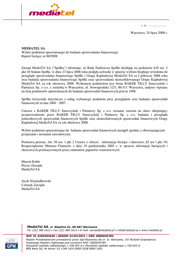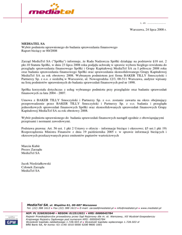 MediaTel SA za rok obrotowy 2008. Wybranym podmiotem jest firma BAKER TILLY Smoczyński i