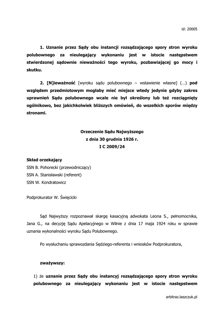 id: 20005 1. Uznanie przez Sądy obu instancji rozsądzającego spory stron wyroku polubownego za nieulegający wykonaniu jest w istocie następstwem stwierdzonej sądownie nieważności tego wyroku, pozbawiającej go mocy i skutku. 2. [N]ieważność [wyroku sądu polubownego – wstawienie własne] (…) pod względem przedmiotowym mogłaby mieć miejsce wtedy jedynie gdyby zakres uprawnień Sądu polubownego wcale nie był określony lub też rozciągnięty ogólnikowo, bez jakichkolwiek bliższych omówień, do wszelkich sporów między stronami. Orzeczenie Sądu Najwyższego z dnia 30 grudnia 1926 r. I C 2009/24 Skład orzekający SSN B. Pohorecki (przewodniczący) SSN A. Stanisławski (referent) SSN W. Kondratowicz Podprokurator W. Święcicki Sąd Najwyższy rozpoznawał skargę kasacyjną adwokata Leona S., pełnomocnika, Jana G., na decyzję Sądu Apelacyjnego w Wilnie z dnia 17 maja 1924 roku w sprawie uznania wykonalności wyroku Sądu Polubownego. Po wysłuchaniu sprawozdania Sędziego-referenta i wniosków Podprokuratora, zważywszy: 1) że uznanie przez Sądy obu instancyj rozsądzającego spory stron wyroku polubownego za nieulegający wykonaniu jest w istocie następstwem arbitraz.laszczuk.pl stwierdzonej sądownie nieważności tego wyroku, pozbawiającej go mocy i skutku, zarzut zatem skargi kasacyjnej, iż Sądy państwowe wyszły w tej mierze z granic, zakreślonych im odnośnymi przepisami proceduralnymi, (art. 1395, 1396, 1397 U. P. C.) przyjęty być nie może; 2) że odmowę nadania wykonalności wyrokowi polubownemu Sąd Apelacyjny oparł na wadliwości samego zapisu na Sąd polubowny, pod którego zawyrokowanie, wedle osnowy zaskarżonej decyzji, strony poddały nietylko oznaczone wyraźnie spory majątkowe, lecz także wszelkie inne swe spory natury tak majątkowej, jak osobistej, za czas obecny i przyszły, co zdaniem instancji apelacyjnej, jest równoznaczne z zupełnem niewymienieniem w zapisie przedmiotu sporów, powodującem nieważność wyrzeczenia arbitrów; 3) że wszakże nieważność ta pod względem przedmiotowym mogłaby mieć miejsce wtedy jedynie gdyby zakres uprawnień Sądu polubownego wcale nie był określony lub też rozciągnięty ogólnikowo, bez jakichkolwiek bliższych omówień, do wszelkich sporów między stronami, gdyż wówczas konieczny dla istnienia i działalności rzeczonego Sądu warunek, położony artykułem 1371 Ust. 2 U. P. C., nie byłby zachowany; gdy zaś, jak w sprawie niniejszej, strony wymieniły szczegółowe w zapisie kwestje, do których rozstrzygnięcia powołany został Sąd polubowny, i tylko dodatkowo wzmiankowały o wszelkich innych sporach, ulegających również rozpoznaniu tegoż Sądu, nieodzownem się stało ustalenie na zasadzie okoliczności czynu, czy Sąd polubowny wyrzeczeniem swem objął kwestje, poddane wyraźnie jego jurysdykcji, czy też wyrokował w materji bliżej w zapisie nieokreślonej i wychodzącej w ten sposób poza zakres władzy tego Sądu, a nie mający ścisłego związku z resztą wyroku, przyczem wyłącznie w drugim przypadku wyrok polubowny podlegałby uchyleniu w całości lub odpowiedniej części (orz. Izby I-ej S. N. 91-1925), w pierwszym natomiast, jako prawidłowy, nie mógłby być z tego powodu wzruszony; 4) że powyższych ustaleń faktycznych decyzja Sądu Apelacyjnego wcale nie zawiera, uzasadniając błędnemi przesłankami pozbawienie wyroku polubownego ważności, wobec czego obraża w sposób istotny dla wyniku sprawy przepisy art. 1371, 1397 oraz art. 711 U. P. C. a tem samem nie może być utrzymana w mocy; arbitraz.laszczuk.pl z tych zasad Sąd Najwyższy decyzję Sądu Apelacyjnego w Wilnie z powodu obrazy art. 1371 i 1397 U. P. C. oraz art. 711 U. P. C. uchyla i sprawę temuż Sądowi do rozpoznania w innym składzie Sędziów przekazuje. Źródło: Zb.Orz. 1926 poz. 200 arbitraz.laszczuk.pl