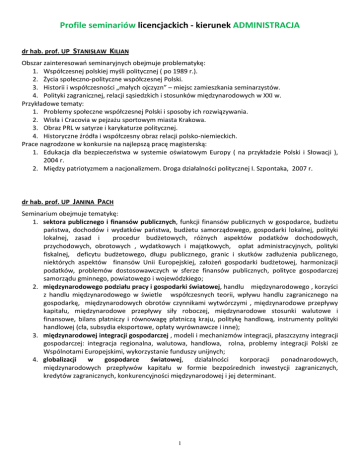 Profile seminariów licencjackich - kierunek ADMINISTRACJA dr hab. prof. UP STANISŁAW KILIAN Obszar zainteresowań seminaryjnych obejmuje problematykę: 1. Współczesnej polskiej myśli politycznej ( po 1989 r.). 2. Życia społeczno-polityczne współczesnej Polski. 3. Historii i współczesności „małych ojczyzn” – miejsc zamieszkania seminarzystów. 4. Polityki zagranicznej, relacji sąsiedzkich i stosunków międzynarodowych w XXI w. Przykładowe tematy: 1. Problemy społeczne współczesnej Polski i sposoby ich rozwiązywania. 2. Wisła i Cracovia w pejzażu sportowym miasta Krakowa. 3. Obraz PRL w satyrze i karykaturze politycznej. 4. Historyczne źródła i współczesny obraz relacji polsko-niemieckich. Prace nagrodzone w konkursie na najlepszą pracę magisterską: 1. Edukacja dla bezpieczeństwa w systemie oświatowym Europy ( na przykładzie Polski i Słowacji ), 2004 r. 2. Między patriotyzmem a nacjonalizmem. Droga działalności politycznej I. Szpontaka, 2007 r. dr hab. prof. UP JANINA PACH Seminarium obejmuje tematykę: 1. sektora publicznego i finansów publicznych, funkcji finansów publicznych w gospodarce, budżetu państwa, dochodów i wydatków państwa, budżetu samorządowego, gospodarki lokalnej, polityki lokalnej, zasad i procedur budżetowych, różnych aspektów podatków dochodowych, przychodowych, obrotowych , wydatkowych i majątkowych, opłat administracyjnych, polityki fiskalnej, deficytu budżetowego, długu publicznego, granic i skutków zadłużenia publicznego, niektórych aspektów finansów Unii Europejskiej, założeń gospodarki budżetowej, harmonizacji podatków, problemów dostosowawczych w sferze finansów publicznych, polityce gospodarczej samorządu gminnego, powiatowego i wojewódzkiego; 2. międzynarodowego podziału pracy i gospodarki światowej, handlu międzynarodowego , korzyści z handlu międzynarodowego w świetle współczesnych teorii, wpływu handlu zagranicznego na gospodarkę, międzynarodowych obrotów czynnikami wytwórczymi , międzynarodowe przepływy kapitału, międzynarodowe przepływy siły roboczej, międzynarodowe stosunki walutowe i finansowe, bilans płatniczy i równowagę płatniczą kraju, politykę handlową, instrumenty polityki handlowej (cła, subsydia eksportowe, opłaty wyrównawcze i inne); 3. międzynarodowej integracji gospodarczej , modeli i mechanizmów integracji, płaszczyzny integracji gospodarczej: integracja regionalna, walutowa, handlowa, rolna, problemy integracji Polski ze Wspólnotami Europejskimi, wykorzystanie funduszy unijnych; 4. globalizacji w gospodarce światowej, działalności korporacji ponadnarodowych, międzynarodowych przepływów kapitału w formie bezpośrednich inwestycji zagranicznych, kredytów zagranicznych, konkurencyjności międzynarodowej i jej determinant. 1 Profile seminariów licencjackich - kierunek ADMINISTRACJA dr GRZEGORZ FORYŚ Seminarium poświęcone jest szeroko rozumianej problematyce funkcjonowania i zmian samorządu terytorialnego i wspólnot lokalnych w Polsce, Europie i na świecie w aspekcie instytucjonalnym, społecznym, ekonomicznym i politycznym. Szczegółowy zakres problematyki seminarium obejmuje następujące kwestie: • Funkcjonowanie wspólnot lokalnych i ich zmiany w okresie transformacji. • Społeczeństwo lokalne i społeczeństwo obywatelskie. • Wzory uczestnictwa w życiu publicznym mieszkańców wsi i miast. • Kapitał ludzki i kapitał społeczny w rozwoju lokalnym i regionalnym. • Rozwój zrównoważony wspólnot lokalnych. • Rola samorządu terytorialnego w ograniczaniu negatywnych zjawisk społecznych w okresie radykalnej zmiany społecznej w Polsce. • Miasto i wieś w obliczu zmiany społecznej (wymiar społeczny, kulturowy, polityczny, ekonomiczny i demograficzny). • Zmiany prawne regulujące funkcjonowanie samorządu terytorialnego i jego pozycję, ze szczególnym uwzględnieniem polskiego samorządu po 1989 roku. • Relacje władzy i społeczeństwa na poziomie lokalnym- współpraca i konflikt. • Władza i elity lokalne. • Kampanie wyborcze w wyborach samorządowych. • Teoretyczne koncepcje rozwoju lokalnego. dr INGA KAWKA • • • • • Prawo europejskie, prawo instytucjonalne UE –system instytucjonalny UE, źródła prawa UE i ich tworzenie, stosowanie i interpretacja prawa UE, prawo administracyjne UE, administracja europejska bezpośrednia i zdecentralizowana, komitologia, agencje europejskie, otwarta metoda koordynacji, sądy wspólnotowe, europejski rzecznik praw obywatelskich, procedura administracyjna przed organami UE, europejskie standardy procedury administracyjnej i sądowoadministracyjnej m.in. zasady dobrej administracji, przejrzystości i odpowiedzialności w prawie wspólnotowym oraz prawo gospodarcze – swobody rynku wewnętrznego, wspólnotowe prawo: konkurencji, łączności elektronicznej, zamówień publicznych. Wpływ prawa europejskiego na polskie prawo administracyjne, postępowanie przed organami administracji oraz sądownictwo administracyjne. Polskie publiczne prawo gospodarcze w szczególności administracyjne prawo regulacyjne dotyczące sektorów infrastrukturalnych (telekomunikacja, energetyka, kolej, poczta), Polskie prawo administracyjne - źródła prawa administracyjnego, podstawowe zasady prawa administracyjnego, prawne formy działania administracji, podmioty administracji publicznej, postępowanie administracyjne oraz sądowo-administracyjne. Postępowanie administracyjne w państwach europejskich. dr KLAUDIA KLECHA Seminarium obejmuje następującą problematykę: • Konstytucyjny status jednostki: konstytucyjne prawa i wolności; ograniczenia wolności i praw; ochrona wolności i praw; obowiązki obywatelskie. • Źródła prawa: system źródeł prawa; tworzenie prawa; obowiązywanie prawa. • Państwo wobec gospodarki: zasady ustroju gospodarczego; podejmowanie i prowadzenie działalności gospodarczej; publiczna działalność gospodarcza; pomoc pub