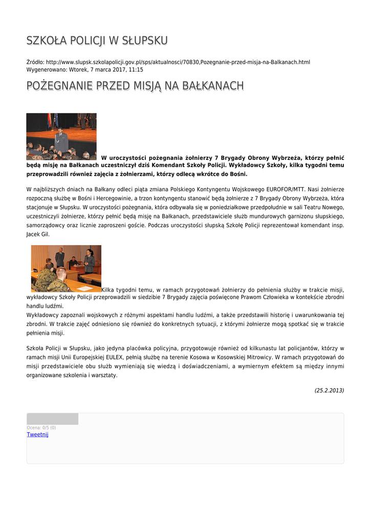SZKOŁA POLICJI W SŁUPSKU Źródło: http://www.slupsk.szkolapolicji.gov.pl/sps/aktualnosci/70830,Pozegnanie-przed-misja-na-Balkanach.html Wygenerowano: Wtorek, 7 marca 2017, 11:15 POŻEGNANIE PRZED MISJĄ NA BAŁKANACH W uroczystości pożegnania żołnierzy 7 Brygady Obrony Wybrzeża, którzy pełnić będą misję na Bałkanach uczestniczył dziś Komendant Szkoły Policji. Wykładowcy Szkoły, kilka tygodni temu przeprowadzili również zajęcia z żołnierzami, którzy odlecą wkrótce do Bośni. W najbliższych dniach na Bałkany odleci piąta zmiana Polskiego Kontyngentu Wojskowego EUROFOR/MTT. Nasi żołnierze rozpoczną służbę w Bośni i Hercegowinie, a trzon kontyngentu stanowić będą żołnierze z 7 Brygady Obrony Wybrzeża, która stacjonuje w Słupsku. W uroczystości pożegnania, która odbywała się w poniedziałkowe przedpołudnie w sali Teatru Nowego, uczestniczyli żołnierze, którzy pełnić będą misję na Bałkanach, przedstawiciele służb mundurowych garnizonu słupskiego, samorządowcy oraz licznie zaproszeni goście. Podczas uroczystości słupską Szkołę Policji reprezentował komendant insp. Jacek Gil. Kilka tygodni temu, w ramach przygotowań żołnierzy do pełnienia służby w trakcie misji, wykładowcy Szkoły Policji przeprowadzili w siedzibie 7 Brygady zajęcia poświęcone Prawom Człowieka w kontekście zbrodni handlu ludźmi. Wykładowcy zapoznali wojskowych z różnymi aspektami handlu ludźmi, a także przedstawili historię i uwarunkowania tej zbrodni. W trakcie zajęć odniesiono się również do konkretnych sytuacji, z którymi żołnierze mogą spotkać się w trakcie pełnienia misji. Szkoła Policji w Słupsku, jako jedyna placówka policyjna, przygotowuje również od kilkunastu lat policjantów, którzy w ramach misji Unii Europejskiej EULEX, pełnią służbę na terenie Kosowa w Kosowskiej Mitrowicy. W ramach przygotowań do misji przedstawiciele obu służb wymieniają się wiedzą i doświadczeniami, a wymiernym efektem są między innymi organizowane szkolenia i warsztaty. (25.2.2013) Ocena: 0/5 (0) Tweetnij