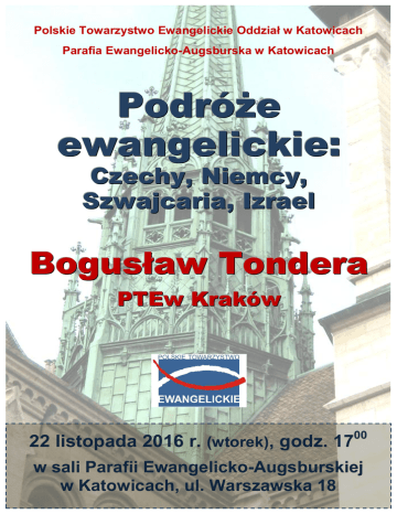 Polskie Towarzystwo Ewangelickie Oddział w Katowicach Parafia Ewangelicko-Augsburska w Katowicach Podróże ewangelickie: Czechy, Niemcy, Szwajcaria, Izrael Bogusław Tondera PTEw Kraków 22 listopada 2016 r. (wtorek), godz. 17 00 w sali Parafii Ewangelicko-Augsburskiej w Katowicach, ul. Warszawska 18