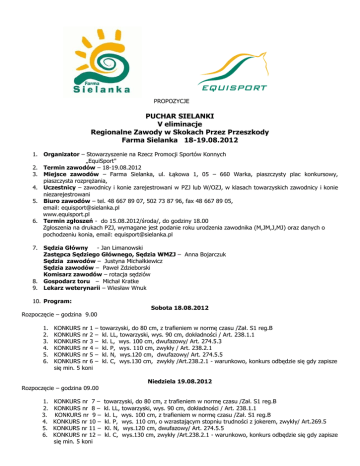 PROPOZYCJE PUCHAR SIELANKI V eliminacje Regionalne Zawody w Skokach Przez Przeszkody Farma Sielanka 18-19.08.2012 1. Organizator – Stowarzyszenie na Rzecz Promocji Sportów Konnych „EquiSport" 2. Termin zawodów – 18-19.08.2012 3. Miejsce zawodów – Farma Sielanka, ul. Łąkowa 1, 05 – 660 Warka, piaszczysty plac konkursowy, piaszczysta rozprężania, 4. Uczestnicy – zawodnicy i konie zarejestrowani w PZJ lub W/OZJ, w klasach towarzyskich zawodnicy i konie niezarejestrowani 5. Biuro zawodów – tel. 48 667 89 07, 502 73 87 96, fax 48 667 89 05, email: [email protected] www.equisport.pl 6. Termin zgłoszeń - do 15.08.2012/środa/, do godziny 18.00 Zgłoszenia na drukach PZJ, wymagane jest podanie roku urodzenia zawodnika (M,JM,J,MJ) oraz danych o pochodzeniu konia, email: [email protected] 7. Sędzia Główny - Jan Limanowski Zastępca Sędziego Głównego, Sędzia WMZJ – Anna Bojarczuk Sędzia zawodów – Justyna Michałkiewicz Sędzia zawodów – Paweł Zdzieborski Komisarz zawodów – rotacja sędziów 8. Gospodarz toru – Michał Kratke 9. Lekarz weterynarii – Wiesław Wnuk 10. Program: Sobota 18.08.2012 Rozpoczęcie – godzina 9.00 1. 2. 3. 4. 5. 6. KONKURS nr 1 KONKURS nr 2 KONKURS nr 3 KONKURS nr 4 KONKURS nr 5 KONKURS nr 6 się min. 5 koni – – – – – – towarzyski, do 80 cm, z trafieniem w normę czasu /Zał. S1 reg.B kl. LL, towarzyski, wys. 90 cm, dokładności / Art. 238.1.1 kl. L, wys. 100 cm, dwufazowy/ Art. 274.5.3 kl. P, wys. 110 cm, zwykły / Art. 238.2.1 kl. N, wys.120 cm, dwufazowy/ Art. 274.5.5 kl. C, wys.130 cm, zwykły /Art.238.2.1 - warunkowo, konkurs odbędzie się gdy zapisze Niedziela 19.08.2012 Rozpoczęcie – godzina 09.00 1. 2. 3. 4. 5. 6. KONKURS nr 7 – KONKURS nr 8 – KONKURS nr 9 – KONKURS nr 10 – KONKURS nr 11 – KONKURS nr 12 – się min. 5 koni towarzyski, do 80 cm, z trafieniem w normę czasu /Zał. S1 reg.B kl. LL, towarzyski, wys. 90 cm, dokładności / Art. 238.1.1 kl. L, wys. 100 cm, z trafieniem w normę czasu /Zał. S1 reg.B kl. P, wys. 110 cm, o wzrastającym stopniu trudności z jokerem, zwykły/ Art.269.5 Kl. N, wys.120 cm, dwufazowy/ Art. 274.5.5 kl. C, wys.130 cm, zwykły /Art.238.2.1 - warunkowo, konkurs odbędzie się gdy zapisze Konkursy nr 3, 4, 5, 6,9,10,11 i 12 zaliczane są do klasyfikacji Pucharu Sielanki. Jeżeli na tym samym koniu zawodnik wystartuje w konkursie dwa razy to do klasyfikacji zalicza się wynik pierwszego startu. Godziny rozpoczęcia konkursów będą uzależnione od ilości zgłoszeń. Organizator zastrzega możliwość zmian w programie zawodów. Warunki techniczne: - Prosimy o przedstawienie dokumentów w loży sędziowskiej i wniesienie opłat w biurze zawodów na minimum 1 godzinę przed rozpoczęciem konkursu. - Zmiany na listach startowych możliwe są nie później niż na godzinę przed konkursem. Za zmianę po tym terminie pobierana będzie opłata w wysokości 10 PLN. - opłata organizacyjna – 140 zł od konia za dwa dni - 80 zł od konia za jeden dzień - startowe od konia: konkurs kl. P – 20 zł konkurs kl. N – 25 zł konkurs kl. C – 30 zł - opłata za boks – 180 PLN całe zawody, 90 PLN jeden dzień (organizator dysponuje ograniczoną ilością boksów - 120 boksów) - decyduje kolejność zgłoszeń; Zgłoszenie na dwa dni zawodów nie jest równoznaczne z rezerwacją boksów. Stajnie będą otwarte od soboty 18.08.2012 od godziny 7.00 - podłączenie koniowozu do prądu – 100 zł. (Prosimy o informację na zgłoszeniu) - zawody będą rozgrywane zgodnie z przepisami PZJ; - organizator nie ponosi odpowiedzialności za wypadki, kradzieże oraz szkody mogące mieć miejsce podczas zawodów i transportu; - dla zwycięzców konkursów Zawodów Regionalnych przewidziane są nagrody pieniężne - w konkursach klasy P, N, C (PULA NAGRÓD – 6000 zŁ ), puchary, flot dla koni (25% uczestników w konkursie). W konkursach nr 1, 2, 3, 7, 8, 9 przewidziane są nagrody rzeczowe, flot dla koni (25% uczestników w konkursie). konkurs Nr 4 kl P Nr 5 kl N Nr 6 kl C Nr 10 kl P Nr 11 kl N Nr 12 kl C Pula 600 1000 1400 600 1000 1400 I 250 400 600 250 400 600 II 150 300 400 150 300 400 III 100 200 250 100 200 250 IV 50 50 100 50 50 100 V 50 50 50 50 50 50 Organizator zastrzega sobie prawo do zmiany wysokości nagród przy małej ilości startujących. Ilość nagradzanych miejsc w danym konkursie zależy od ilości przejazdów. Startów w konkursie : do 4 przejazdów – płatne 1 miejsce Od 5 do 8 przejazdów – płatne 1-2 miejsca Od 9 do 12 przejazdów – płatne 1-3 miejsca Od 13 do 16 przejazdów – płatne 1-4 miejsca - Konkursy nr 1,2 i 7,8 są konkursami towarzyskimi. Zawodników obowiązują aktualne badania lekarskie, a konie min. karta identyfikacyjna konia z aktualnymi szczepieniami. - Zawodników niepełnoletnich obowiązuje pisemna zgoda rodziców lub prawnych opiekunów na start w zawodach. - Obsługa medyczna IZI-MED / karetka P/ Noclegi: Hotel Sielanka Nad Pilicą**** Rezerwacje: tel.: 48 666 16 00, email: [email protected] Ceny obowiązujące dla uczestników zawodów: Pokój 2-osobowy ze śniadaniem- 299 zł Pokój 1-osobowy ze śniadaniem – 249 zł Apartament na terenie ośrodka dla 4 osób ze śniadaniem – 460 zł /doba - Kemping Sielanka Nad Pilicą**** Rezerwacje: tel. 504 047 895, email: [email protected] - Zajazd u Jankiela / przy trasie Warka-Kozienice / tel. 609 148 376 ; 48 670 10 55 Zawody są współfinansowane ze środków Urzędu Marszałkowskiego Województwa Mazowieckiego PATRONAT MEDIALNY: SPONSORZY: