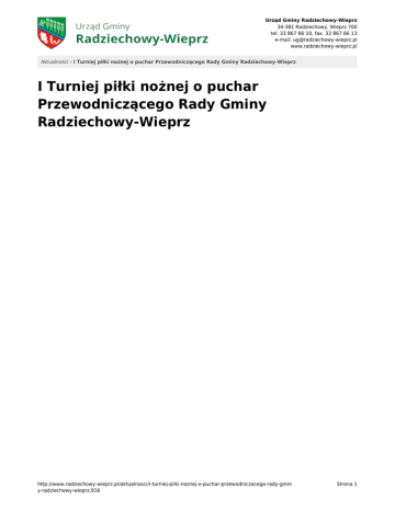 Urząd Gminy Radziechowy-Wieprz 34-381 Radziechowy, Wieprz 700 tel. 33 867 66 10, fax. 33 867 66 13 e-mail: [email protected] www.radziechowy-wieprz.pl Aktualności › I Turniej piłki nożnej o puchar Przewodniczącego Rady Gminy Radziechowy-Wieprz I Turniej piłki nożnej o puchar Przewodniczącego Rady Gminy Radziechowy-Wieprz http://www.radziechowy-wieprz.pl/aktualnosci/i-turniej-pilki-noznej-o-puchar-przewodniczacego-rady-gmin y-radziechowy-wieprz,916 Strona 1