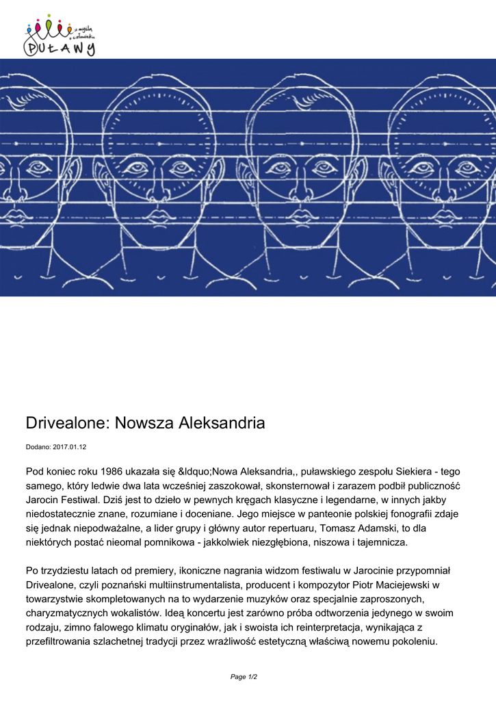 Drivealone: Nowsza Aleksandria Dodano: 2017.01.12 Pod koniec roku 1986 ukazała się “Nowa Aleksandria,, puławskiego zespołu Siekiera - tego samego, który ledwie dwa lata wcześniej zaszokował, skonsternował i zarazem podbił publiczność Jarocin Festiwal. Dziś jest to dzieło w pewnych kręgach klasyczne i legendarne, w innych jakby niedostatecznie znane, rozumiane i doceniane. Jego miejsce w panteonie polskiej fonografii zdaje się jednak niepodważalne, a lider grupy i główny autor repertuaru, Tomasz Adamski, to dla niektórych postać nieomal pomnikowa - jakkolwiek niezgłębiona, niszowa i tajemnicza. Po trzydziestu latach od premiery, ikoniczne nagrania widzom festiwalu w Jarocinie przypomniał Drivealone, czyli poznański multiinstrumentalista, producent i kompozytor Piotr Maciejewski w towarzystwie skompletowanych na to wydarzenie muzyków oraz specjalnie zaproszonych, charyzmatycznych wokalistów. Ideą koncertu jest zarówno próba odtworzenia jedynego w swoim rodzaju, zimno falowego klimatu oryginałów, jak i swoista ich reinterpretacja, wynikająca z przefiltrowania szlachetnej tradycji przez wrażliwość estetyczną właściwą nowemu pokoleniu. Page 1/2 W listopadzie ujrzał światło dzienne koncertowy album upamiętniający jarociński koncert. Teraz w Puławach, w Domu Chemika - małej ojczyźnie Siekiery odbędzie się premierowy koncert tego wydawnictwa. Na scenie gościnnie pojawią się Kuba Wandachowicz - łódzki artysta i animator kultury, założyciel Cool Kids of Death, Kuba Kawalec z grupy happysadsad oraz muzycy grup Snowman i Muchy. Podczas koncertu efektowne wizualizacje oparte na ikonicznej okładce Nowej Aleksandrii zaprezentuje kolektyw .wju. Bezpłatne wejściówki na koncert są do odebrania w kasie POK Dom Chemika Źródło: Page 2/2