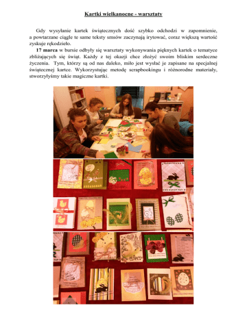 Kartki wielkanocne - warsztaty Gdy wysyłanie kartek świątecznych dość szybko odchodzi w zapomnienie, a powtarzane ciągle te same teksty smsów zaczynają irytować, coraz większą wartość zyskuje rękodzieło. 17 marca w bursie odbyły się warsztaty wykonywania pięknych kartek o tematyce zbliżających się świąt. Każdy z tej okazji chce złożyć swoim bliskim serdeczne życzenia. Tym, którzy są od nas daleko, miło jest wysłać je zapisane na specjalnej świątecznej kartce. Wykorzystując metodę scrapbookingu i różnorodne materiały, stworzyłyśmy takie magiczne kartki.