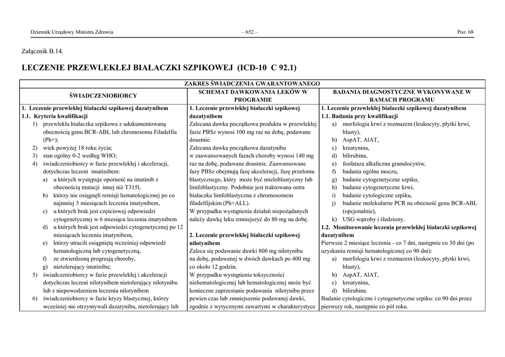 Dziennik Urzędowy Ministra Zdrowia – 652 – Poz. 68 Załącznik B.14. LECZENIE PRZEWLEKŁEJ BIAŁACZKI SZPIKOWEJ (ICD-10 C 92.1) ZAKRES ŚWIADCZENIA GWARANTOWANEGO SCHEMAT DAWKOWANIA LEKÓW W BADANIA DIAGNOSTYCZNE WYKONYWANE W ŚWIADCZENIOBIORCY PROGRAMIE RAMACH PROGRAMU 1. Leczenie przewlekłej białaczki szpikowej dazatynibem 1. Leczenie przewlekłej białaczki szpikowej 1. Leczenie przewlekłej białaczki szpikowej dazatynibem 1.1. Kryteria kwalifikacji dazatynibem 1.1. Badania przy kwalifikacji 1) przewlekła białaczka szpikowa z udokumentowaną Zalecana dawka początkowa produktu w przewlekłej a) morfologia krwi z rozmazem (leukocyty, płytki krwi, obecnością genu BCR-ABL lub chromosomu Filadelfia fazie PBSz wynosi 100 mg raz na dobę, podawane blasty), (Ph+); doustnie. b) AspAT, AlAT, 2) wiek powyżej 18 roku życia; Zalecana dawka początkowa dazatynibu c) kreatynina, 3) stan ogólny 0-2 według WHO; w zaawansowanych fazach choroby wynosi 140 mg d) bilirubina, 4) świadczeniobiorcy w fazie przewlekłej i akceleracji, raz na dobę, podawane doustnie. Zaawansowane e) fosfataza alkaliczna granulocytów, dotychczas leczeni imatinibem: fazy PBSz obejmują fazę akceleracji, fazę przełomu f) badania ogólne moczu, a) u których występuje oporność na imatinib z blastycznego, który może być mieloblastyczny lub g) badanie cytogenetyczne szpiku, obecnością mutacji innej niż T315l, limfoblastyczny. Podobnie jest traktowana ostra h) badanie cytogenetyczne krwi, b) którzy nie osiągnęli remisji hematologicznej po co białaczka limfoblastyczna z chromosomem i) badanie cytologiczne szpiku, najmniej 3 miesiącach leczenia imatynibem, filadelfijskim (Ph+ALL). j) badanie molekularne PCR na obecność genu BCR-ABL c) u których brak jest częściowej odpowiedzi W przypadku wystąpienia działań niepożądanych (opcjonalnie), cytogenetycznej w 6 miesiącu leczenia imatynibem należy dawkę leku zmniejszyć do 80 mg na dobę. k) USG wątroby i śledziony. d) u których brak jest odpowiedzi cytogenetycznej po 12 1.2. Monitorowanie leczenia przewlekłej białaczki szpikowej miesiącach leczenia imatynibem, 2. Leczenie przewlekłej białaczki szpikowej dazatynibem e) którzy utracili osiągniętą wcześniej odpowiedź Pierwsze 2 miesiące leczenia - co 7 dni, następnie co 30 dni (po nilotynibem hematologiczną lub cytogenetyczną, Zaleca się podawanie dawki 800 mg nilotynibu uzyskaniu remisji hematologicznej co 90 dni): f) ze stwierdzoną progresją choroby, na dobę, podawanej w dwóch dawkach po 400 mg a) morfologia krwi z rozmazem (leukocyty, płytki krwi, g) nietolerujący imatinibu; co około 12 godzin. blasty), 5) świadczeniobiorcy w fazie przewlekłej i akceleracji W przypadku wystąpienia toksyczności b) AspAT, AlAT, dotychczas leczeni nilotynibem nietolerujący nilotynibu niehematologicznej lub hematologicznej może być c) kreatynina, lub z niepowodzeniem leczenia nilotynibem konieczne zaprzestanie podawania nilotynibu przez d) bilirubina. 6) świadczeniobiorcy w fazie kryzy blastycznej, którzy pewien czas lub zmniejszenie podawanej dawki, Badanie cytologiczne i cytogenetyczne szpiku: co 90 dni przez wcześniej nie otrzymywali dazatynibu, nietolerujący lub zgodnie z wytycznymi zawartymi w charakterystyce pierwszy rok, następnie co pół roku. Dziennik Urzędowy Ministra Zdrowia nieodpowiadający na imatynib. W razie rozpoznania oporności lub nietolerancji imatynibu, do lekarza prowadzącego należy wybór leku drugiego rzutu (dazatynib albo nilotynib) w oparciu o wskazania medyczne. 1.2 Kryteria wyłączenia 1) pojawienie się objawów nadwrażliwości na dazatynib; 2) toksyczność powyżej 2 według WHO, zwłaszcza wystąpienie poważnych pozahematologicznych działań niepożądanych (3-krotny wzrost stężenia bilirubiny, 5krotny wzrost aktywności aminotransferaz wątrobowych) lub hematologicznych działań niepożądanych (ciężka neutropenia lub małopłytkowość); 3) stan sprawności 3-4 według WHO; 4) brak skuteczności leku po 3 miesiącach stosowania leku: - brak remisji hematologicznej, - brak remisji cytogenetycznej mniejszej (definiowanej jako sytuacja, w której w szpiku są komórki Ph-, ale jest ich mniej niż 35 %); 5) brak odpowiedzi cytogenetycznej po 6 miesiącach; 6) znalezienie dawcy szpiku i podjęcie decyzji o wykonaniu zabiegu przeszczepienia szpiku u danego świadczeniobiorcy; 7) progresja choroby w trakcie stosowania leku wyrażająca się utratą odpowiedzi hematologicznej, utratą całkowitej odpowiedzi cytogenetycznej lub zwiększeniem o 30% odsetka komórek z chromosomem Filadelfia u świadczeniobiorców z remisją cytogenetyczną mniejszą niż całkowita, pojawieniem się nowych aberracji chromosomalnych w klonie białaczkowym. 8) toksyczność hematologiczna lub pozahematologiczna w stopniu 3 lub 4 - która przejawia się pomimo przerw w leczeniu. – 653 – produktu leczniczego. Poz. 68 Badanie ilościowe PCR: po uzyskaniu całkowitej remisji cytogenetycznej co 90 dni. 2. Leczenie przewlekłej białaczki szpikowej nilotynibem 2.1 Badania przy kwalifikacji a) morfologia krwi z rozmazem (leukocyty, płytki krwi, blasty), b) AspAT, AlAT, c) kreatynina, d) bilirubina, e) fosfataza alkaliczna granulocytów, f) badania ogólne moczu, g) badanie cytogenetyczne szpiku, h) badanie cytogenetyczne krwi, i) badanie cytologiczne szpiku, j) badanie molekularne PCR na obecność genu BCR-ABL (opcjonalnie), k) USG wątroby i śledziony. 2.2 Monitorowanie leczenia przewlekłej białaczki szpikowej nilotynibem Raz w miesiącu (po uzyskaniu remisji hematologicznej co 90 dni): a) morfologia krwi z rozmazem (leukocyty, płytki krwi, blasty), b) AspAT, AlAT, c) kreatynina, d) bilirubina. Badanie cytologiczne i cytogenetyczne szpiku: co 90 dni przez pierwszy rok, następnie co pół roku. Badanie ilościowe PCR: po uzyskaniu całkowitej remisji cytogenetycznej co 90 dni. 3. Monitorowanie programu: 1) przekazywanie do NFZ zakresu informacji sprawoz