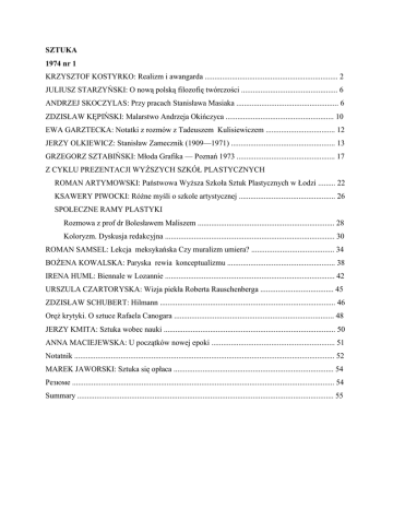 SZTUKA 1974 nr 1 KRZYSZTOF KOSTYRKO: Realizm i awangarda ..................................................................... 2 JULIUSZ STARZYŃSKI: O nową polską filozofię twórczości .................................................. 6 ANDRZEJ SKOCZYLAS: Przy pracach Stanisława Masiaka ..................................................... 6 ZDZISŁAW KĘPIŃSKI: Malarstwo Andrzeja Okińczyca ........................................................ 10 EWA GARZTECKA: Notatki z rozmów z Tadeuszem Kulisiewiczem .................................... 12 JERZY OLKIEWICZ: Stanisław Zamecznik (1909—1971) ...................................................... 13 GRZEGORZ SZTABIŃSKI: Młoda Grafika — Poznań 1973 ................................................... 17 Z CYKLU PREZENTACJI WYŻSZYCH SZKÓŁ PLASTYCZNYCH ROMAN ARTYMOWSKI: Państwowa Wyższa Szkoła Sztuk Plastycznych w Łodzi ......... 22 KSAWERY PIWOCKI: Różne myśli o szkole artystycznej .................................................. 26 SPOŁECZNE RAMY PLASTYKI Rozmowa z prof dr Bolesławem Maliszem ....................................................................... 28 Koloryzm. Dyskusja redakcyjna ........................................................................................ 30 ROMAN SAMSEL: Lekcja meksykańska Czy muralizm umiera? ........................................... 34 BOŻENA KOWALSKA: Paryska rewia konceptualizmu ........................................................ 38 IRENA HUML: Biennale w Lozannie ........................................................................................ 42 URSZULA CZARTORYSKA: Wizja piekła Roberta Rauschenberga ...................................... 45 ZDZISŁAW SCHUBERT: Hilmann ........................................................................................... 46 Oręż krytyki. O sztuce Rafaela Canogara ................................................................................... 48 JERZY KMITA: Sztuka wobec nauki ......................................................................................... 50 ANNA MACIEJEWSKA: U początków nowej epoki ................................................................ 51 Notatnik ....................................................................................................................................... 52 MAREK JAWORSKI: Sztuka się opłaca ................................................................................... 54 Резюме ........................................................................................................................................ 54 Summary ..................................................................................................................................... 55 SZTUKA 1974 nr 2 Spotkanie młodych plastyków w Jabłonnie .................................................................................. 2 JAN DAHL: Wzornictwo przemysłowe jako utopia .................................................................... 4 IRENEUSZ K. KAMIŃSKI: Lubelski ruch artystyczny .............................................................. 5 GRZEGORZ SZTABIŃSKI: Plastyka lubelska ........................................................................... 9 RYSZARD K. PRZYBYLSKI: Malarstwo figuratywne Ratajczyka ......................................... 13 JERZY MADEYSKI: Związki z tradycją ................................................................................... 17 KRZYSZTOF KOSTYRKO: Opozycja żywiołu i ładu w malarstwie Rajmunda Ziemskiego .. 22 ANDRZEJ SKOCZYLAS: Andrzej Nowacki Z cyklu: ,,Sztuka polska w ostatnim trzydziestoleciu” ........................................................... 27 Konstruktywizm. Dyskusja redakcyjna .................................................................................. 30 KRZYSZTOF KOSTYRKO: Awangarda wczorajsza — konstruktywizm ................................ 32 ANDRZEJ K. OLSZEWSKI: Obiekt architektury współczesnej zabytkiem? ............................ 35 Z CYKLU: PREZENTACJE WYŻSZYCH SZKÓL PLASTYCZNYCH STANISŁAW TEISSEYRE: Kryteria egzaminacyjne, tok studiów, perspektywy startu zawodowego ............................................................................................................. 38 BOŻENA KOWALSKA: Protokonceptualizm polski ................................................................ 44 IRENA HUML: Sympozja ceramiki artystycznej — nowa forma pracy twórczej ..................... 48 Z CYKLU: „SZTUKA WOBEC NAUKI” KRYSTYNA ZAMIARA: O złudnych urokach psychologizmu ........................................... 50 WOJCIECH CESARSKI: Co to jest sztuka abstrakcyjna? ......................................................... 51 MAREK JAWORSKI: Jak to było w Jabłonnie ......................................................................... 52 Notatnik ....................................................................................................................................... 52 Резюме ........................................................................................................................................ 54 Summary ..................................................................................................................................... 55 SZTUKA 1974 nr 3 JERZY WASNIEWSKI: Przegląd, konfrontacja i dużo więcej .................................................... 1 BOHDAN T. URBANOWICZ: Kultura wizualna środowiska .................................................... 4 GRZEGORZ SZTABIŃSKI: Malarstwo Antoniego Fatata ......................................................... 9 TERESA KOSTYRKO: Manifestacja malarstwa ....................................................................... 13 KRYSTYNA JERZMANOWSKA: Penetracja przestrzeni ...................................................... 15 JACEK SEMPOLIŃSKI: Malarstwo Jacka Sienickiego ...........................................................