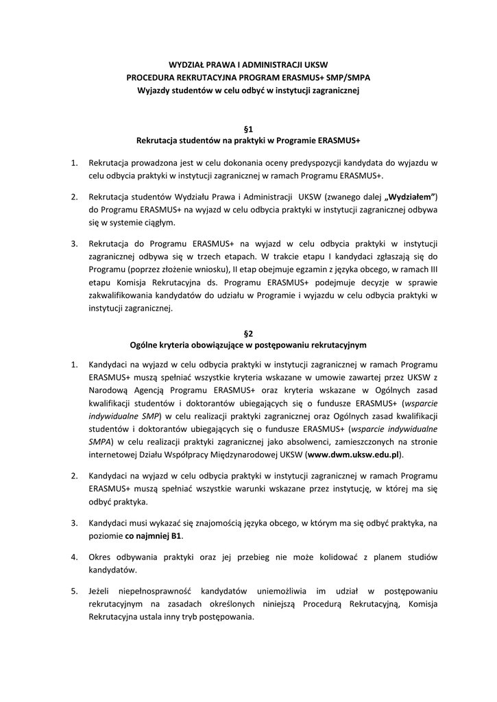 WYDZIAŁ PRAWA I ADMINISTRACJI UKSW PROCEDURA REKRUTACYJNA PROGRAM ERASMUS+ SMP/SMPA Wyjazdy studentów w celu odbyć w instytucji zagranicznej §1 Rekrutacja studentów na praktyki w Programie ERASMUS+ 1. Rekrutacja prowadzona jest w celu dokonania oceny predyspozycji kandydata do wyjazdu w celu odbycia praktyki w instytucji zagranicznej w ramach Programu ERASMUS+. 2. Rekrutacja studentów Wydziału Prawa i Administracji UKSW (zwanego dalej „Wydziałem”) do Programu ERASMUS+ na wyjazd w celu odbycia praktyki w instytucji zagranicznej odbywa się w systemie ciągłym. 3. Rekrutacja do Programu ERASMUS+ na wyjazd w celu odbycia praktyki w instytucji zagranicznej odbywa się w trzech etapach. W trakcie etapu I kandydaci zgłaszają się do Programu (poprzez złożenie wniosku), II etap obejmuje egzamin z języka obcego, w ramach III etapu Komisja Rekrutacyjna ds. Programu ERASMUS+ podejmuje decyzje w sprawie zakwalifikowania kandydatów do udziału w Programie i wyjazdu w celu odbycia praktyki w instytucji zagranicznej. §2 Ogólne kryteria obowiązujące w postępowaniu rekrutacyjnym 1. Kandydaci na wyjazd w celu odbycia praktyki w instytucji zagranicznej w ramach Programu ERASMUS+ muszą spełniać wszystkie kryteria wskazane w umowie zawartej przez UKSW z Narodową Agencją Programu ERASMUS+ oraz kryteria wskazane w Ogólnych zasad kwalifikacji studentów i doktorantów ubiegających się o fundusze ERASMUS+ (wsparcie indywidualne SMP) w celu realizacji praktyki zagranicznej oraz Ogólnych zasad kwalifikacji studentów i doktorantów ubiegających się o fundusze ERASMUS+ (wsparcie indywidualne SMPA) w celu realizacji praktyki zagranicznej jako absolwenci, zamieszczonych na stronie internetowej Działu Współpracy Międzynarodowej UKSW (www.dwm.uksw.edu.pl). 2. Kandydaci na wyjazd w celu odbycia praktyki w instytucji zagranicznej w ramach Programu ERASMUS+ muszą spełniać wszystkie warunki wskazane przez instytucję, w której ma się odbyć praktyka. 3. Kandydaci musi wykazać się znajomością języka obcego, w którym ma się odbyć praktyka, na poziomie co najmniej B1. 4. Okres odbywania praktyki oraz jej przebieg nie może kolidować z planem studiów kandydatów. 5. Jeżeli niepełnosprawność kandydatów uniemożliwia im udział w postępowaniu rekrutacyjnym na zasadach określonych niniejszą Procedurą Rekrutacyjną, Komisja Rekrutacyjna ustala inny tryb postępowania. §3 Studenci, którzy mogą uczestniczyć w procedurze rekrutacyjnej 1. O wyjazd w celu odbycia praktyki w instytucji zagranicznej w ramach Programu ERASMUS+ mogą ubiegać się studenci prowadzonych na Wydziale jednolitych studiów magisterskich (studiów stacjonarnych i niestacjonarnych) oraz studiów doktoranckich (doktoranci), z zastrzeżeniem ust. 2-4 poniżej. 2. O wyjazd w celu odbycia praktyki w instytucji zagranicznej w ramach Programu ERASMUS+ nie mogą ubiegać się studenci pierwszego roku jednolitych studiów magisterskich. 3. O wyjazd w celu odbycia praktyki w instytucji zagranicznej w ramach Programu ERASMUS+ nie mogą ubiegać się słuchacze prowadzonych na Wydziale studiów podyplomowych i uczestnicy kursów dokształcających. 4. O wyjazd w celu odbycia praktyki w instytucji zagranicznej w ramach Programu ERASMUS+ nie mogą ubiegać się studenci, którzy nie rozliczyli się z wcześniejszych wyjazdów na praktyki lub w celu odbycia części studiów w ramach Programu LLP-ERASMUS lub Programu ERASMUS+. 5. Studenci ostatniego roku jednolitych studiów magisterskich oraz ostatniego roku studiów doktoranckich mogą ubiegać się o wyjazd w celu odbycia praktyki w instytucji zagranicznej w ramach Programu ERASMUS+ jako absolwenci. Aby zrealizować wyjazd jako absolwenci, studenci muszą zostać zakwalifikowani na wyjazd przed obroną pracy magisterskiej lub rozprawy doktorskiej. W okresie realizacji praktyki w ramach programu ERASMUS+ absolwent nie może być studentem UKSW ani żadnej innej polskiej lub zagranicznej uczelni. §4 Komisja Rekrutacyjna ds. Programu ERASMUS+ 1. Komisję Rekrutacyjną ds. Programu ERASMUS+ (zwaną dalej „Komisją Rekrutacyjną”) powołuje w formie pisemnej Pełnomocnik Dziekan Wydziału. 2. W skład Komisji Rekrutacyjnej wchodzi: Pełnomocnik Dziekana ds. Programu ERASMUS+ oraz inny pracownik Wydziału. W Komisji Rekrutacyjnej może uczestniczyć w charakterze obserwatora przedstawiciel Samorządu Studentów wyznaczony przez Przewodniczącego Zarządu Samorządu Studentów. 3. Do zadań Komisji Rekrutacyjnej należy w szczególności: 1) organizowanie i przeprowadzanie rekrutacji studentów do Programu ERASMUS+; 2) podejmowanie decyzji o zakwalifikowaniu kandydata do Programu ERASMUS+; 3) ogłaszanie wyników postępowania rekrutacyjnego do Programu ERASMUS+. §5 I Etap - Składanie wniosków o wyjazd w celu odbycia praktyki w instytucji zagranicznej 1. Kandydaci na wyjazd w celu odbycia praktyki w instytucji zagranicznej w ramach Programu ERASMUS+ składają wnioski do Pełnomocnika Dziekana ds. Programu ERASMUS+. 2. Wniosek ma formę pisemną i składany jest na formularzu, przyjętym i ogłoszonym przez Dział Współpracy Międzynarodowej UKSW (dostępnym na stronie internetowej www.dwm.uksw.edu.pl). 3. Wniosek składa się z następujących obowiązkowych części i załączników: 1) zgłoszenie kandydatury studenta na wyjazd w celu odbycia praktyki w instytucji zagranicznej w ramach Programu ERASMUS+; 2) wystawione przez Sekretariat Wydziału zaświadczenie o statusie studenta i średniej ocen (średnią ocen oblicza się na podstawie wszystkich ocen uzyskanych przez kandydata w czasie dotychczasowych studiów na Wydziale, włącznie z ocenami niedostatecznymi oraz ocenami z egzaminów poprawkowych i komisyjnych; w przypadku studentów I roku studiów doktoranckich uwzględniana jest ocena z dyplomu magisterskiego); 3) porozumienie o programie praktyki (Learning Agreement for Traineeships - część Before the Mobility), zatwierdzone pisemnie przez