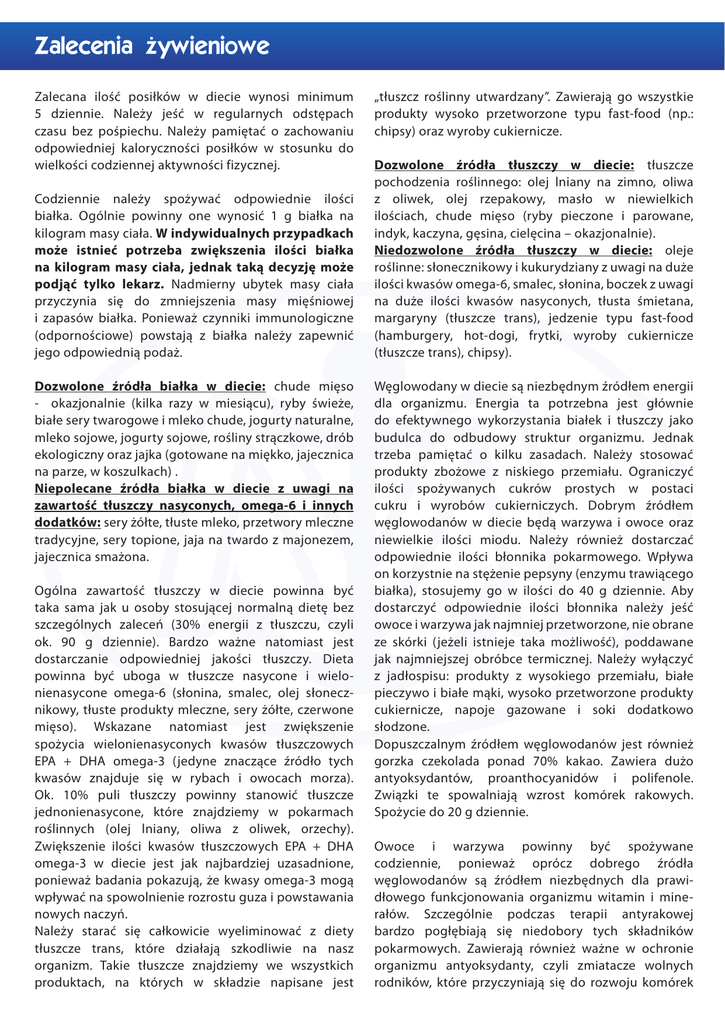 Zalecenia żywieniowe Zalecana ilość posiłków w diecie wynosi minimum 5 dziennie. Należy jeść w regularnych odstępach czasu bez pośpiechu. Należy pamiętać o zachowaniu odpowiedniej kaloryczności posiłków w stosunku do wielkości codziennej aktywności fizycznej. Codziennie należy spożywać odpowiednie ilości białka. Ogólnie powinny one wynosić 1 g białka na kilogram masy ciała. W indywidualnych przypadkach może istnieć potrzeba zwiększenia ilości białka na kilogram masy ciała, jednak taką decyzję może podjąć tylko lekarz. Nadmierny ubytek masy ciała przyczynia się do zmniejszenia masy mięśniowej i zapasów białka. Ponieważ czynniki immunologiczne (odpornościowe) powstają z białka należy zapewnić jego odpowiednią podaż. Dozwolone źródła białka w diecie: chude mięso - okazjonalnie (kilka razy w miesiącu), ryby świeże, białe sery twarogowe i mleko chude, jogurty naturalne, mleko sojowe, jogurty sojowe, rośliny strączkowe, drób ekologiczny oraz jajka (gotowane na miękko, jajecznica na parze, w koszulkach) . Niepolecane źródła białka w diecie z uwagi na zawartość tłuszczy nasyconych, omega-6 i innych dodatków: sery żółte, tłuste mleko, przetwory mleczne tradycyjne, sery topione, jaja na twardo z majonezem, jajecznica smażona. Ogólna zawartość tłuszczy w diecie powinna być taka sama jak u osoby stosującej normalną dietę bez szczególnych zaleceń (30% energii z tłuszczu, czyli ok. 90 g dziennie). Bardzo ważne natomiast jest dostarczanie odpowiedniej jakości tłuszczy. Dieta powinna być uboga w tłuszcze nasycone i wielonienasycone omega-6 (słonina, smalec, olej słonecznikowy, tłuste produkty mleczne, sery żółte, czerwone mięso). Wskazane natomiast jest zwiększenie spożycia wielonienasyconych kwasów tłuszczowych EPA + DHA omega-3 (jedyne znaczące źródło tych kwasów znajduje się w rybach i owocach morza). Ok. 10% puli tłuszczy powinny stanowić tłuszcze jednonienasycone, które znajdziemy w pokarmach roślinnych (olej lniany, oliwa z oliwek, orzechy). Zwiększenie ilości kwasów tłuszczowych EPA + DHA omega-3 w diecie jest jak najbardziej uzasadnione, ponieważ badania pokazują, że kwasy omega-3 mogą wpływać na spowolnienie rozrostu guza i powstawania nowych naczyń. Należy starać się całkowicie wyeliminować z diety tłuszcze trans, które działają szkodliwie na nasz organizm. Takie tłuszcze znajdziemy we wszystkich produktach, na których w składzie napisane jest „tłuszcz roślinny utwardzany”. Zawierają go wszystkie produkty wysoko przetworzone typu fast-food (np.: chipsy) oraz wyroby cukiernicze. Dozwolone źródła tłuszczy w diecie: tłuszcze pochodzenia roślinnego: olej lniany na zimno, oliwa z oliwek, olej rzepakowy, masło w niewielkich ilościach, chude mięso (ryby pieczone i parowane, indyk, kaczyna, gęsina, cielęcina – okazjonalnie). Niedozwolone źródła tłuszczy w diecie: oleje roślinne: słonecznikowy i kukurydziany z uwagi na duże ilości kwasów omega-6, smalec, słonina, boczek z uwagi na duże ilości kwasów nasyconych, tłusta śmietana, margaryny (tłuszcze trans), jedzenie typu fast-food (hamburgery, hot-dogi, frytki, wyroby cukiernicze (tłuszcze trans), chipsy). Węglowodany w diecie są niezbędnym źródłem energii dla organizmu. Energia ta potrzebna jest głównie do efektywnego wykorzystania białek i tłuszczy jako budulca do odbudowy struktur organizmu. Jednak trzeba pamiętać o kilku zasadach. Należy stosować produkty zbożowe z niskiego przemiału. Ograniczyć ilości spożywanych cukrów prostych w postaci cukru i wyrobów cukierniczych. Dobrym źródłem węglowodanów w diecie będą warzywa i owoce oraz niewielkie ilości miodu. Należy również dostarczać odpowiednie ilości błonnika pokarmowego. Wpływa on korzystnie na stężenie pepsyny (enzymu trawiącego białka), stosujemy go w ilości do 40 g dziennie. Aby dostarczyć odpowiednie ilości błonnika należy jeść owoce i warzywa jak najmniej przetworzone, nie obrane ze skórki (jeżeli istnieje taka możliwość), poddawane jak najmniejszej obróbce termicznej. Należy wyłączyć z jadłospisu: produkty z wysokiego przemiału, białe pieczywo i białe mąki, wysoko przetworzone produkty cukiernicze, napoje gazowane i soki dodatkowo słodzone. Dopuszczalnym źródłem węglowodanów jest również gorzka czekolada ponad 70% kakao. Zawiera dużo antyoksydantów, proanthocyanidów i polifenole. Związki te spowalniają wzrost komórek rakowych. Spożycie do 20 g dziennie. Owoce i warzywa powinny być spożywane codziennie, ponieważ oprócz dobrego źródła węglowodanów są źródłem niezbędnych dla prawidłowego funkcjonowania organizmu witamin i minerałów. Szczególnie podczas terapii antyrakowej bardzo pogłębiają się niedobory tych składników pokarmowych. Zawierają również ważne w ochronie organizmu antyoksydanty, czyli zmiatacze wolnych rodników, które przyczyniają się do rozwoju komórek rakowych (antyoksydanty występują w zielonych warzywach liściastych oraz ciemnopomarańczowych warzywach i owocach; zawierają fito związki). Może dochodzić również do niedoborów witaminy C (silnego antyoksydantu), która jest witaminą bardzo niestabilną. Dlatego jej utratę w warzywach i owocach powinniśmy rekompensować przez wypijanie świeżych soków warzywnych i owocowych, oraz spożywanie przecierów warzywno-owocowych (witamina C występuje w jagodach, malinach, czarnej porzeczce, zielonych warzywach liściastych i owocach cytrusowych) . Ważnym antyoksydantem w procesie ochrony organizmu jest również witamina E (znajduje się w orzechach i zarodkach zbóż). Nie można również zapomnieć o odpowiednim poziomie witaminy D3 w organizmie mierzonej jako 25(OH)D (prawidłowy poziom tej witaminy w surowicy powinien wynosić powyżej 30 ng/ ml). Badania donoszą że niedostateczne ilości witaminy D3 mogą zwiększyć ryzyko rozwoju co n