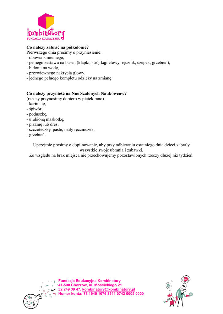 Co należy zabrać na półkolonie? Pierwszego dnia prosimy o przyniesienie: - obuwia zmiennego, - pełnego zestawu na basen (klapki, strój kąpielowy, ręcznik, czepek, grzebień), - bidonu na wodę, - przewiewnego nakrycia głowy, - jednego pełnego kompletu odzieży na zmianę. Co należy przynieść na Noc Szalonych Naukowców? (rzeczy przynosimy dopiero w piątek rano) - karimatę, - śpiwór, - poduszkę, - ulubioną maskotkę, - piżamę lub dres, - szczoteczkę, pastę, mały ręczniczek, - grzebień. Uprzejmie prosimy o dopilnowanie, aby przy odbieraniu ostatniego dnia dzieci zabrały wszystkie swoje ubrania i zabawki. Ze względu na brak miejsca nie przechowujemy pozostawionych rzeczy dłużej niż tydzień. Fundacja Edukacyjna Kombinatory 41-500 Chorzów, ul. Mościckiego 21 32 249 39 47, [email protected] Numer konta: 78 1940 1076 3111 0743 0005 0000