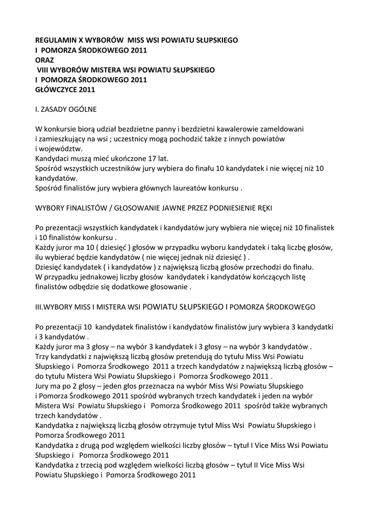 REGULAMIN X WYBORÓW MISS WSI POWIATU SŁUPSKIEGO I POMORZA ŚRODKOWEGO 2011 ORAZ VIII WYBORÓW MISTERA WSI POWIATU SŁUPSKIEGO I POMORZA ŚRODKOWEGO 2011 GŁÓWCZYCE 2011 I. ZASADY OGÓLNE W konkursie biorą udział bezdzietne panny i bezdzietni kawalerowie zameldowani i zamieszkujący na wsi ; uczestnicy mogą pochodzid także z innych powiatów i województw. Kandydaci muszą mied ukooczone 17 lat. Spośród wszystkich uczestników jury wybiera do finału 10 kandydatek i nie więcej niż 10 kandydatów. Spośród finalistów jury wybiera głównych laureatów konkursu . WYBORY FINALISTÓW / GŁOSOWANIE JAWNE PRZEZ PODNIESIENIE RĘKI Po prezentacji wszystkich kandydatek i kandydatów jury wybiera nie więcej niż 10 finalistek i 10 finalistów konkursu . Każdy juror ma 10 ( dziesięd ) głosów w przypadku wyboru kandydatek i taką liczbę głosów, ilu wybierad będzie kandydatów ( nie więcej jednak niż dziesięd ) . Dziesięd kandydatek ( i kandydatów ) z największą liczbą głosów przechodzi do finału. W przypadku jednakowej liczby głosów kandydatek i kandydatów kooczących listę finalistów odbędzie się dodatkowe głosowanie . III.WYBORY MISS I MISTERA WSI POWIATU SŁUPSKIEGO I POMORZA ŚRODKOWEGO Po prezentacji 10 kandydatek finalistów i kandydatów finalistów jury wybiera 3 kandydatki i 3 kandydatów . Każdy juror ma 3 głosy – na wybór 3 kandydatek i 3 głosy – na wybór 3 kandydatów . Trzy kandydatki z największą liczbą głosów pretendują do tytułu Miss Wsi Powiatu Słupskiego i Pomorza Środkowego 2011 a trzech kandydatów z największą liczbą głosów – do tytułu Mistera Wsi Powiatu Słupskiego i Pomorza Środkowego 2011 . Jury ma po 2 głosy – jeden głos przeznacza na wybór Miss Wsi Powiatu Słupskiego i Pomorza Środkowego 2011 spośród wybranych trzech kandydatek i jeden na wybór Mistera Wsi Powiatu Słupskiego i Pomorza Środkowego 2011 spośród także wybranych trzech kandydatów . Kandydatka z największą liczbą głosów otrzymuje tytuł Miss Wsi Powiatu Słupskiego i Pomorza Środkowego 2011 Kandydatka z drugą pod względem wielkości liczby głosów – tytuł I Vice Miss Wsi Powiatu Słupskiego i Pomorza Środkowego 2011 Kandydatka z trzecią pod względem wielkości liczbą głosów – tytuł II Vice Miss Wsi Powiatu Słupskiego i Pomorza Środkowego 2011 W przypadku jednakowej liczby głosów – następuje ponowne głosowanie . Kandydat z największą liczbą głosów otrzymuje tytuł Mistera Wsi Powiatu Słupskiego i Pomorza Środkowego 2011. Kandydat z drugą pod względem wielkości liczbą głosów – tytuł I Vice Mistera Wsi Powiatu Słupskiego i Pomorza Środkowego 2011. Kandydat z trzecią pod względem wielkości liczbą głosów – tytuł II Vice Mistera Wsi Powiatu Słupskiego i Pomorza Środkowego 2011. W przypadku jednakowej liczby głosów – następuje ponowne głosowanie. WYBÓR MISS GRACJI – WYBIERANA JEST Z WSZYSTKICH KANDYDATEK BIORĄCYCH UDZIAŁ W KONKURSIE. Każdy juror ma 1 głos (remis w głosach powoduje ponowne głosowanie). MISS PUBLICZNOŚCI – WYBIERANA JEST NA PODSTAWIE KUPONÓW ZEBRANYCH OD ZGROMADZONEJ PUBLICZNOŚCI NA IMPREZIE. MISS MIKROFONU – WYBIERANA JEST PRZEZ DZIENNIKARZY RADIOWYCH OBECNYCH NA IMPREZIE. MISS FOTO – WYBIERANA JEST PRZEZ FOTOREPORTERÓW OBECNYCH NA IMPREZIE. MISS INTERNETU – WYBIERANA JEST PRZEZ INTERNAUTÓW GAZETY PATRONUJĄCEJ IMPREZIE. MISS CZYTELNIKÓW – WYBIERANA JEST PRZEZ CZYTELNIKÓW GAZETY PATRONUJĄCEJ IMPREZIE. X. ODCZYTANIE PROTOKOŁU KOOCOWEGO ODBYWA SIĘ Z UDZIAŁEM WSZYSTKICH KANDYDATEK I KANDYDATÓW NA SCENIE.