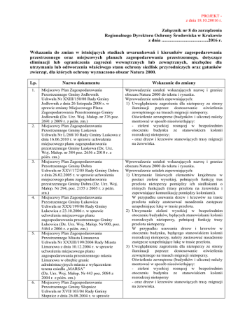 PROJEKT z dnia 18.10.20016 r. Załącznik nr 8 do zarządzenia Regionalnego Dyrektora Ochrony Środowiska w Krakowie z dnia ........................................2016 r. Wskazania do zmian w istniejących studiach uwarunkowań i kierunków zagospodarowania przestrzennego oraz miejscowych planach zagospodarowania przestrzennego, dotyczące eliminacji lub ograniczenia zagrożeń wewnętrznych lub zewnętrznych, niezbędne dla utrzymania lub odtworzenia właściwego stanu ochrony siedlisk przyrodniczych oraz gatunków zwierząt, dla których ochrony wyznaczono obszar Natura 2000. Lp. Nazwa dokumentu Wskazanie do zmiany 1. Miejscowy Plan Zagospodarowania Przestrzennego Gminy Jodłownik Uchwała Nr XXIII/150/08 Rady Gminy Jodłownik z dnia 26 listopada 2008 r. w sprawie zmiany Miejscowego Planu Zagospodarowania Przestrzennego Gminy Jodłownik (Dz. Urz. Woj. Małop. nr 376 poz. 2691 z 2009 r. z późn. zm.) Miejscowy Plan Zagospodarowania Przestrzennego Gminy Laskowa Uchwała Nr L/268/10 Rady Gminy Laskowa z dnia 16.06.2010 r. w sprawie uchwalenia miejscowego planu zagospodarowania przestrzennego Gminy Laskowa (Dz. Urz. Woj. Małop. nr 384 poz. 2656 z 2010 r. z późn. zm.) Miejscowy Plan Zagospodarowania Przestrzennego Gminy Dobra Uchwała nr XXV/172/05 Rady Gminy Dobra z dnia 26.02.2005 r. w sprawie uchwalenia miejscowego planu zagospodarowania przestrzennego Gminy Dobra (Dz. Urz. Woj. Małop. Nr 294, poz. 2155 z 2005 r. z późn. zm.) Miejscowy Plan Zagospodarowania Przestrzennego Gminy Łukowica Uchwała nr XXX/199/06 Rady Gminy Łukowica z 23.10.2006 r. w sprawie uchwalenia miejscowego planu zagospodarowania przestrzennego Gminy Łukowica (Dz. Urz. Woj. Małop. Nr 900, poz. 5464 z 2006 r. z późn. zm.) Miejscowy Plan Zagospodarowania Przestrzennego Miasta Limanowa Uchwała Nr XXXIII/199/2004 Rady Miasta Limanowa z dnia 10.12.2004 r. w sprawie uchwalenia miejscowego planu zagospodarowania przestrzennego miasta Limanowa w obrębie granic administracyjnych miasta z wyłączeniem terenu osiedla „MARSA” (Dz. Urz. Woj. Małop. Nr 443 poz. 5084 z 2004 r. z późn. zm.) Miejscowy Plan Zagospodarowania Przestrzennego Gminy Słopnice Uchwała nr XVII/103/04 Rady Gminy Słopnice z dnia 26.08.2004 r. w sprawie Wprowadzenie ustaleń wskazujących nazwę i granice obszaru Natura 2000 do tekstu i rysunku. Wprowadzenie ustaleń zapewniających: 1) Uwzględnienie zagrożenia dla nietoperzy ze strony iluminacji poprzez dostosowanie oświetlenia zewnętrznego na trasach migracji nietoperzy. Oświetlenie zewnętrzne (budynków i uliczne) należy montować w sposób nieoświetlający: - zieleni wysokiej rosnącej w bezpośrednim otoczeniu budynku ze stanowiskiem kolonii rozrodczej nietoperzy; - oraz drzew i krzewów stanowiących trasy migracji na żerowiska. 2. 3. 4. 5. 6. Wprowadzenie ustaleń wskazujących nazwę i granice obszaru Natura 2000 do tekstu i rysunku. Wprowadzenie ustaleń zapewniających: 1) Utrzymanie liniowych elementów krajobrazu w postaci zieleni wysokiej, pełniących funkcję tras przelotu nietoperzy pomiędzy ich siedliskami o różnych funkcjach (trasy przelotu na żerowiska i zapewniające komunikację pomiędzy koloniami). W przypadku usuwania drzew i krzewów na trasie przelotu należy zastosować nasadzenia zastępcze uzupełniające lukę w trasie przelotu. 2) Utrzymanie zieleni wysokiej w bezpośrednim otoczeniu budynków, będących stanowiskami kolonii rozrodczych nietoperzy, pełniącej funkcję trasy przelotu nietoperzy. W przypadku usuwania drzew i krzewów w otoczeniu budynku, będącego stanowiskiem kolonii rozrodczej nietoperzy, należy zastosować nasadzenie zastępcze uzupełniające lukę w trasie przelotu. 3) Uwzględnienie zagrożenia dla nietoperzy ze strony iluminacji poprzez dostosowanie oświetlenia zewnętrznego na trasach migracji nietoperzy. Oświetlenie zewnętrzne (budynków i uliczne) należy montować w sposób nieoświetlający: - zieleni wysokiej rosnącej w bezpośrednim otoczeniu budynku ze stanowiskiem kolonii rozrodczej nietoperzy - oraz drzew i krzewów stanowiących trasy migracji na żerowiska. PROJEKT z dnia 18.10.20016 r. 7. 8. uchwalenia miejscowego planu zagospodarowania przestrzennego Gminy Słopnice (Dz. Urz. Woj. Małop. nr 308, poz. 3281 z 2004 r. z późn. zm.) Miejscowy Plan Zagospodarowania Przestrzennego Gminy Łącko z dnia 28 lutego 2007 r. Uchwała nr 11/2007 Rady Gminy Łącko z dnia 28.02.2007 r. w sprawie uchwalenia miejscowego planu zagospodarowania przestrzennego Gminy Łącko – część „A” (Dz. Urz. Woj. Małop. nr 302z 24.04.2007 r. z późn. zm.) Studium uwarunkowań i kierunków zagospodarowania przestrzennego Gminy Limanowa Uchwała nr XVIII/118/2004 Rady Gminy Limanowa z dnia 29.04.2004 r. w sprawie uchwalenia studium uwarunkowań i kierunków zagospodarowania przestrzennego Gminy Limanowa