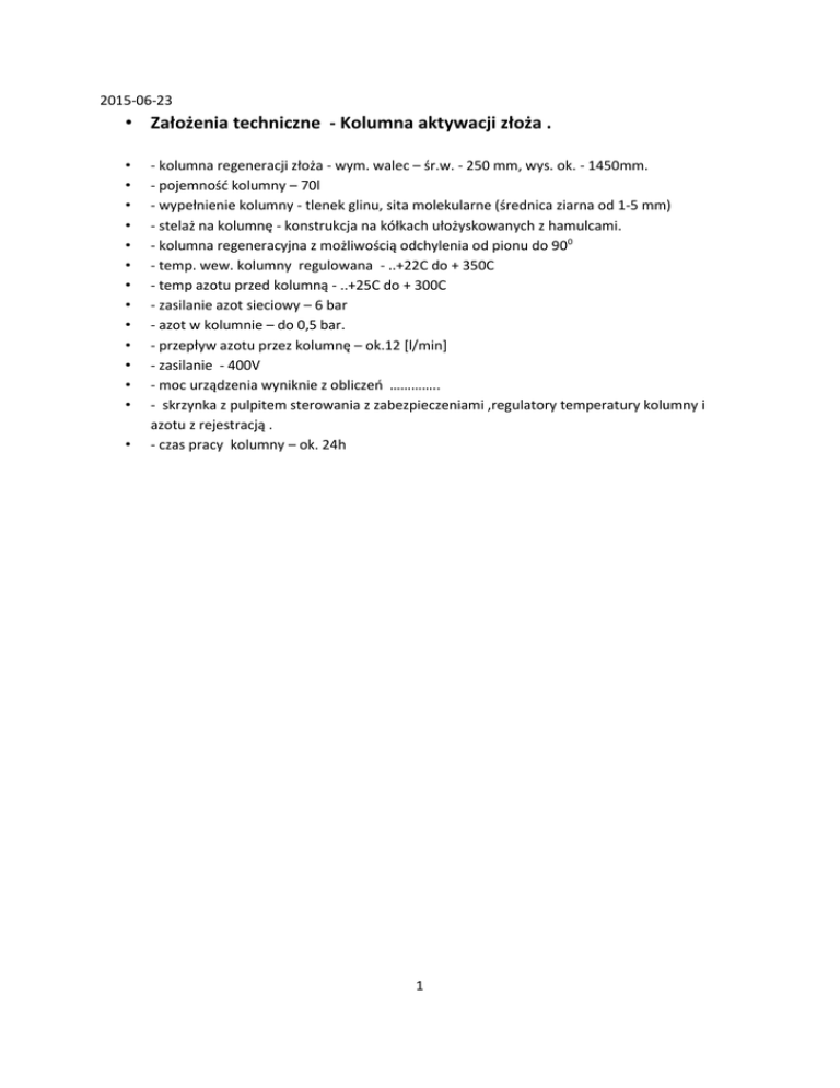 2015-06-23 • Założenia techniczne - Kolumna aktywacji złoża . • • • • • • • • • • • • • • - kolumna regeneracji złoża - wym. walec – śr.w. - 250 mm, wys. ok. - 1450mm. - pojemność kolumny – 70l - wypełnienie kolumny - tlenek glinu, sita molekularne (średnica ziarna od 1-5 mm) - stelaż na kolumnę - konstrukcja na kółkach ułożyskowanych z hamulcami. - kolumna regeneracyjna z możliwością odchylenia od pionu do 900 - temp. wew. kolumny regulowana - ..+22C do + 350C - temp azotu przed kolumną - ..+25C do + 300C - zasilanie azot sieciowy – 6 bar - azot w kolumnie – do 0,5 bar. - przepływ azotu przez kolumnę – ok.12 [l/min] - zasilanie - 400V - moc urządzenia wyniknie z obliczeń ………….. - skrzynka z pulpitem sterowania z zabezpieczeniami ,regulatory temperatury kolumny i azotu z rejestracją . - czas pracy kolumny – ok. 24h 1 rys.1 – kolumna do aktywacji złoża 16 14 17 15 18 13 12 19 11 20 10 9 8 7 21 6 5a T1-000 T2-000 t3-000 t4-000 p-000 0000 - 0000 5 4 3 22 2 1 1a 2 tabela 1. 1 l.p. Nazwa materiału-zadanie - konstrukcja stelaża stalowego podtrzymująca kolumnę – stal zwykła malowana proszkowo 1a - kółka na łożyskach z hamulcami 4 2 - zawór drenażowy umożliwiający opróżnienie kolumny z aktywowanego granulatu, może zawór typu „knife valve” ?, wielkość zaworu np. 2 lub 3 cale aby średnica była dostatecznie duża by swobodnie wysypać granulat. - uwaga: odległość dolnej części zaworu od posadzki – min. 50 cm . 1 3 - lej kolumny. 1 4 - elementy grzewcze wraz z izolacją termiczną kolumny, 1 5 - czujka temperaturowa-dolna – elektroniczna 5a - kolumna do aktywacji / regeneracji złoża stałego tj. tlenek glinu, sita molekularne (średnica ziarna od 1-5 mm) - materiał: stal 316 , wewnątrz – elektropolerowanie - wymiar kolumny - Ǿw-250mm, dł ok. 1450 mm, poj. 70l. - temp pracy wewnątrz kolumny : 20 – 4000C. 6 - skrzynka zasilająca i sterująca procesem kolumny regeneracji złoża: wyświetlacz ciekłokrystaliczny kolorowy. pomiar: - temperatury wewnątrz kolumny – 2 x 200C do 4000C - regulacja temperatury grzania płaszcza grzewczego kolumny . - regulacja płaszcza grzewczego rurociągu azotu do przedmuchiwania regenerowania granulatu. - ciśnienia wewnątrz kolumny - do 2 bar. - czas pracy urządzenia : całkowity, grzania azotem , chłodzenia azotem. 1 7 - układ łożyskowy z blokadą - umożliwiający zmianę położenia kolumny z pionu do poziomu (900) . 1 8 -czujka ciśnieniowa- elektroniczna 1 9 -manometr – do 1 bar 1 10 - czujka temperaturowa-górna 1 11 - złoże stałego tj. tlenek glinu (średnica ziarna od 1-5 mm). - temperatura pracy kolumny to 300 – 350 oC, maksymalna temperatura 400 oC 12 - pokrywa kolumny – do napełniania kolumny + zamknięcie pokrywy łatwe w otwieraniu, np. typu „swing bolt” lub „clamp”. 3 szt 1 1 13 Izolacja termiczna pokrywy. 1 14 - zawór bezpieczeństwa kolumny. 1 15 - zawór kulowy z szybkozłączką – odgazy z kolumny regeneracyjnej - Ǿ ¼” 1 16 - rotametr przepływu azotu lub przepływomierz elektroniczny – zakres uzytkowy - 0-20 l/min. 1 17 - reduktor azotu – zakres : 6 bar/0-1 bar. 1 18 - zawór z szybkozłączką - zasilania azotem kolumnę - Ǿ 1.4” . 1 19 - zawory odcinające przepływ azotu 2 20 - nagrzewnica azotu – 20 – 3500C. 1 21 - wąż giętki. 1 22 - odgazy , zawór zakończony szybkozłaczką 1 4 rys.2. – zawór nr 2 Knife valve: taki typ zaworu ze śluzą odcinającą, zawór kulowy może będzie powodował „miażdżenie” ziaren adsorbentu? . Jeżeli knife valve to taki z wajchą aby szybko można było otworzyć i zamknąć Informacje techniczne: Tadeusz Rusin tel. 33 847 38 75, 601 429 007 Oferta winna zawierać : termin realizacji warunki dostawy , warunki płatności i gwarancje 5 6