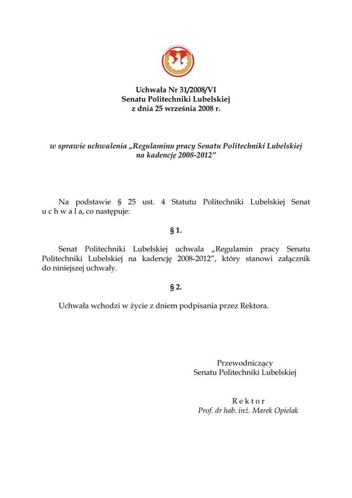 Uchwała Nr 31/2008/VI Senatu Politechniki Lubelskiej z dnia 25