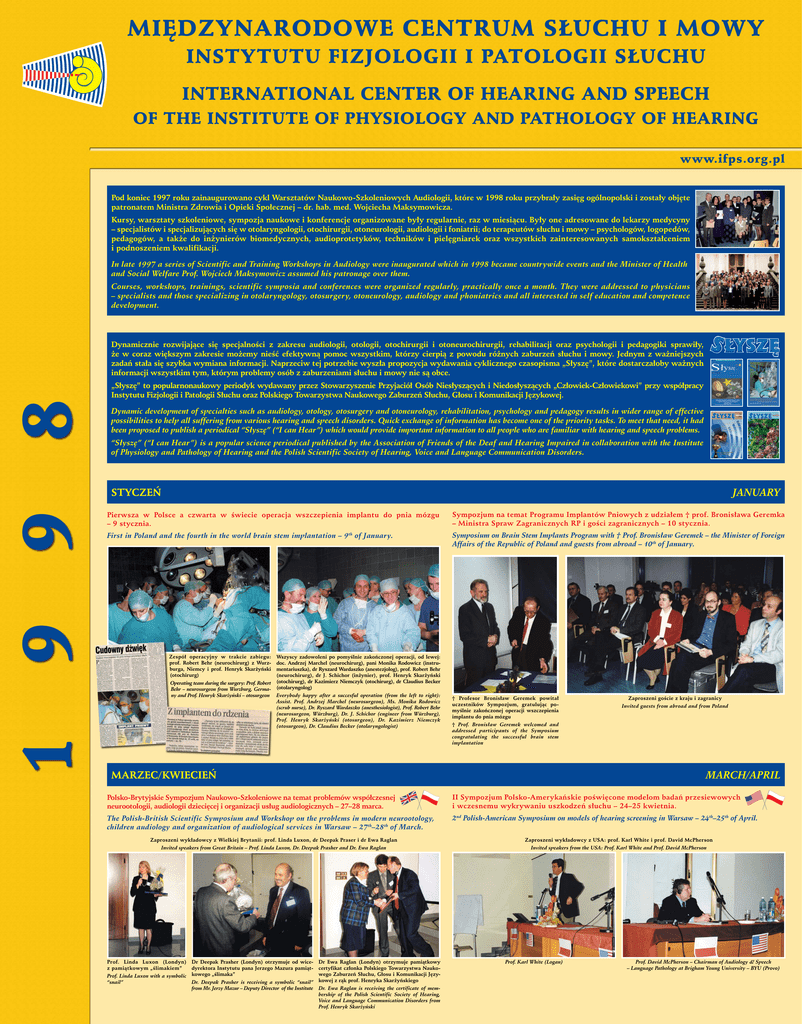 MIĘDZYNARODOWE CENTRUM SŁUCHU I MOWY INSTYTUTU FIZJOLOGII I PATOLOGII SŁUCHU INTERNATIONAL CENTER OF HEARING AND SPEECH OF THE INSTITUTE OF PHYSIOLOGY AND PATHOLOGY OF HEARING www.ifps.org.pl Pod koniec 1997 roku zainaugurowano cykl Warsztatów Naukowo-Szkoleniowych Audiologii, które w 1998 roku przybrały zasięg ogólnopolski i zostały objęte patronatem Ministra Zdrowia i Opieki Społecznej – dr. hab. med. Wojciecha Maksymowicza. Kursy, warsztaty szkoleniowe, sympozja naukowe i konferencje organizowane były regularnie, raz w miesiącu. Były one adresowane do lekarzy medycyny – specjalistów i specjalizujących się w otolaryngologii, otochirurgii, otoneurologii, audiologii i foniatrii; do terapeutów słuchu i mowy – psychologów, logopedów, pedagogów, a także do inżynierów biomedycznych, audioprotetyków, techników i pielęgniarek oraz wszystkich zainteresowanych samokształceniem i podnoszeniem kwalifikacji. In late 1997 a series of Scientific and Training Workshops in Audiology were inaugurated which in 1998 became countrywide events and the Minister of Health and Social Welfare Prof. Wojciech Maksymowicz assumed his patronage over them. Courses, workshops, trainings, scientific symposia and conferences were organized regularly, practically once a month. They were addressed to physicians – specialists and those specializing in otolaryngology, otosurgery, otoneurology, audiology and phoniatrics and all interested in self education and competence development. 8 Dynamicznie rozwijające się specjalności z zakresu audiologii, otologii, otochirurgii i otoneurochirurgii, rehabilitacji oraz psychologii i pedagogiki sprawiły, że w coraz większym zakresie możemy nieść efektywną pomoc wszystkim, którzy cierpią z powodu różnych zaburzeń słuchu i mowy. Jednym z ważniejszych zadań stała się szybka wymiana informacji. Naprzeciw tej potrzebie wyszła propozycja wydawania cyklicznego czasopisma „Słyszę”, które dostarczałoby ważnych informacji wszystkim tym, którym problemy osób z zaburzeniami słuchu i mowy nie są obce. „Słyszę” to popularnonaukowy periodyk wydawany przez Stowarzyszenie Przyjaciół Osób Niesłyszących i Niedosłyszących „Człowiek-Człowiekowi” przy współpracy Instytutu Fizjologii i Patologii Słuchu oraz Polskiego Towarzystwa Naukowego Zaburzeń Słuchu, Głosu i Komunikacji Językowej. Dynamic development of specialties such as audiology, otology, otosurgery and otoneurology, rehabilitation, psychology and pedagogy results in wider range of effective possibilities to help all suffering from various hearing and speech disorders. Quick exchange of information has become one of the priority tasks. To meet that need, it had been proposed to publish a periodical “Słyszę” (“I can Hear”) which would provide important information to all people who are familiar with hearing and speech problems. “Słyszę” (“I can Hear”) is a popular science periodical published by the Association of Friends of the Deaf and Hearing Impaired in collaboration with the Institute of Physiology and Pathology of Hearing and the Polish Scientific Society of Hearing, Voice and Language Communication Disorders. JANUARY 9 9 STYCZEŃ Pierwsza w Polsce a czwarta w świecie operacja wszczepienia implantu do pnia mózgu – 9 stycznia. Sympozjum na temat Programu Implantów Pniowych z udziałem † prof. Bronisława Geremka – Ministra Spraw Zagranicznych RP i gości zagranicznych – 10 stycznia. First in Poland and the fourth in the world brain stem implantation – 9th of January. Symposium on Brain Stem Implants Program with † Prof. Bronisław Geremek – the Minister of Foreign Affairs of the Republic of Poland and guests from abroad – 10th of January. Zespół operacyjny w trakcie zabiegu: prof. Robert Behr (neurochirurg) z Wurzburga, Niemcy i prof. Henryk Skarżyński (otochirurg) 1 Operating team during the surgery: Prof. Robert Behr – neurosurgeon from Wurzburg, Germany and Prof. Henryk Skarżyński – otosurgeon Wszyscy zadowoleni po pomyślnie zakończonej operacji, od lewej: doc. Andrzej Marchel (neurochirurg), pani Monika Rodowicz (instrumentariuszka), dr Ryszard Wardaszko (anestezjolog), prof. Robert Behr (neurochirurg), dr J. Schichor (inżynier), prof. Henryk Skarżyński (otochirurg), dr Kazimierz Niemczyk (otochirurg), dr Claudius Becker (otolaryngolog) Everybody happy after a succesful operation (from the left to right): Assist. Prof. Andrzej Marchel (neurosurgeon), Ms. Monika Rodowicz (scrub nurse), Dr. Ryszard Wardaszko (anesthesiologist), Prof. Robert Behr (neurosurgeon, Würzburg), Dr. J. Schichor (engineer from Würzburg), Prof. Henryk Skarżyński (otosurgeon), Dr. Kazimierz Niemczyk (otosurgeon), Dr. Claudius Becker (otolaryngologist) † Profesor Bronisław Geremek powitał uczestników Sympozjum, gratulując pomyślnie zakończonej operacji wszczepienia implantu do pnia mózgu Zaproszeni goście z kraju i zagranicy Invited guests from abroad and from Poland † Prof. Bronisław Geremek welcomed and addressed participants of the Symposium congratulating the successful brain stem implantation MARCH/APRIL MARZEC/KWIECIEŃ Polsko-Brytyjskie Sympozjum Naukowo-Szkoleniowe na temat problemów współczesnej neurootologii, audiologii dziecięcej i organizacji usług audiologicznych – 27–28 marca. II Sympozjum Polsko-Amerykańskie poświęcone modelom badań przesiewowych i wczesnemu wykrywaniu uszkodzeń słuchu – 24–25 kwietnia. The Polish-British Scientific Symposium and Workshop on the problems in modern neurootology, children audiology and organization of audiological services in Warsaw – 27th–28th of March. 2nd Polish-American Symposium on models of hearing screening in Warsaw – 24th–25th of April. Zaproszeni wykładowcy z Wielkiej Brytanii: prof. Linda Luxon, dr Deepak Praser i dr Ewa Raglan Zaproszeni wykładowcy z USA: prof. Karl White i prof. David McPherson Invited speakers from Gr