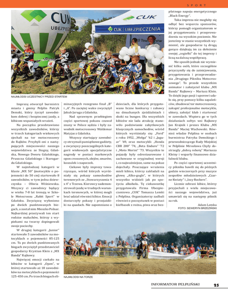 S P O R T NAJMŁODSI UCZESTNICY PRZED STARTEM Imprezę otworzył burmistrz miasta i gminy Pelplin Patryk Demski, który życzył zawodnikom dobrej i bezpiecznej jazdy, a kibicom wspaniałych wrażeń. Na początku przedstawiono wszystkich zawodników, którzy w trzech kategoriach wiekowych zjechali na tor motocrossowy do Rajków. Przybyli oni z następujących miejscowości naszego województwa: ze Stegny, Gdańska, Nowego Dworu Gdańskiego, Pruszcza Gdańskiego i Starogardu Gdańskiego. W najmłodszej kategorii w klasie „MX 50” (motocykle o pojemności do 50 cm) startowało 8 zawodników, w tym jedna dziewczynka – Oliwia Wiśniewska. Wszyscy ci zawodnicy będący w wieku 7-8 lat trenują w Szkole Motocrossu „Rabit Sport” w Gdańsku. Zwycięzcę wyłoniono po dwóch punktowanych biegach, a został nim Mieszko Polnar. Najbardziej przeżywali ten start rodzice maluchów, którzy z wypiekami na twarzy dopingowali swoje pociechy. W drugiej kategorii „Junior” startowało 5 zawodników na motocyklach o pojemności 85-125 cm. Tu po dwóch punktowanych biegach zwyciężył przedstawiciel gospodarzy Krystian Klein z „MX Banda” Rajkowy. Najwięcej emocji czekało na kibiców w kategorii „Open”, w której startowało aż 18 zawodników na motocyklach o pojemności 125-450 cm. Po trzech biegach eli- minacyjnych rozegrano finał „B” i „A”. Po zaciętej walce zwyciężył Jakub Jaruga z Gdańska. Nad sprawnym przebiegiem części sportowej pokazu czuwał znany w Polsce sędzia i były zawodnik motocrossowy Waldemar Matyjas z Gdańska. Wszyscy startujący zawodnicy otrzymali pamiątkowe gadżety, a zwycięzcy poszczególnych kategorii wiekowych specjalistyczne nagrody w postaci markowych opon crossowych, olejów, smarów, koszulek i czapeczek. Ciekawe były imprezy towarzyszące, wśród których wyróżniały się pokazy samochodów terenowych ze „Stowarzyszenia 4 x 4” z Tczewa. Kierowcy zademonstrowali jazdę w trudnych warunkach terenowych, w której mogli brać udział również kibice. Emocji dostarczyły pokazy i przejażdżki na quadach. Nie zapomniano o dzieciach, dla których przygotowano liczne konkursy i zabawy na dmuchanych zjeżdżalniach i skoki na bungee. Dla wszystkich kibiców nie lada atrakcję stanowiło podziwianie zabytkowych klasycznych samochodów, wśród których wyróżniały się: „Ford” z roku 1952, „Wołga” ’62 i „Jaguar” ’69, oraz motocykli: „Honda CBR 200” ’74, „Beta Enduro” ’72 i „Moto Morini” ’73. Wszystkie te pojazdy były odrestaurowane i zachowane w oryginalnej wersji i, co najważniejsze, same na pokaz dojechały. Pouczające wrażenia mieli kibice, którzy zakładali na głowę „Alko-gogle”, w których wszystko widzieli jak po spożyciu alkoholu. Tę ciekawostkę przygotowała Firma Ubezpieczeniowa „CUK” Tomasza Lemki z Pelplina. Organizatorzy zadbali również o poczęstunek w postaci kiełbasek z rożna, piwa oraz bez- płatnego napoju energetycznego „Black Energy”. Taka impreza nie mogłaby się odbyć bez wsparcia sponsorów, którzy pomogli organizatorom w jej przygotowaniu i przeprowadzeniu na wysokim poziomie. Nie jesteśmy w stanie wszystkich wymienić, ale gospodarze tą drogą gorąco dziękują im za dołożenie swojej „cegiełki” do tej imprezy i liczą na dalszą współpracę. Nie sposób jednak nie wymienić kilku osób, które szczególnie przyczyniły się do zainicjowania, przygotowania i przeprowadzenia „Drugiego Pikniku Motocrossowego”. To przede wszystkim animator i założyciel klubu „MX Banda” Rajkowy – Mariusz Klein. To dzięki jego pasji i uporowi udało się, przy pomocy kilku zapaleńców, zbudować tor motocrossowy, zakupić profesjonalne motocykle, ubiory, założyć klub i startować w zawodach. Wspiera go w tych działaniach sołtys wsi Rajkowy Jan Krajnik i prezes Klubu „MX Banda” Maciej Wachowski. Również władze Pelplina w osobach burmistrza Patryka Demskiego i przewodniczącego Rady Miejskiej w Pelplinie Mirosława Chyły dostrzegły „dobrą robotę” Mariusza Kleiny i wsparły finansowo działalność klubu. Po części sportowej uczestnicy pikniku bawili się do późnych godzin wieczornych przy muzyce zespołów młodzieżowych „Czarne Kwiaty” i „Izzy Rockers”. Licznie zebrani kibice, którzy przyjechali z wielu miejscowości naszego województwa, już umawiali się na następny piknik za rok. Adam Lemka FOTO: SEWERYN BRZEZIŃSKI NAJMŁODSI NA TORZE INFORMATOR PELPLIŃSKI 25