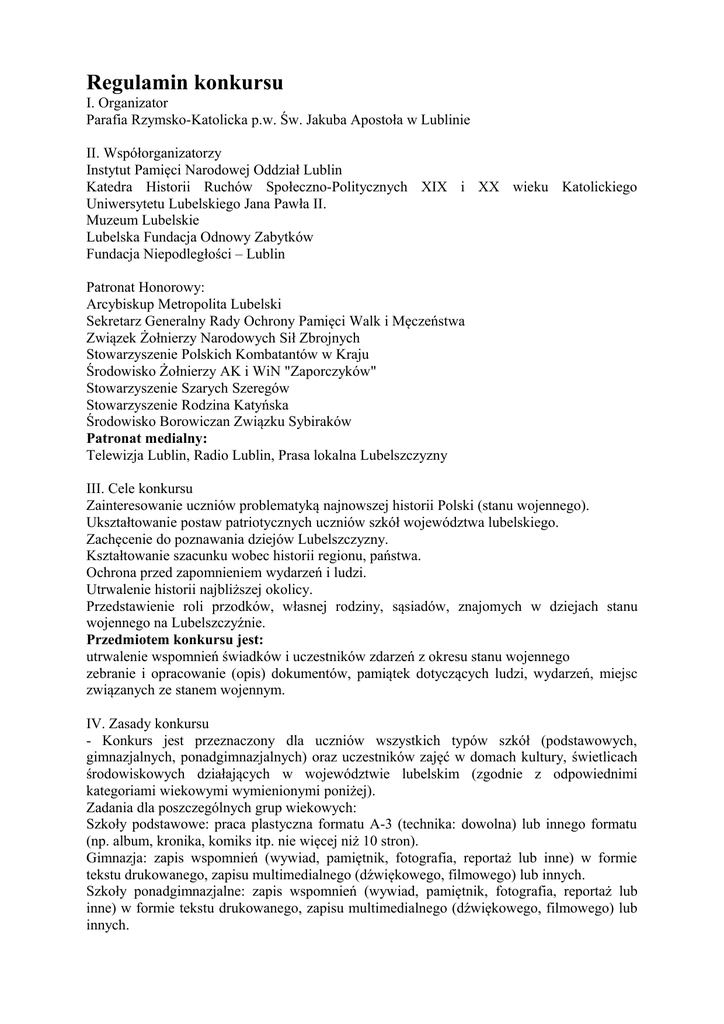 Regulamin konkursu I. Organizator Parafia Rzymsko-Katolicka p.w. Św. Jakuba Apostoła w Lublinie II. Współorganizatorzy Instytut Pamięci Narodowej Oddział Lublin Katedra Historii Ruchów Społeczno-Politycznych XIX i XX wieku Katolickiego Uniwersytetu Lubelskiego Jana Pawła II. Muzeum Lubelskie Lubelska Fundacja Odnowy Zabytków Fundacja Niepodległości – Lublin Patronat Honorowy: Arcybiskup Metropolita Lubelski Sekretarz Generalny Rady Ochrony Pamięci Walk i Męczeństwa Związek Żołnierzy Narodowych Sił Zbrojnych Stowarzyszenie Polskich Kombatantów w Kraju Środowisko Żołnierzy AK i WiN "Zaporczyków" Stowarzyszenie Szarych Szeregów Stowarzyszenie Rodzina Katyńska Środowisko Borowiczan Związku Sybiraków Patronat medialny: Telewizja Lublin, Radio Lublin, Prasa lokalna Lubelszczyzny III. Cele konkursu Zainteresowanie uczniów problematyką najnowszej historii Polski (stanu wojennego). Ukształtowanie postaw patriotycznych uczniów szkół województwa lubelskiego. Zachęcenie do poznawania dziejów Lubelszczyzny. Kształtowanie szacunku wobec historii regionu, państwa. Ochrona przed zapomnieniem wydarzeń i ludzi. Utrwalenie historii najbliższej okolicy. Przedstawienie roli przodków, własnej rodziny, sąsiadów, znajomych w dziejach stanu wojennego na Lubelszczyźnie. Przedmiotem konkursu jest: utrwalenie wspomnień świadków i uczestników zdarzeń z okresu stanu wojennego zebranie i opracowanie (opis) dokumentów, pamiątek dotyczących ludzi, wydarzeń, miejsc związanych ze stanem wojennym. IV. Zasady konkursu - Konkurs jest przeznaczony dla uczniów wszystkich typów szkół (podstawowych, gimnazjalnych, ponadgimnazjalnych) oraz uczestników zajęć w domach kultury, świetlicach środowiskowych działających w województwie lubelskim (zgodnie z odpowiednimi kategoriami wiekowymi wymienionymi poniżej). Zadania dla poszczególnych grup wiekowych: Szkoły podstawowe: praca plastyczna formatu A-3 (technika: dowolna) lub innego formatu (np. album, kronika, komiks itp. nie więcej niż 10 stron). Gimnazja: zapis wspomnień (wywiad, pamiętnik, fotografia, reportaż lub inne) w formie tekstu drukowanego, zapisu multimedialnego (dźwiękowego, filmowego) lub innych. Szkoły ponadgimnazjalne: zapis wspomnień (wywiad, pamiętnik, fotografia, reportaż lub inne) w formie tekstu drukowanego, zapisu multimedialnego (dźwiękowego, filmowego) lub innych. - Prace przesyłane na Konkurs nie mogą być pracami zgłaszanymi do innych konkursów tego typu. - Dopuszcza się prace zbiorowe (wykonane przez grupę kilku uczniów). Jeśli uczniowie są z różnych typów szkół uznaje się, że są zgłoszone w konkursie wiekowym takim, jaki jest najstarszy uczestnik grupy. - Dopuszcza się pracę o objętości do 15 stron i dodatkowo aneksy: np. zdjęcia, kserokopie dokumentów, szkice, obrazy, mapy, itp. Organizatorzy dopuszczają także inne formy prac konkursowych. Mogą to być dowolne prace, ważne aby przedstawiały ludzi, miejsca, wydarzenia związane ze stanem wojennym. Fotografie, dokumenty przyjmowane są w formie kopii (skan, ksero, forma elektroniczna). W przypadku dostarczenia wspomnień, relacji uczestników wydarzeń, należy zamieścić dane identyfikacyjne osoby (imię, nazwisko, pseudonimy, data i miejsce urodzenia, miejsce zamieszkania). W przypadku braku zgody osoby (respondenta) prosimy o zamieszczenie inicjałów. Do prac konkursowych należy dołączyć: 1. kartę uczestnika konkursu (załącznik nr 1) 2. zgodę pełnoletniego autora, ewentualnie rodziców lub opiekunów prawnych w przypadku uczestników niepełnoletnich na bezpłatne wykorzystanie pracy w druku, publikacje internetowe, ogłoszenie wyników konkursu, wyeksponowanie w innych miejscach z podaniem danych osobowych autora w celu popularyzacji konkursu zgodnie z przepisami Ustawy z 29 sierpnia 1997 r. o ochronie danych osobowych (załącznik nr 2A lub 2B). Prace przesyłane są za pośrednictwem szkół, placówek, o których mowa w pkt. III, lub indywidualnie. Z każdej szkoły może brać udział dowolna liczba uczestników. Prace nie będę zwracane uczestnikom konkursu i pozostaną w zbiorach organizatora Konkursu. Organizatorzy dopuszczają możliwość skatalogowania prac i rozpowszechniania ich w różnych formach w całości lub fragmentach. V. Termin nadsyłania prac Prace należy dostarczyć na adres: Parafia Rzymsko-Katolicka pw. Św. Jakuba Apostoła w Lublinie, ul. Głuska 145, 20-385 Lublin (z dopiskiem Konkurs historyczny) do dnia 10 października 2011 r. (w przypadku przesłania pocztą decyduje data stempla pocztowego). VI. Rozstrzygnięcie konkursu 1. Prace będą oceniane przez komisję powołaną przez organizatorów. 2. Komisja przy ocenie będzie kierowała się kryterium estetycznym i merytorycznym. 3. Autorzy najciekawszych prac zostaną nagrodzeni, a prace - w miarę możliwości - zostaną opublikowane. 4. Decyzje Komisji Konkursowej są ostateczne i nie podlegają weryfikacji lub zaskarżeniu. 5. Wyniki Konkursu zostaną umieszczone na stronie internetowej, przekazane mediom (do dnia 30 października 2011 r.), a laureaci wraz z opiekunami za pośrednictwem szkół, placówek wymienionych w pkt. III, lub indywidualnie zaproszeni na uroczyste wręczenie nagród i wyróżnień. VII. Nagrody 1. Laptop lub komputer 2. Aparaty fotograficzne (cyfrowe) 3. Programy komputerowe (edukacyjne) 4. Drukarka 5. Sztalugi, zestaw farb i pędzli 6. Odtwarzacz MP3 7. Ksiązki historyczne Nagrody dla szkół: Najliczniej reprezentowane szkoły (jedna w każdej kategorii szkół) otrzymają upominki. Inne nagrody i wyróżnienia: Uczestnicy Konkursu, ich opiekunowie oraz szkoły otrzymają okolicznościowe dyplomy. W każdej kategorii wiekowej poza nagrodami rzeczowymi laureaci oraz ich opiekunowie otrzymają upominki książkowe. Nagrody w postaci książek i publikacji otrzymają także - w miarę możliwości - uczestnicy konkursu, którzy zajmą dalsze miejsca. W przypadku publikac
