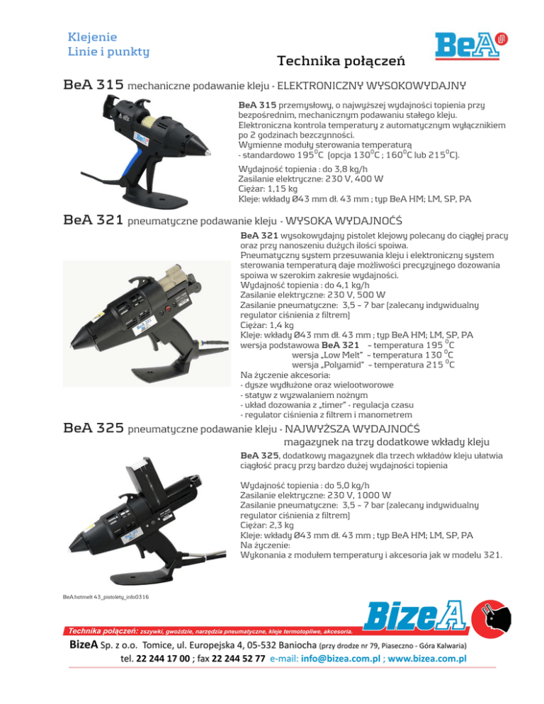 Klejenie Linie i punkty Technika połączeń BeA 315 mechaniczne podawanie kleju - ELEKTRONICZNY WYSOKOWYDAJNY BeA 315 przemysłowy, o najwyższej wydajności topienia przy bezpośrednim, mechanicznym podawaniu stałego kleju. Elektroniczna kontrola temperatury z automatycznym wyłącznikiem po 2 godzinach bezczynności. Wymienne moduły sterowania temperaturą 0 0 0 0 - standardowo 195 C (opcja 130 C ; 160 C lub 215 C). Wydajność topienia : do 3,8 kg/h Zasilanie elektryczne: 230 V, 400 W Ciężar: 1,15 kg Kleje: wkłady Ø43 mm dł. 43 mm ; typ BeA HM; LM, SP, PA BeA 321 pneumatyczne podawanie kleju - WYSOKA WYDAJNOĆŚ BeA 321 wysokowydajny pistolet klejowy polecany do ciągłej pracy oraz przy nanoszeniu dużych ilości spoiwa. Pneumatyczny system przesuwania kleju i elektroniczny system sterowania temperaturą daje możliwości precyzyjnego dozowania spoiwa w szerokim zakresie wydajności. Wydajność topienia : do 4,1 kg/h Zasilanie elektryczne: 230 V, 500 W Zasilanie pneumatyczne: 3,5 – 7 bar (zalecany indywidualny regulator ciśnienia z filtrem) Ciężar: 1,4 kg Kleje: wkłady Ø43 mm dł. 43 mm ; typ BeA HM; LM, SP, PA 0 wersja podstawowa BeA 321 – temperatura 195 C 0 wersja „Low Melt” – temperatura 130 C 0 wersja „Polyamid” – temperatura 215 C Na życzenie akcesoria: - dysze wydłużone oraz wielootworowe - statyw z wyzwalaniem nożnym - układ dozowania z „timer” - regulacja czasu - regulator ciśnienia z filtrem i manometrem BeA 325 pneumatyczne podawanie kleju - NAJWYŻSZA WYDAJNOĆŚ magazynek na trzy dodatkowe wkłady kleju BeA 325, dodatkowy magazynek dla trzech wkładów kleju ułatwia ciągłość pracy przy bardzo dużej wydajności topienia Wydajność topienia : do 5,0 kg/h Zasilanie elektryczne: 230 V, 1000 W Zasilanie pneumatyczne: 3,5 – 7 bar (zalecany indywidualny regulator ciśnienia z filtrem) Ciężar: 2,3 kg Kleje: wkłady Ø43 mm dł. 43 mm ; typ BeA HM; LM, SP, PA Na życzenie: Wykonania z modułem temperatury i akcesoria jak w modelu 321. BeA hotmelt 43_pistolety_info0316