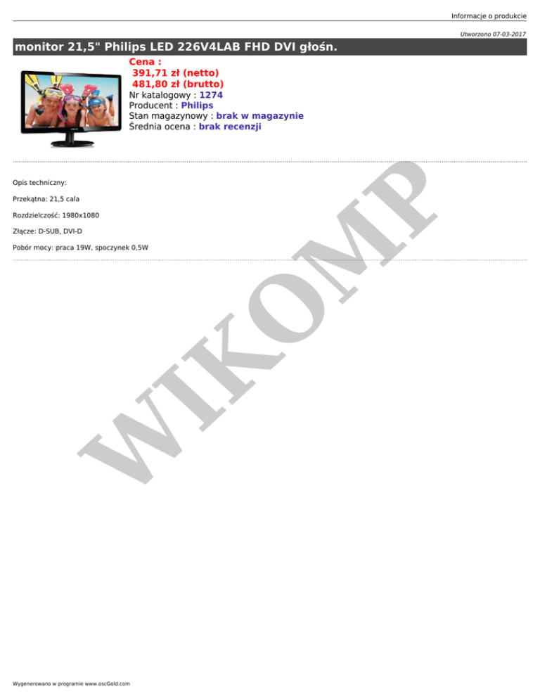 Informacje o produkcie Utworzono 07-03-2017 monitor 21,5" Philips LED 226V4LAB FHD DVI głośn. Cena : 391,71 zł (netto) 481,80 zł (brutto) Nr katalogowy : 1274 Producent : Philips Stan magazynowy : brak w magazynie Średnia ocena : brak recenzji Opis techniczny: P Przekątna: 21,5 cala Rozdzielczość: 1980x1080 W IK Pobór mocy: praca 19W, spoczynek 0,5W O M Złącze: D-SUB, DVI-D Wygenerowano w programie www.oscGold.com