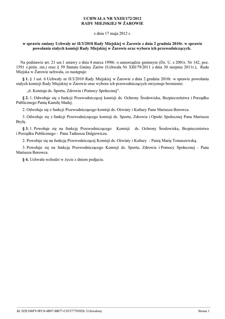 UCHWAŁA NR XXIII/172/2012 RADY MIEJSKIEJ W ŻAROWIE z dnia 17 maja 2012 r. w sprawie zmiany Uchwały nr II/3/2010 Rady Miejskiej w Żarowie z dnia 2 grudnia 2010r. w sprawie powołania stałych komisji Rady Miejskiej w Żarowie oraz wyboru ich przewodniczących. Na podstawie art. 21 ust.1 ustawy z dnia 8 marca 1990r. o samorządzie gminnym (Dz. U. z 2001r. Nr 142, poz. 1591 z późn. zm.) oraz § 59 Statutu Gminy Żarów (Uchwała Nr XIII/79/2011 z dnia 30 sierpnia 2011r.), Rada Miejska w Żarowie uchwala, co następuje: § 1. § 1 ust. 6 Uchwały nr II/3/2010 Rady Miejskiej w Żarowie z dnia 2 grudnia 2010r. w sprawie powołania stałych komisji Rady Miejskiej w Żarowie oraz wyboru ich przewodniczących otrzymuje brzmienie: „6. Komisja ds. Sportu, Zdrowia i Pomocy Społecznej”. § 2. 1. Odwołuje się z funkcji Przewodniczącej komisji ds. Ochrony Środowiska, Bezpieczeństwa i Porządku Publicznego Panią Kamilę Madej. 2. Odwołuje się z funkcji Przewodniczącego komisji ds. Oświaty i Kultury Pana Mariusza Borowca. 3. Odwołuje się z funkcji Przewodniczącego komisji ds. Sportu, Zdrowia i Opieki Spolecznej Pana Mariusza Bryłę. § 3. 1. Powołuje się na funkcję Przewodniczącego i Porządku Publicznego - Pana Tadeusza Dalgiewicza. Komisji ds. Ochrony Środowiska, Bezpieczeństwa 2. Powołuje się na funkcję Przewodniczącej Komisji ds. Oświaty i Kultury - Panią Marię Tomaszewską. 3. Powołuje się na funkcję Przewodniczącego Komisji ds. Sportu, Zdrowia i Pomocy Społecznej - Pana Mariusza Borowca. § 4. Uchwała wchodzi w życie z dniem podjęcia. ————————————————————————————————————————————————————————— Id: D2E100F9-9FC0-4B97-BB77-C83377785026. Uchwalony Strona 1 Uzasadnienie Zmiana dotychczasowej nazwy Komisji ds. Sportu, Zdrowia i Opieki Społecznej wynika z faktu wyeliminowania w nazewnictwie ustawy o pomocy społecznej (tj. Dz. U. z 2009r. Nr 175, poz. 1362 z późn. zm.) określenia "opieka społeczna" i stosowaniu określenia "pomoc społeczna". W dniu 10.04.2012r. Pani Kamila Madej na ręce Przewodniczącego Rady Miejskiej w Żarowie złożyła pismo o rezygnacji z funkcji Przewodniczącej Komisji ds. Ochrony Środowiska, Bezpieczeństwa i Porządku Publicznego oraz wyrażeniu chęci pozostania w w/w komisji jako członek. W dniu 12.04.2012r. Przewodniczący Rady Miejskiej w Żarowie otrzymał pismo od Pana Mariusza Borowca o rezygnacji z funkcji Przewodniczącego Komisji ds. Oświaty i Kultury. W dniu 12.04.2012r. na ręce Przewodniczącego Rady Miejskiej w Żarowie złożył pismo o rezygnacji z pełnienia funkcji Przewodniczącego Komisji ds. Sportu, Zdrowia i Opieki Społecznej Pan Mariusz Bryła i wyraził chęć dalszej pracy w w/w komisji jako jej członek. Konsekwencją złożenia pisemnej rezygnacji z funkcji Przewodniczących stałych komisji Rady Miejskiej w Żarowie jest odwołanie Pani Kamili Madej z funkcji Przewodniczącej Komisji ds. Ochrony Środowiska, Bezpieczeństwa i Porządku Publicznego, Pana Mariusza Borowca z funkcji Przewodniczącego Komisji ds. Oświaty i Kultury oraz Pana Mariusza Bryły z funkcji Przewodniczącego Komisji ds. Sportu, Zdrowia i Opieki Społecznej. W związku z czym Rada Miejska w Żarowie zobowiązana jest do wyboru nowych przewodniczących w/w stałych komisji Rady. W związku z powyższym podjęcie uchwały jest zasadne. Sporządziła: Agnieszka Szykowna - inspektor ds. obsługi Rady Miejskiej i organizacji pozarządowych. ————————————————————————————————————————————————————————— Id: D2E100F9-9FC0-4B97-BB77-C83377785026. Uchwalony Strona 1
