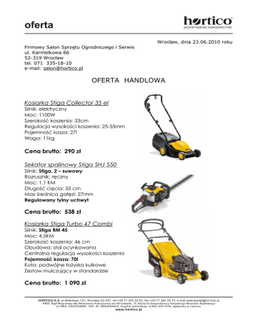 Wrocław, dnia 23.06.2010 roku Firmowy Salon Sprzętu Ogrodniczego i Serwis ul. Karmelkowa 66 52-319 Wrocław tel. 071 335-18-10 e-mail: [email protected] OFERTA HANDLOWA Kosiarka Stiga Collector 35 el Silnik: elektryczny Moc: 1100W Szerokość koszenia: 33cm Regulacja wysokości koszenia: 25-55mm Pojemność kosza: 27l Waga: 11kg Cena brutto: 290 zł Sekator spalinowy Stiga SHJ 550 Silnik: Stiga, 2 – suwowy Rozrusznik: ręczny Moc: 1,1 KM Długość cięcia: 55 cm Max średnica gałęzi: 27mm Regulowany tylny uchwyt Cena brutto: 538 zł Kosiarka Stiga Turbo 47 Combi Silnik: Stiga RM 45 Moc: 4,5KM Szerokość koszenia: 46 cm Obudowa: stal ocynkowana Centralna regulacja wysokości koszenia Pojemność kosza: 70l Koła: podwójne łożyska kulkowe Zestaw mulczujący w standardzie Cena brutto: 1 090 zł Kosa spalinowa Stiga SB 34D Silnik: Stiga, 2-suwowy Pojemność skokowa: 32,6cm3 Na wyposażeniu: głowica żyłkowa oraz nóż Podwójne pasy nośne System antywibracyjny Waga: 5,7kg Cena brutto: 631 zł Kosiarka samojezdna Stiga Estate Collector Silnik: Briggs&Stratton Moc: 13,5KM Szerokość koszenia: 90 cm Pojemność kosza: 210l Regulacja wysokości koszenia: 25-80mm Rozrusznik elektryczny Skrzynia biegów: 5+R Dźwiękowe ostrzeżenie o pełnym koszu Cena brutto: 7 598 zł Na te modele producenci udzielają dwuletniej gwarancji w przypadku zakupu konsumenckiego (paragon). Przy zakupie na fakturę gwarancja wynosi jeden rok. W przypadku pytań proszę o kontakt. Z poważaniem Jakub Kolasa 601 404 361