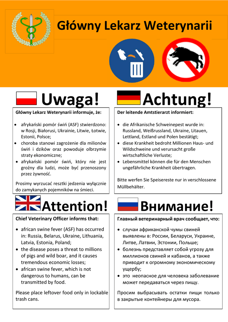Główny Lekarz Weterynarii Uwaga! Achtung! Główny Lekarz Weterynarii informuje, że: Der leitende Amtstierarzt informiert: afrykański pomór świń (ASF) stwierdzono: w Rosji, Białorusi, Ukrainie, Litwie, Łotwie, Estonii, Polsce; choroba stanowi zagrożenie dla milionów świń i dzików oraz powoduje olbrzymie straty ekonomiczne; afrykański pomór świń, który nie jest groźny dla ludzi, może być przenoszony przez żywność. die Afrikanische Schweinepest wurde in: Russland, Weißrussland, Ukraine, Litauen, Lettland, Estland und Polen bestätigt; diese Krankheit bedroht Millionen Haus- und Wildschweine und verursacht große wirtschaftliche Verluste; Lebensmittel können die für den Menschen ungefährliche Krankheit übertragen. Prosimy wyrzucać resztki jedzenia wyłącznie do zamykanych pojemników na śmieci. Attention! Bitte werfen Sie Speisereste nur in verschlossene Müllbehälter. Внимание! Chief Veterinary Officer informs that: Главный ветеринарный врач cообщает, что: african swine fever (ASF) has occurred in: Russia, Belarus, Ukraine, Lithuania, Latvia, Estonia, Poland; the disease poses a threat to millions of pigs and wild boar, and it causes tremendous economic losses; african swine fever, which is not dangerous to humans, can be transmitted by food. случаи африканской чумы свиней выявлены в: России, Беларуси, Украине, Литве, Латвии, Эстонии, Польше; болезнь пpeдcтaвляет собой yгpoзy для миллионoв свиней и кабанов, а также приводит к огромному экономическому ущербу; это неопаснoe для человека заболевание может передаватьcя чepeз пищу. Please place leftover food only in lockable trash cans. Просим выбрaсывaть остатки пищи только в закрытые контейнеры для мусора.