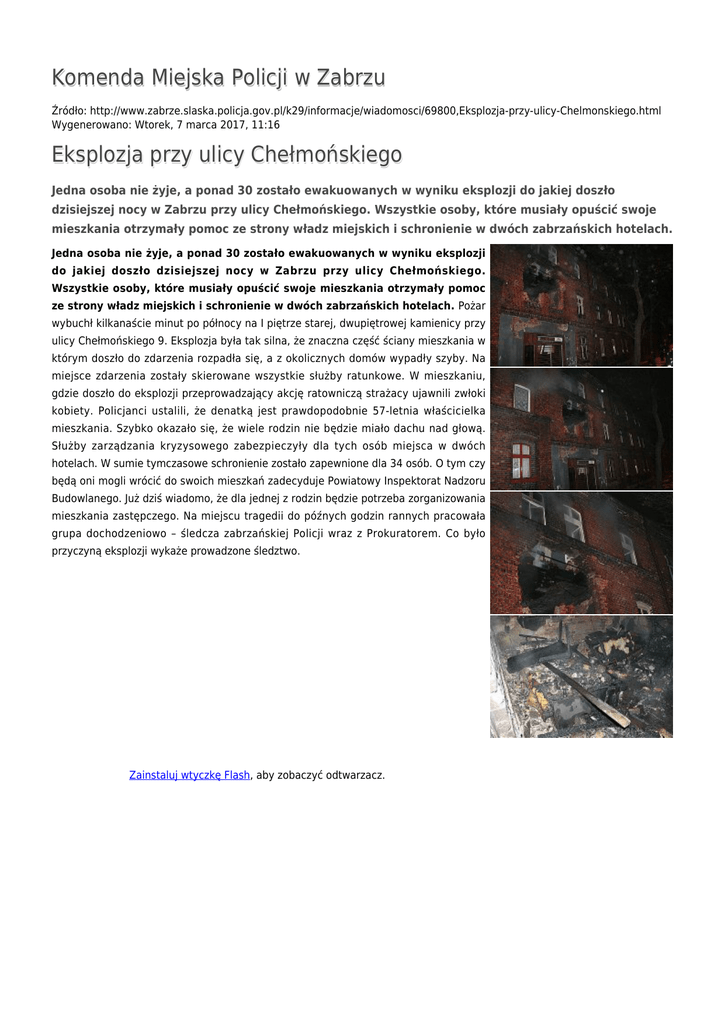 Komenda Miejska Policji w Zabrzu Źródło: http://www.zabrze.slaska.policja.gov.pl/k29/informacje/wiadomosci/69800,Eksplozja-przy-ulicy-Chelmonskiego.html Wygenerowano: Wtorek, 7 marca 2017, 11:16 Eksplozja przy ulicy Chełmońskiego Jedna osoba nie żyje, a ponad 30 zostało ewakuowanych w wyniku eksplozji do jakiej doszło dzisiejszej nocy w Zabrzu przy ulicy Chełmońskiego. Wszystkie osoby, które musiały opuścić swoje mieszkania otrzymały pomoc ze strony władz miejskich i schronienie w dwóch zabrzańskich hotelach. Jedna osoba nie żyje, a ponad 30 zostało ewakuowanych w wyniku eksplozji do jakiej doszło dzisiejszej nocy w Zabrzu przy ulicy Chełmońskiego. Wszystkie osoby, które musiały opuścić swoje mieszkania otrzymały pomoc ze strony władz miejskich i schronienie w dwóch zabrzańskich hotelach. Pożar wybuchł kilkanaście minut po północy na I piętrze starej, dwupiętrowej kamienicy przy ulicy Chełmońskiego 9. Eksplozja była tak silna, że znaczna część ściany mieszkania w którym doszło do zdarzenia rozpadła się, a z okolicznych domów wypadły szyby. Na miejsce zdarzenia zostały skierowane wszystkie służby ratunkowe. W mieszkaniu, gdzie doszło do eksplozji przeprowadzający akcję ratowniczą strażacy ujawnili zwłoki kobiety. Policjanci ustalili, że denatką jest prawdopodobnie 57-letnia właścicielka mieszkania. Szybko okazało się, że wiele rodzin nie będzie miało dachu nad głową. Służby zarządzania kryzysowego zabezpieczyły dla tych osób miejsca w dwóch hotelach. W sumie tymczasowe schronienie zostało zapewnione dla 34 osób. O tym czy będą oni mogli wrócić do swoich mieszkań zadecyduje Powiatowy Inspektorat Nadzoru Budowlanego. Już dziś wiadomo, że dla jednej z rodzin będzie potrzeba zorganizowania mieszkania zastępczego. Na miejscu tragedii do późnych godzin rannych pracowała grupa dochodzeniowo – śledcza zabrzańskiej Policji wraz z Prokuratorem. Co było przyczyną eksplozji wykaże prowadzone śledztwo. Zainstaluj wtyczkę Flash, aby zobaczyć odtwarzacz. pobierz film - 4.99 MB Ocena: 0/5 (0) Tweetnij