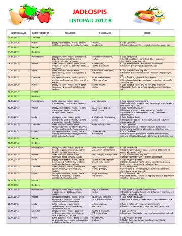 JADŁOSPIS LISTOPAD 2012 R DZIEŃ MIESIĄCA DZIEŃ TYGODNIA 01.11.2012r Czwartek 02.11.2012r Piątek 03.11.2012r Sobota 04.11.2012r Niedziela 05.11.2012r Poniedziałek 06.11.2012r Wtorek 07.11.2012r Środa 08.11.2012r Czwartek 09.11.2012r Piątek 10.11.2012r Sobota 11.11.2012r Niedziela 12.11.2012r ŚNIADANIE II ŚNIADANIE OBIAD pieczywo mieszane, masło, parówki drobiowe, pomidor ser żółty, herbata sezamki, mandarynka I Zupa Ogórkowa II Ryba smażona (filet), brokuł, ziemniaki pure, sok pieczywo jasne, masło, pasztetowa, papryka ogórek kiszony, serek topiony, herbata z cytryną bułka pszenna, masło, pasta rybna, wędlina wieprzowa, pomidor, herbata owocowa bułka maślana. masło, krem czekoladowy, płatki kukurydziane z mlekiem pieczywo mieszane, masło, sałata, wędlina drobiowa, ser żółty, pomidor, kakao pieczywo jasne, masło, miód, serek kanapkowy z ziołami, rzodkiewka, herbata chrupki kukurydziane, jabłko I Zupa Jarzynowa II Kotlet schabowy, surówka z białej kapusty, ziemniaki z zieleniną, sok I Zupa Kalafiorowa z klopsikami drobiowymi II Naleśnik z twarogiem/dżemem, sok Poniedziałek bułka pszenna, masło, dżem truskawkowy, pasztetowa, herbata kiwi, biszkopty 13.11.2012r Wtorek pieczywo mieszane, masło, wędlina wieprzowa, sałata, twaróg ze szczypiorkiem, mleko galaretka owocowa, wafel ryżowy 14.11.2012r Środa drożdżówka z kruszonką, jabłko 15.11.2012r Czwartek 16.11.2012r Piątek pieczywo jasne, masło, pasta jajeczne ze szczypiorkiem, wędlina wieprzowa, pomidor, herbata bułka maślana, masło, serek homogenizowany owocowy, papryka, wędlina drobiowa, herbata owocowa pieczywo mieszane, masło, pasta z wędliny drobiowej ze szczypiorkiem, serek topiony, herbata 17.11.2012r Sobota 18.11.2012r Niedziela 19.11.2012r Poniedziałek kisiel owocowy. ciastko „smoczek” śmietankowe 20.11.2012r Wtorek 21.11.2012r Sroda 22.11.2012r Czwartek 23.11.2012r Piątek pieczywo jasne, masło, jajko na twardo, wędlina drobiowa, ogórek świeży, herbata owocowa bułka maślana, masło, dżem owocowy, serek topiony, kakao pieczywo mieszane, masło, pasta twarogowa z rzodkiewką, wędlina drobiowa, herbata z cytryną bułka pszenna, masło, pasztetowa, ogórek kiszony, serek maślany, herbata pieczywo mieszane, masło, pasta z makreli z zieleniną, ser żółty, pomidor, herbata bawarka 24.11.2012r Sobota 25.11.2012r Niedziela 26.11.2012r Poniedziałek rogalik z dżemem, jabłko 27.11.2012r Wtorek 28.11.2012r Środa 29.11.2012r Czwartek 30.11.2012r Piątek pieczywo jasne, masło, wędlina wieprzowa, ser żółty, pomidor, herbata pieczywo mieszana, masło, serek kanapkowy, papryka, pasztet drobiowy, herbata owocowa bułka maślana, masło, krem czekoladowy, serek kanapkowy, rzodkiewka, kakao pieczywo jasne, masło, parówki drobiowe, pomidor, serek topiony, sałata, herbata z cytryną bułka pszenna, masło, pasta jajeczna ze szczypiorkiem, płatki kukurydziane z mlekiem, herbata mandarynka, ciastko z ziarnami drożdżówka z owocem, 1/2 banana budyń czekoladowy, 1/2 pomarańczy ciastko kruche, jabłko wafel andrut, dżem ciastko kruche, mandarynka kiwi, chrupki kukurydziane kaszka manna z sokiem owocowym, jabłko jogurt owocowy, ciastka petibery budyń waniliowy, 1/2 banana I Zupa Pomidorowa z ryżem II Makaron z sosem bolońskim i mięsem wieprzowym, sok I Zupa Żurek z jajkiem i ziemniakami II Medaliony drobiowe, surówka z marchwi, ziemniaki z zieleniną, sok I Zupa Barszcz czerwony na wywarze mięsnym II Paluszki rybne, surówka z ogórków, ziemniaki puree, sok I Zupa porowo-ziemniaczana II Kotlecik mielony wieprzowy (smażony), marchewka z groszkiem, ryż, sok I Zupa Rosół z kluskami II Bitki wieprzowe w sosie własnym, fasolka szparagowa z odrobiną bułki tartej, ziemniaki z zieleniną, sok I Zupa Barszcz Biały II Pierogi z owocami i twarogiem, polane jogurtem owocowym, sok I Zupa Ogórkowa II Szynka pieczona w sosie własnym, surówka z buraczków z jabłkiem, ziemniaki z zieleniną, sok I Zupa Grochowa II Pulpety rybne (smażone) w sosie pomidorowym, surówka z kiszonej kapusty, ziemniaki z zieleniną, sok I Zupa Brokułowa II Klopsiki gotowane w sosie, warzywa gotowane na parze, ziemniaki, sok I Zupa Pomidorowa z ryżem II Placki ziemniaczane, z sosem węgierskim I Zupa Krupnik z kaszą II Pierś z kurczaka ( gotowana), kalafior z odrobiną bułki tartej, ziemniaki z zieleniną, sok I Zupa Jarzynowa II De vollaile z serkiem żółtym, surówka z selerem, ziemniaki z zieleniną, sok I Zupa Ziemniaczana II Paluszki rybne, surówka z kapusty białej z dodatkiem marchwi, ziemniaki, sok galaretka z owocem, chrupki kukurydziane I Zupa Żurek z jajkiem i ziemniakami II Nugetsy z kurczaka, surówka z kapusty, marchewki i jabłka, ziemniaki, sok I Zupa Rosół z kluskami II Gołąbek w sosie pomidorowym, ziemniaki pure, sok kisiel owocowy, murzynek I Zupa z zielonych warzyw z ziemniakami II Makaron z twarogiem, jogurtem owocowym, sok ciastko z ziarnami, 1/2 pomarańczy I Zupa Ogórkowa II Potrawka z kurczaka, marchewka gotowana, ryż, sok mandarynka, biszkopty I Zupa Krupnik z kaszą II Steki rybne, surówka z ogórków, ziemniaki z zieleniną, sok
