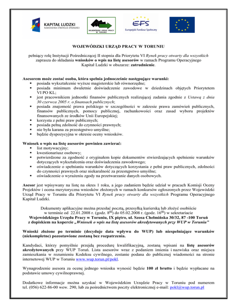 WOJEWÓDZKI URZĄD PRACY W TORUNIU pełniący rolę Instytucji Pośredniczącej II stopnia dla Priorytetu VI Rynek pracy otwarty dla wszystkich zaprasza do składania wniosków o wpis na listę asesorów w ramach Programu Operacyjnego Kapitał Ludzki w obszarze: zatrudnienie. Asesorem moŜe zostać osoba, która spełnia jednocześnie następujące warunki: posiada wykształcenie wyŜsze magisterskie lub równorzędne; posiada minimum dwuletnie doświadczenie zawodowe w dziedzinach objętych Priorytetem VI PO KL; jest pracownikiem jednostki finansów publicznych realizującej zadania zgodnie z Ustawą z dnia 30 czerwca 2005 r. o finansach publicznych; posiada znajomość prawa polskiego w szczególności w zakresie prawa zamówień publicznych, finansów publicznych, pomocy publicznej, rachunkowości oraz zasad wyboru projektów finansowanych ze środków Unii Europejskiej; korzysta z pełni praw publicznych; posiada pełną zdolność do czynności prawnych; nie była karana za przestępstwo umyślne; będzie dyspozycyjna w okresie oceny wniosków. Wniosek o wpis na listę asesorów powinien zawierać: list motywacyjny; kwestionariusz osobowy; potwierdzone za zgodność z oryginałem kopie dokumentów stwierdzających spełnienie warunków dotyczących wykształcenia oraz doświadczenia zawodowego; oświadczenie o spełnianiu warunków dotyczących korzystania z pełni praw publicznych, zdolności do czynności prawnych oraz niekaralność za przestępstwo umyślne; oświadczenie o wyraŜeniu zgody na przetwarzanie danych osobowych. Asesor jest wpisywany na listę na okres 1 roku, a jego zadaniem będzie udział w pracach Komisji Oceny Projektów i ocena merytoryczna wniosków złoŜonych w ramach konkursów ogłoszonych przez Wojewódzki Urząd Pracy w Toruniu dla Priorytetu VI Rynek pracy otwarty dla wszystkich Programu Operacyjnego Kapitał Ludzki. Dokumenty aplikacyjne moŜna przesłać pocztą, przesyłką kurierską lub złoŜyć osobiście w terminie od 22.01.2008 r. (godz. 800) do 05.02.2008 r. (godz. 1600) w sekretariacie Wojewódzkiego Urzędu Pracy w Toruniu, IX piętro, ul. Szosa Chełmińska 30/32, 87 -100 Toruń z dopiskiem na kopercie „Wniosek o wpis na listę asesorów akredytowanych przy WUP w Toruniu” Wnioski złoŜone po terminie (decyduje data wpływu do WUP) lub niespełniające warunków (niekompletne) pozostawione zostaną bez rozpatrzenia. Kandydaci, którzy pomyślnie przejdą procedurę kwalifikacyjną, zostaną wpisani na listę asesorów akredytowanych przy WUP Toruń. Lista asesorów wraz z podaniem imienia i nazwiska oraz miejsca zamieszkania w rozumieniu Kodeksu cywilnego, zostanie podana do publicznej wiadomości na stronie internetowej WUP w Toruniu www.wup.torun.pl/pokl. Wynagrodzenie asesora za ocenę jednego wniosku wynosić będzie 100 zł brutto i będzie wypłacane na podstawie umowy cywilnoprawnej. Dodatkowe informacje moŜna uzyskać w Wojewódzkim Urzędzie Pracy w Toruniu pod numerem tel. (056) 622-86-00 wew. 290, lub za pośrednictwem poczty elektronicznej e-mail: [email protected]