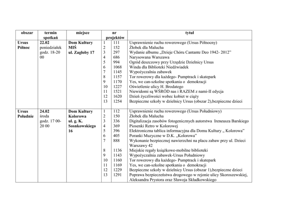 obszar Ursus Północ Ursus Południe termin spotkań 22.02 poniedziałek godz. 18-20 00 24.02 środa godz. 17 0020 00 miejsce Dom Kultury MIŚ ul. Zagłoby 17 Dom Kultury Kolorowa ul. g. K. Sosnkowskiego 16 nr projektów 1 111 2 152 3 297 4 686 5 994 6 1068 7 1145 8 1157 9 1170 10 1227 11 1521 12 1620 13 1254 1 2 3 4 5 6 7 112 150 336 369 396 405 888 8 9 10 11 12 13 1136 1143 1160 1169 1229 1291 tytuł Usprawnienie ruchu rowerowego (Ursus Północny) Żłobek dla Malucha Wydanie albumu „Dzieje Chóru Cantante Deo 1942- 2012” Narysowana Warszawa Ogród deszczowy przy Urzędzie Dzielnicy Ursus Winda dla Biblioteki Niedźwiadek Wypożyczalnia zabawek Tor rowerowy dla każdego- Pumptrack i skatepark Yes, we can-szkolne spotkania o demokracji Oświetlenie ulicy H. Brodatego Niewidomi są WŚRÓD nas i RAZEM z nami-II edycja Dzień życzliwości wobec kobiet w ciąży Bezpieczne szkoły w dzielnicy Ursus (obszar 2),bezpieczne dzieci Usprawnienie ruchu rowerowego (Ursus Południowy) Żłobek dla Malucha Digitalizacja zasobów fotogenicznych autorstwa Ireneusza Barskiego Piosenki Retro w Kolorowej Elektroniczna tablica informacyjna dla Domu Kultury „ Kolorowa” Poranki Muzyczne w D.K. „Kolorowa” Wykonanie bezpiecznej nawierzchni na placu zabaw przy ul. Dzieci Warszawy 42 Miejskie regały książkowe-mobilne biblioteki Wypożyczalnia zabawek-Ursus Południowy Tor rowerowy dla każdego- Pumptrack i skatepark Yes, we can-szkolne spotkania o demokracji Bezpieczne szkoły w dzielnicy Ursus (obszar 1),bezpieczne dzieci Poprawa bezpieczeństwa drogowego w rejonie ulicy Skoroszewskiej, Aleksandra Prystora oraz Sławoja Składkowskiego Ursus Południe 29.02 Poniedziałek 17 00- 20 00 Dom Kultury Kolorowa ul. g. K. Sosnkowskiego 16 14 15 1409 1442 16 1507 1 2 3 4 5 6 7 1617 1619 1683 1704 1776 1953 1963 8 9 10 11 12 2030 2039 2093 2194 2589 13 14 2593 2603 15 16 2609 2631 Biblioteka dla seniora- mówiące i powiększone książki Wybudowanie zadaszenia trybuny stadionu OSIR Ursus przy ul. Sosnkowskiego 3 Niewidomi są WŚRÓD nas i RAZEM z nami-II edycja Dzień życzliwości wobec kobiet w ciąży Lepsza szkoła! Ocenianie kształtujące dla rodziców Alternatywna świetlica sensoryczna Warsztaty dla młodzieży z zakresy finansów i prawa Łąka kwietna Park Czechowicki Udar mózgu? Demencja? o co chodzi, jak z tym żyć? Nie boimy się! Gra planszowa integrująca, stymulująca funkcje poznawcze osób po udarach mózgu/z chorobą otępienną Pikniki rodzinne Szafki na podręczniki szkolne w Ursusie/sp4/sp14/Ursus Południowy Planszowe granie w każdej szkole w Ursusie Boisko dla sp14-zagospodarowanie terenu przy sp14 Powiększenie bazy sportowej, ogólnodostępnej poprzez adaptacje terenu nieużytku na terenie OSIR Ursus Boisko plażowe na terenie OSIR Zieleń wokół budynku wspólnoty mieszkaniowej Walerego Sławka 3/5 Zieleń dla Skoroszy Odbudowanie chodnika miedzy ulicą Sosnkowskiego a ulicą Drzymały, biegnącego w szczytach bloków Sosnkowskiego 7, Drzymały 8 Ursus Północ 02.03.2016 r. Środa 18 00-20 00 Dom Kultury MIŚ ul. Zagłoby 17 1 2 1716 1838 3 4 5 6 1920 1958 1970 1973 7 8 9 10 2019 2046 2241 2504 11 12 2598 2601 13 14 2613 1238 Warsztaty dla młodzieży z zakresu finansów i prawa Wyznaczenie naziemnych przejść dla pieszych na skrzyżowaniu ulic Orłów Piastowskich, Bony, Rakuszanki, Listopadowej Ciepło pod kontrolą Udar mózgu? Demencja? o co chodzi, jak z tym żyć? Nie boimy się! Park dla zwierząt ”Reksio” Gra planszowa integrująca, stymulująca funkcje poznawcze osób po udarach mózgu/z chorobą otępienną Pikniki rodzinne Szafki na podręczniki szkolne w Ursusie/sp11/Ursus Północny Warsztaty śpiewu dla każdego-bezpłatne Budowa Wielofunkcyjnej Hali Sportowej na terenie Gimnazjum nr 133 Doświetlenie dwóch przejść dla pieszych na ul. Orłów Piastowskich Utwardzenie przedeptu na terenie zieleńca przy ul. Królów Polskich i wymiana chodnika Przestrzeń dla Kultury Renowacja fortepianu w Ośrodku Kultury Arsus w Ursusie
