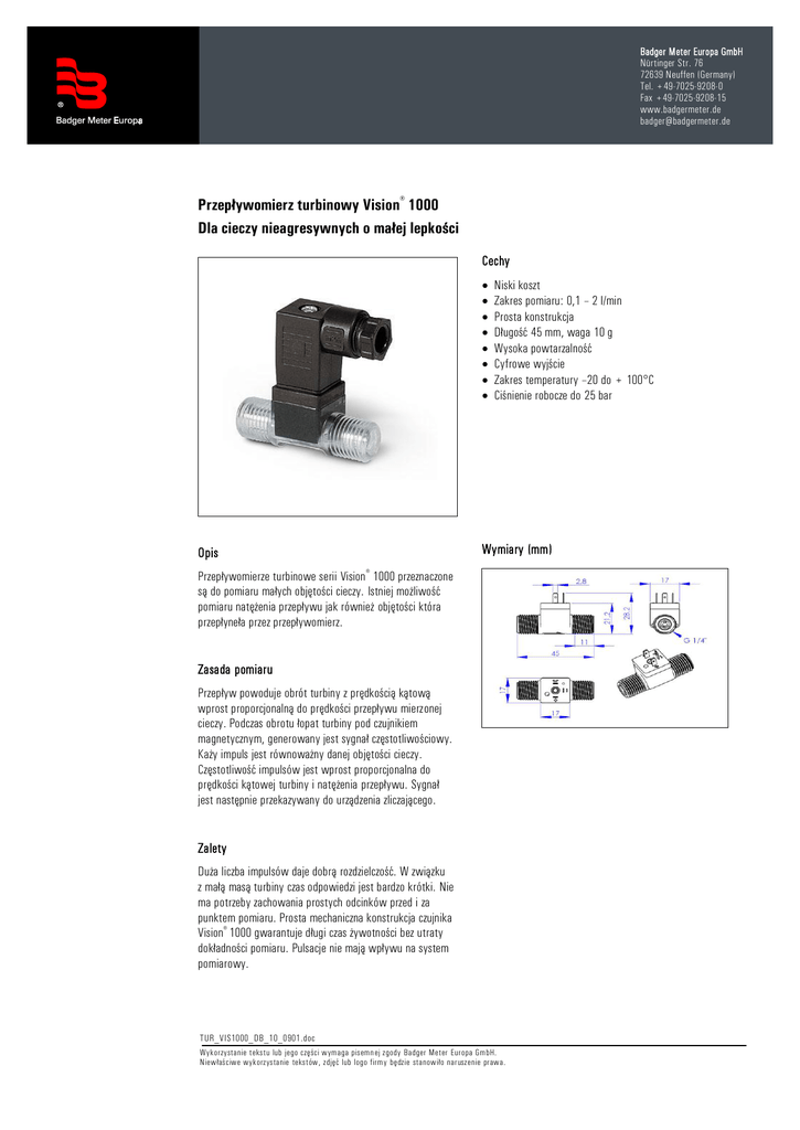 Badger Meter Europa GmbH Nürtinger Str. 76 72639 Neuffen (Germany) Tel. +49-7025-9208-0 Fax +49-7025-9208-15 www.badgermeter.de [email protected] Przepływomierz turbinowy Vision® 1000 Dla cieczy nieagresywnych o małej lepkości Cechy Opis Niski koszt Zakres pomiaru: 0,1 – 2 l/min Prosta konstrukcja Długość 45 mm, waga 10 g Wysoka powtarzalność Cyfrowe wyjście Zakres temperatury –20 do + 100°C Ciśnienie robocze do 25 bar Wymiary (mm) Przepływomierze turbinowe serii Vision ® 1000 przeznaczone są do pomiaru małych objętości cieczy. Istniej możliwość pomiaru natężenia przepływu jak również objętości która przepłyneła przez przepływomierz. Zasada pomiaru Przepływ powoduje obrót turbiny z prędkością kątową wprost proporcjonalną do prędkości przepływu mierzonej cieczy. Podczas obrotu łopat turbiny pod czujnikiem magnetycznym, generowany jest sygnał częstotliwościowy. Każy impuls jest równoważny danej objętości cieczy. Częstotliwość impulsów jest wprost proporcjonalna do prędkości kątowej turbiny i natężenia przepływu. Sygnał jest następnie przekazywany do urządzenia zliczającego. Zalety Duża liczba impulsów daje dobrą rozdzielczość. W związku z małą masą turbiny czas odpowiedzi jest bardzo krótki. Nie ma potrzeby zachowania prostych odcinków przed i za punktem pomiaru. Prosta mechaniczna konstrukcja czujnika Vision® 1000 gwarantuje długi czas żywotności bez utraty dokładności pomiaru. Pulsacje nie mają wpływu na system pomiarowy. TUR_VIS1000_DB_10_0901.doc Wykorzystanie tekstu lub jego części wymaga pisemn ej zgody Badger Meter Europa GmbH. Niewłaściwe wykorzystanie tekstów, zdjęć lub logo firmy będzie stanowiło naruszenie prawa. Dane techniczne Zakres pomiaru Rozdzielczość Ciecze Maksymalne ciśnienie Przyłącza Zakres temperatury pracy Dokładność Powtarzalnoś Maksymalna lepkoś cieczy Spadek ciśnienia Przyłącze elektryczne Zasilanie Pobór prądu Sygnał wyjściowy Prąd wyjścia Materiałt 0,1 – 2 l/min 20.000 impulsów/litr Ciecze bez części stałych, zalecany filtr 20 do 40 mikronów 25 bar (100 bar ciśnienia rozrywającego). G ¼" lub NPT ¼" (zalecany moment dokręcenia ok. 6 Nm) -20 do +100°C +/- 3% wartości bieżącej Lepsza niż 0,5% do 15 cSt Patrz wykres poniżej Konektor MICRO-EN 60529 lub 3 płaskie przyłącza 2,8 x 0,5 5 – 24 VDC Ok. 8mA Częstotliwościowy otwarty kolektror (NPN) Maks. 20mA Korpus Grilamid TR55 (PA12) Turbina PA12 Ferryt Łożyskowanie PTFE / Grafit Wewnątrz Ø 7 mm, zewnątrz Ø 13 mm Grubość 2 mm, twardość ok. 70 Sh A Wymiary uszczelnienia odchylenie y i n%%% di vergenc flow 4,00 2,00 0,00 -2,00 0 0,5 1 1,5 -4,00 flow l/min przepływ l/min pressure drop spadek ciśnienia 400 350 Δp m bar 300 250 200 150 100 50 0 0 0,5 1 1,5 2 2,5 3 przepływ l/min flow l/min TUR_VIS1000_DB_10_0901.doc Wykorzystanie tekstu lub jego części wymaga pisemn ej zgody Badger Meter Europa GmbH. Niewłaściwe wykorzystanie tekstów, zdjęć lub logo firmy będzie stanowiło naruszenie prawa. 2 2,5 3