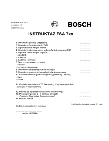 Robert Bosch Sp. z o.o. ul.Jutrzenki 105 02-231 Warszawa INSTRUKTAŻ FSA 7xx 1. Omówienie budowy urządzenia 2. Omówienie funkcjonalności DSA 3. Wprowadzanie danych klienta 4. Omówienie struktury strony wyboru funkcji programu FSA 5. Wprowadzenie danych pojazdu - standard - nr klucza 6. Badanie - przykład 7. Test podzespołów - przykład - kursory - krzywe porównawcze 8. Omówienie oscyloskopu uniwersalnego 9. Omówienie znaczenia i zasady działania generatora 10. Omówienie oscylogramów zapłonu ( pierwotny i wtórny ) - lupa - raster .................... .................... .................... .................... .................... .................... .................... .................... .................... .................... 11. Omówienie działania KTS 5xx według odrębnego protokołu ( jeżeli jest w wyposażeniu ) .................... 12. Informacja na temat wyposażenia dodatkowego 13. Praktyczny pokaz 2 - 4 pomiary z książki „Poradnik Diagnostyki Samochodowej” 14. Pytania klienta .................... Zostałem przeszkolony z obsługi .............................................. podpis KLIENTA …………….. .................... Profesjonalny instruktaż trwa ok. 3,5 godz.