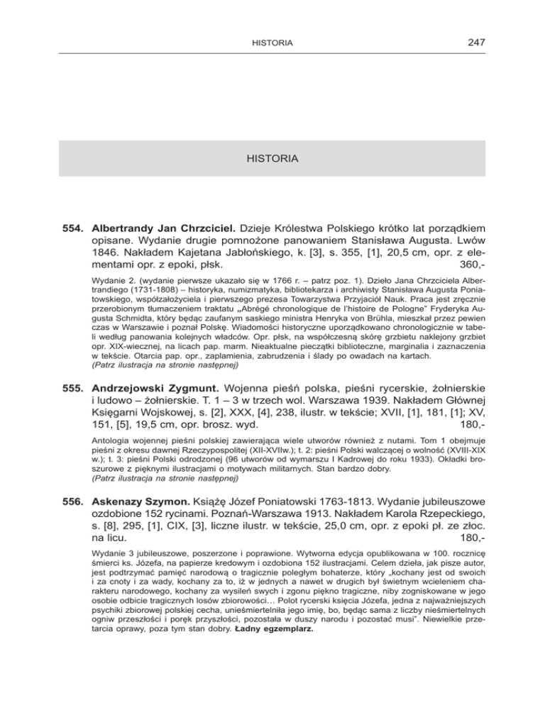 HISTORIA 247 HISTORIA 554. Albertrandy Jan Chrzciciel. Dzieje Królestwa Polskiego krótko lat porządkiem opisane. Wydanie drugie pomnożone panowaniem Stanisława Augusta. Lwów 1846. Nakładem Kajetana Jabłońskiego, k. [3], s. 355, [1], 20,5 cm, opr. z elementami opr. z epoki, płsk. 360,Wydanie 2. (wydanie pierwsze ukazało się w 1766 r. – patrz poz. 1). Dzieło Jana Chrzciciela Albertrandiego (1731-1808) – historyka, numizmatyka, bibliotekarza i archiwisty Stanisława Augusta Poniatowskiego, współzałożyciela i pierwszego prezesa Towarzystwa Przyjaciół Nauk. Praca jest zręcznie przerobionym tłumaczeniem traktatu „Abrégé chronologique de l’histoire de Pologne” Fryderyka Augusta Schmidta, który będąc zaufanym saskiego ministra Henryka von Brühla, mieszkał przez pewien czas w Warszawie i poznał Polskę. Wiadomości historyczne uporządkowano chronologicznie w tabeli według panowania kolejnych władców. Opr. płsk, na współczesną skórę grzbietu naklejony grzbiet opr. XIX-wiecznej, na licach pap. marm. Nieaktualne pieczątki biblioteczne, marginalia i zaznaczenia w tekście. Otarcia pap. opr., zaplamienia, zabrudzenia i ślady po owadach na kartach. (Patrz ilustracja na stronie następnej) 555. Andrzejowski Zygmunt. Wojenna pieśń polska, pieśni rycerskie, żołnierskie i ludowo – żołnierskie. T. 1 – 3 w trzech wol. Warszawa 1939. Nakładem Głównej Księgarni Wojskowej, s. [2], XXX, [4], 238, ilustr. w tekście; XVII, [1], 181, [1]; XV, 151, [5], 19,5 cm, opr. brosz. wyd. 180,Antologia wojennej pieśni polskiej zawierająca wiele utworów również z nutami. Tom 1 obejmuje pieśni z okresu dawnej Rzeczypospolitej (XII-XVIIw.); t. 2: pieśni Polski walczącej o wolność (XVIII-XIX w.); t. 3: pieśni Polski odrodzonej (96 utworów od wymarszu I Kadrowej do roku 1933). Okładki broszurowe z pięknymi ilustracjami o motywach militarnych. Stan bardzo dobry. (Patrz ilustracja na stronie następnej) 556. Askenazy Szymon. Książę Józef Poniatowski 1763-1813. Wydanie jubileuszowe ozdobione 152 rycinami. Poznań-Warszawa 1913. Nakładem Karola Rzepeckiego, s. [8], 295, [1], CIX, [3], liczne ilustr. w tekście, 25,0 cm, opr. z epoki pł. ze złoc. na licu. 180,Wydanie 3 jubileuszowe, poszerzone i poprawione. Wytworna edycja opublikowana w 100. rocznicę śmierci ks. Józefa, na papierze kredowym i ozdobiona 152 ilustracjami. Celem dzieła, jak pisze autor, jest podtrzymać pamięć narodową o tragicznie poległym bohaterze, który „kochany jest od swoich i za cnoty i za wady, kochany za to, iż w jednych a nawet w drugich był świetnym wcieleniem charakteru narodowego, kochany za wysileń swych i zgonu piękno tragiczne, niby zogniskowane w jego osobie odbicie tragicznych losów zbiorowości… Polot rycerski księcia Józefa, jedna z najważniejszych psychiki zbiorowej polskiej cecha, unieśmiertelniła jego imię, bo, będąc sama z liczby nieśmiertelnych ogniw przeszłości i poręk przyszłości, pozostała w duszy narodu i pozostać musi”. Niewielkie przetarcia oprawy, poza tym stan dobry. Ładny egzemplarz. 248 HISTORIA 554. J.Ch. Albertrandy. Dzieje Polski. 1846. 555. Wojenna pieśń polska. 1939. 557. Balberyszski Mendel. Likwidacja getta wileńskiego. Warszawa-Łódź-Kraków 1946. Centralna Żydowska Komisja Historyczna, s. 40, 21 cm, oryg. okł. brosz. 60,Odbitka z książki „Dokumenty i materiały do dziejów okupacji niemieckiej w Polsce. T. II: Akcje i wysiedlenia”. Wspomnienia spisane przez naocznego świadka likwidacji getta wileńskiego w 1943 r. Stan dobry. 558. Biliński Leon. Wspomnienia i dokumenty. Wydał i do druku przygotował L.B. Szarlitt. T. 1-2. Warszawa 1924-1925. Nakładem Księgarni F. Hoesicka, s. [6], 360, [2], portret 1; [6], 490, 22,5 cm, jednolita opr. z epoki płsk. ze złoc. napisami na grzbiecie, górne brzegi kart barwione. 280,Wspomnienia Leona Bilińskiego (1846-1923) wybitnego polityka, rektora Uniwersytetu Lwowskiego, gubernatora banku austro-węgierskiego, ministra skarbu w gabinecie Ignacego Paderewskiego. Tom pierwszy obejmuje lata 1846-1914, tom drugi lata 1915-1922. Na końcu każdego tomu wybór dokumentów źródłowych. Miejscami na kartach drobne zabrudzenia, poza tym stan bardzo dobry. Ładny komplet. Lit.: E. Maliszewski, Bibliografia pamiętników polskich, poz. 3957. 559. Bitwa Warszawska. Tom 1: Bitwa nad Bugiem 27.VII – 7.VIII 1920. Część II: Dokumenty (Materjały do Historji Wojny 1918-1920 r.) Warszawa 1935. Wojskowe Biuro Historyczne, s. [2], VIII, 824 + załącznik nr 1 (map i szkiców 31) + teka I (map 15, w miejsce 22) + teka II (map 21, w miejsce 22), 25 cm, opr. z epoki skóra ze złoc. i płócienne teki. 600,Egzemplarz imienny gen. Tadeusza Kasprzyckiego (drukowana informacja po stronie tytułowej). Monumentalne wydawnictwo źródłowe dotyczące Bitwy Warszawskiej 1920 r. Oferowany zbiór, poświęcony bitwie nad Bugiem stoczonej w dniach 27 lipca-7 sierpnia, zawiera tom z wyborem ponad 249 HISTORIA 559. Bitwa Warszawska. 1935. 561. Narodowości słowiańskie. 1879. 750 dokumentów, ponadto załącznik nr 1 pt „Ordre de Bataille stron walczących” oraz atlas złożony z dwóch tek map. Wydane w tomie dokumenty pochodziły z Archiwum Wojskowego, obejmowały łącznie okres od 20 lipca do 7 sierpnia 1920 r. Znalazły się wśród nich dokumenty Naczelnego Dowództwa, Ministerstwa Spraw Wojskowych, dowództwa Frontu Północno-Wschodniego, dowództwa 1. i 4. Armii, dowództwa Grupy Poleskiej oraz dowództwa Grupy Operacyjnej gen. Wroczyńskiego. Luzem dołączona nadbitka pracy Tadeusza Machalskiego „Nasza kawalerja na lewem skrzydle Bitwy Warszawskiej 1-22 sierpnia 1920 roku” („Przegląd Kawaleryjski”, 1929, nr 3). Opr.: skóra niebieska, na grzbiecie złocona tytulatura, obie okładki zamknięte złotą linią, zachowana przednia okładka broszurowa. T. Kasprzycki (1891-1978) żołnierz I Brygady, generał dywizji Wojska Polskiego, w latach 19351939 minis