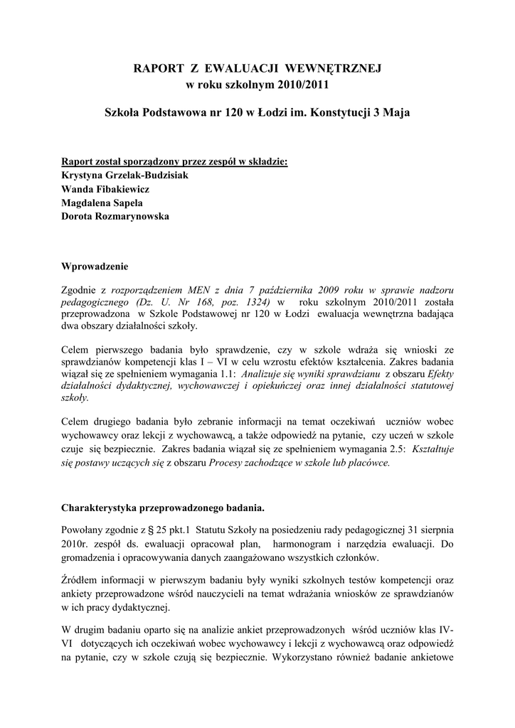 RAPORT Z EWALUACJI WEWNĘTRZNEJ w roku szkolnym 2010/2011 Szkoła Podstawowa nr 120 w Łodzi im. Konstytucji 3 Maja Raport został sporządzony przez zespół w składzie: Krystyna Grzelak-Budzisiak Wanda Fibakiewicz Magdalena Sapela Dorota Rozmarynowska Wprowadzenie Zgodnie z rozporządzeniem MEN z dnia 7 października 2009 roku w sprawie nadzoru pedagogicznego (Dz. U. Nr 168, poz. 1324) w roku szkolnym 2010/2011 została przeprowadzona w Szkole Podstawowej nr 120 w Łodzi ewaluacja wewnętrzna badająca dwa obszary działalności szkoły. Celem pierwszego badania było sprawdzenie, czy w szkole wdraża się wnioski ze sprawdzianów kompetencji klas I – VI w celu wzrostu efektów kształcenia. Zakres badania wiązał się ze spełnieniem wymagania 1.1: Analizuje się wyniki sprawdzianu z obszaru Efekty działalności dydaktycznej, wychowawczej i opiekuńczej oraz innej działalności statutowej szkoły. Celem drugiego badania było zebranie informacji na temat oczekiwań uczniów wobec wychowawcy oraz lekcji z wychowawcą, a także odpowiedź na pytanie, czy uczeń w szkole czuje się bezpiecznie. Zakres badania wiązał się ze spełnieniem wymagania 2.5: Kształtuje się postawy uczących się z obszaru Procesy zachodzące w szkole lub placówce. Charakterystyka przeprowadzonego badania. Powołany zgodnie z § 25 pkt.1 Statutu Szkoły na posiedzeniu rady pedagogicznej 31 sierpnia 2010r. zespół ds. ewaluacji opracował plan, harmonogram i narzędzia ewaluacji. Do gromadzenia i opracowywania danych zaangażowano wszystkich członków. Źródłem informacji w pierwszym badaniu były wyniki szkolnych testów kompetencji oraz ankiety przeprowadzone wśród nauczycieli na temat wdrażania wniosków ze sprawdzianów w ich pracy dydaktycznej. W drugim badaniu oparto się na analizie ankiet przeprowadzonych wśród uczniów klas IVVI dotyczących ich oczekiwań wobec wychowawcy i lekcji z wychowawcą oraz odpowiedź na pytanie, czy w szkole czują się bezpiecznie. Wykorzystano również badanie ankietowe przeprowadzone wśród rodziców uczniów klas I – VI, którego celem było zdiagnozowanie problemów dotyczących przemocy w szkole. Przeprowadzono także analizę dokumentacji szkoły dotyczącą planów wychowawczych w poszczególnych klasach. Na podstawie zebranych informacji został opracowany raport całościowy, który włączono do dokumentacji szkoły. Wyniki ewaluacji zostały upowszechnione radzie pedagogicznej oraz rodzicom i uczniom poprzez stronę internetową szkoły. Analiza wyników badania wykorzystania wniosków ze sprawdzianów kompetencji przeprowadzonych w klasach I-VI w celu wzrostu efektów kształcenia W poszukiwaniu odpowiedzi na pytanie kluczowe: „Czy nauczyciele wdrażają w pracy dydaktycznej wnioski z przeprowadzonych sprawdzianów kompetencji?” została przeprowadzona dokładna analiza wyników testów kompetencji pisanych przez uczniów w bieżącym roku szkolnym według opracowanego harmonogramu. W wyniku analizy sprawdzianu kompetencji klas pierwszych sformułowano następujące wnioski: 1. W zakresie edukacji polonistycznej uczniowie najlepiej poradzili sobie z zadaniem dotyczącym ustalenia liczby sylab, liter i głosek w wyrazach. Nie mieli także dużych problemów z uporządkowaniem nazw ludzi, zwierząt, roślin i rzeczy, problemy sprawiało im układanie zdań z rozsypanki wyrazowej. 2. Pierwszoklasiści najlepiej opanowali umiejętności w zakresie edukacji matematycznej. Bardzo dobrze poradzili sobie z dodawaniem i odejmowaniem w zakresie 10 ,mierzeniem odcinków z użyciem linijki , porównywaniem liczb w zakresie 10. Niewiele gorzej z dopełnianiem do 10. 3. Przeprowadzone badanie wykazało wysoki poziom opanowania wiadomości w zakresie edukacji przyrodniczej. W wyniku analizy sprawdzianu kompetencji klas drugich sformułowano następujące wnioski: 1. Uczniowie dobrze poradzili sobie w części humanistycznej z rozwiązaniem zadań dotyczących czytania ze zrozumieniem, z wykorzystaniem wiedzy w praktyce, z pisaniem tekstu na zadany temat oraz porządkowaniem zdań we właściwej kolejności wydarzeń; popełnili tylko nieliczne błędy. 2. W kilku przypadkach pojawił się problem ze wskazaniem źródła informacji oraz dotyczący odczytywania informacji z tekstu. 3. Niewielki problem mieli uczniowie z zastosowaniem właściwych wyrazów w odpowiedniej formie. 4. Najsłabiej wypadło zadanie dotyczące ułożenia zdania z rozsypanki wyrazowej oraz zastosowania właściwych wyrazów w odpowiedniej formie. 5. W części matematyczno – przyrodniczej najlepiej rozwiązano zadania, które dotyczyły rozumowania oraz korzystania z informacji.. 6. Najsłabiej w obu klasach wypadło zadanie dotyczące wykorzystania wiedzy w praktyce, gdyż uczniowie popełnili błędy rachunkowe. 7. Pojawiały się też problemy w zadaniu, gdzie należało obliczyć czas na zegarze. W klasach trzecich przeprowadzone zostały dwa sprawdziany kompetencji: jeden przygotowany i opracowany przez wychowawców, drugi przeprowadzony w maju. Było to Ogólnopolskie Badanie Umiejętności Trzecioklasistów OBUT 2011. W wyniku analizy przeprowadzonych badań sformułowano następujące wnioski: 1. Uczniowie najlepiej radzą sobie z czytaniem ze zrozumieniem , w większości udzielają poprawnych odpowiedzi. 2. Nie mają problemów z treściami gramatycznymi, potrafią wskazać właściwą część mowy oraz prawidłowo ułożyć zdania ze wskazanymi wyrazami. 3. Potrafią zredagować wskazaną formę wypowiedzi wielozdaniowej poprawnie pod względem znaczeniowym jak i od strony formalnej tekstu. Pojawiają się nieliczne błędy językowe oraz ortograficzne. Uczniowie używają zwrotów i wyrazów, których znaczenie rozumieją oraz są pewni poprawności ortograficznej. 4. Potrafią wykazać się znajomością frazeologizmów oraz rozumieją wieloznaczność wskazanych wyrazów. 5. W zakresie umiejętności matematycznych uczniowie najlepiej radzą sobie z wykonywanie