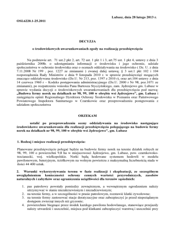 Lubasz, dnia 28 lutego 2013 r. OSI.6220.1-25.2011 DECYZJA o środowiskowych uwarunkowaniach zgody na realizację przedsięwzięcia Na podstawie art. 71 ust.2 pkt 2, art. 72 ust. 1 pkt 1 i 3, art.75 ust. 1 pkt 4, ustawy z dnia 3 października 2008r. o udostępnianiu informacji o środowisku i jego ochronie, udziale społeczeństwa w ochronie środowiska oraz o ocenach oddziaływania na środowisko ( Dz. U. z dnia 7.11.2008 Nr 199 , poz. 1227 ze zmianami ) zwanej dalej ustawą; § 3 ust.1 pkt 102 i 104 rozporządzenia Rady Ministrów z dnia 9 listopada 2010 r. w sprawie przedsięwzięć mogących znacząco oddziaływana środowisko (Dz.U. Nr 213, poz. 1397 z 2010 r), oraz art.104 ustawy z dnia 14 czerwca 1960 r – Kodeks postępowania administracyjnego (Dz.U. 2000 r Nr 98, poz.1071 ze zmianami), po rozpatrzeniu wniosku Pana Bartosza Styczyńskiego, zam. Jędrzejewo gm. Lubasz w sprawie wydania decyzji o środowiskowych uwarunkowaniach dla przedsięwzięcia pod nazwą: „Budowa fermy norek na działkach nr 98, 99, 100 w obrębie wsi Jędrzejewo", gm. Lubasz i zasięgnięciu opinii Regionalnego Dyrektora Ochrony Środowiska w Poznaniu oraz Państwowego Powiatowego Inspektora Sanitarnego w Czarnkowie oraz przeprowadzeniu postępowania z udziałem społeczeństwa ORZEKAM ustalić po przeprowadzeniu oceny oddziaływania na środowisko następujące środowiskowe uwarunkowania dla realizacji przedsięwzięcia polegającego na budowie fermy norek na działkach nr 98, 99, 100 w obrębie wsi Jędrzejewo", gm. Lubasz 1. Rodzaj i miejsce realizacji przedsięwzięcia: Planowane przedsięwzięcie polegać będzie na budowie fermy norek na terenie działek rolnych nr 98, 99, 100 o powierzchni 9,8 ha w miejscowosci Jędrzejewo, gm. Lubasz, pow. czarnkowskotrzcianecki, woj. wielkopolskie. Norki będą hodowane systemem hodowli w modelu pawilonowym, bateryjnym, ściółkowym na wolnym powietrzu z maksymalną liczebnością stada w ilości 44 400 sztuk. 2. Warunki wykorzystywania terenu w fazie realizacji i eksploatacji, ze szczególnym uwzględnieniem konieczności ochrony cennych wartości przyrodniczych, zasobów naturalnych i zabytków oraz ograniczenia uciążliwości dla terenów sąsiednich: 1. pas patrolowy powstały pomiedzy zewnętrznym, a wewnętrznym ogrodzeniem należy utrzymywać w stanie niezakrzewionym i niezadrzewionym; 2. na terenie fermy, a w szczególności w prasie patrolowym, rozstawić klatki żywołowne; 3. na terenie fermy zastosować stacje deratyzacyjne oraz zabezpieczyć je przed niepożądanym dostępem zwierząt innych niż gryzonie; 4. powierzchnie biegnące przez środek każdego pawilonu hodowlanego, stanowiące przejazdy należy utwardzić i uszczelnić, miejsca pod klatkami zabezpieczyć warstwą i uszczelnić przy pomocy folii. Folię umieścić pod warstwą ziemi o miąższości nie mniejszej niż 15 cm, w sposób zabezpieczający środowisko gruntowo wodne przed przedostaniem się do niego ewentualnych zanieczyszczeń, 5. ścieki bytowe, ścieki z mycia karmiarek oraz posadzek budynku magazynowego paszy, do czasu oddania do użytkowania gminnej sieci kanalizacyjnej sanitarnej, należy odprowadzać do szczelnych zbiorników bezodpływowych, a po ich zapełnieniu zapewnić ich wywóz do oczyszczalni ścieków. Alterenatywnie ścieki te można odprowadzać do zakładowej oczyszczalni ścieków bytowyh i przemysłowych, a następnie odprowadzić do ziemi poprzez drenaż rozsączający, po uzyskaniu stosownego pozwolenia wodnoprawnego; 6. należy stosować opryski ściółki znajdującej się pod klatkami dla zwierząt oraz magazynowanej na płycie. Do oprysków ściółki należy stosować preparat ograniczający emisję substancji złowonnych z pomiotu, o skuteczności działania nie mniejszej niz 30% redukcji. Oprysk prowadzić z częstotliwością gwarantującą ciągłe działanie wchodzących w jego skład substancji aktywnych. Dodatkowo pod klatkami rozkładać słomę, w okresie, kiedy na fermie będą przebywały tylko samice stada podstawowego z częstotliwością nie rzadziej niż raz na miesiąc, a w okresie kiedy na fermie będą znajdowały się samice z młodymi, nie rzadziej niż dwa razy w miesiącu; 7. odchody norek należy magazynować na szczelnej płycie obornikowej wyposażonej w zbiorniki na odcieki i systematycznie przekazywać je jako odpad uprawnionym podmiotom posiadającym właściwe zezwolenia w zakresie gospodarowania odpadami. W przypadku wykorzystania przekompostowanych odchodów norek jako nawozu, należy spełnić wymagania ustawy z dnia 10 lipca 2007 r. o nawozach i nawożeniu (Dz. U. Z 2007 r. Nr 147, poz. 1033 ze zm.), a w przypadku niemożliwości spełnienia powyższych wymagań uzyskać określone prawem pozwolenia z zakresu gospodarki odpadami; 8. ciekłą część odchodów norek, stanowiącą odcieki z płyty obornikowej, przeznaczonej do kompostowania odchodów wymieszanych ze słomą należy zbierać w szczelnym zbiorniku bezodpływowym, a następnie wywozić do oczyszczalni ścieków; 9. odchody zwierząt znajdujące sie pod klatkami oraz magazynowane na płycie obornikowej należy regularnie przykrywać słomą. W okresie kiedy na fermie przebywają tylko samice stada podstawowego, słomę rozkładać należy pod klatkami nie rzadziej niż raz na miesiąc, a w okresie kiedy na fermie znajdują się samice z młodymi nie rzadziej niż dwa razy w miesiącu. Odchody magazynowane na płycie należy przykrywać na bieżąco słomą; 10. należy zastosować szczelny zautomatyzowany system pojenia norek, za pomocą poideł smoczkowych; 11. sprzątanie obiektów inwentarskich w tym klatek, należy prowadzić na sucho, bez użycia wody; 12. wszelkie prace związane z obsługą fermy, w tym ruch kołowy pojazdów ciężkich, prowadzić należy w porze dziennej tj. w godz. 6:00-22:00; 13. przygotowywanie paszy dla norek i proces ich oskórowywania należy prowadzić poza terenem fermy; 14. padłe sztuki zwierząt należy usuwać z pawilo