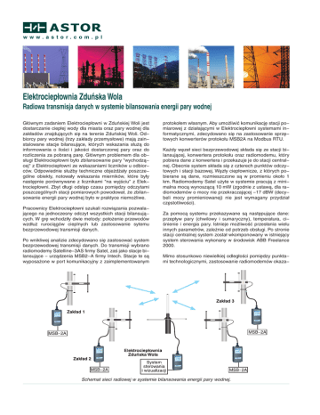 w w w. a s t o r. c o m . p l Elektrociepłownia Zduńska Wola Radiowa transmisja danych w systemie bilansowania energii pary wodnej Głównym zadaniem Elektrociepłowni w Zduńskiej Woli jest dostarczanie ciepłej wody dla miasta oraz pary wodnej dla zakładów znajdujących się na terenie Zduńskiej Woli. Od− biorcy pary wodnej (trzy zakłady przemysłowe) mają zain− stalowane stacje bilansujące, których wskazania służą do informowania o ilości i jakości dostarczonej pary oraz do rozliczenia za pobraną parę. Głównym problemem dla ob− sługi Elektrociepłowni było zbilansowanie pary "wychodzą− cej" z Elektrociepłowni ze wskazaniami liczników u odbior− ców. Odpowiednie służby techniczne objeżdżały poszcze− gólne obiekty, notowały wskazania mierników, które były następnie porównywane z licznikami "na wyjściu" z Elek− trociepłowni. Zbyt długi odstęp czasu pomiędzy odczytami poszczególnych stacji pomiarowych powodował, że zbilan− sowanie energii pary wodnej było w praktyce niemożliwe. Pracownicy Elektrociepłowni szukali rozwiązania pozwala− jącego na jednoczesny odczyt wszystkich stacji bilansują− cych. W grę wchodziły dwie metody: położenie przewodów wzdłuż rurociągów cieplnych lub zastosowanie sytemu bezprzewodowej transmisji danych. Po wnikliwej analizie zdecydowano się zastosować system bezprzewodowej transmisji danych. Do transmisji wybrano radiomodemy Satelline−3AS firmy Satel, zaś jako stacje bi− lansujące − urządzenia MSB2−A firmy Intech. Stacje te są wyposażone w port komunikacyjny z zaimplementowanym protokołem własnym. Aby umożliwić komunikację stacji po− miarowej z działającymi w Elektrociepłowni systemami in− formatycznymi, zdecydowano się na zastosowanie sprzę− towych konwerterów protokołu MSB2A na Modbus RTU. Każdy węzeł sieci bezprzewodowej składa się ze stacji bi− lansującej, konwertera protokołu oraz radiomodemu, który pobiera dane z konwertera i przekazuje je do stacji central− nej. Obecnie system składa się z czterech punktów odczy− towych i stacji bazowej. Węzły ciepłownicze, z których po− bierane są dane, rozmieszczone są w promieniu około 1 km. Radiomodemy Satel użyte w systemie pracują z mini− malna mocą wynoszącą 10 mW (zgodnie z ustawą, dla ra− diomodemów o mocy nie przekraczającej −17 dBW (decy− beli mocy promieniowanej) nie jest wymagany przydział częstotliwości). Za pomocą systemu przekazywane są następujące dane: przepływ pary (chwilowy i sumaryczny), temperatura, ci− śnienie i energia pary. Istnieje możliwość przesłania wielu innych parametrów, zależnie od potrzeb obsługi. Po stronie stacji centralnej system został wkomponowany w istniejący system sterowania wykonany w środowisk ABB Freelance 2000. Mimo stosunkowo niewielkiej odległości pomiędzy punkta− mi technologicznymi, zastosowanie radiomodemów okaza− Schemat sieci radiowej w systemie bilansowania energii pary wodnej. ło się korzystniejsze niż prowadzenie dodatkowych prze− wodów. Ułożenie dodatkowego okablowania spowodowało− by, oprócz trudności technicznych (opracowanie sytemu mocowań), wydłużenie czasu realizacji oraz zaangażowa− nie znacznie większej ilości osób. Tymczasem uruchomie− nie systemu łączności radiowej nastąpiło praktycznie w cią− gu jednego dnia, nie licząc czasu potrzebnego na mocowa− nie anten oraz montaż dodatkowych szafek dla radiomode− mów. System od razu podjął prawidłową pracę i od wrze− śnia 2003 r. pracuje bezawaryjnie. Zastosowanie systemu pozwoliło na jednoznaczne bilan− sowanie energii pary w określonych przedziałach czaso− wych. Służby eksploatacyjne nie muszą już polegać na okresowych odczytach prowadzonych przez pracowników firmy, gdyż mają narzędzie pozwalające na przeprowadze− nie bilansu w dowolnych przedziałach czasowych oraz two− rzenie odpowiednich trendów pokazujących zachowanie poszczególnych węzłów technologicznych. Pozytywne do− świadczenia z eksploatacji systemu skłoniły obsługę do podjęcia prac w celu rozbudowy systemu. W najbliższym czasie planuje się dołączenie kolejnych odbiorców pary oraz zastosowanie radiomodemów w systemie rozliczenia zużycia ciepłej wody przez odbiorców. Waldemar Sobala − Softronix ELEMENTY SYSTEMU Satelline-3AS w w w. a s t o r. c o m . p l